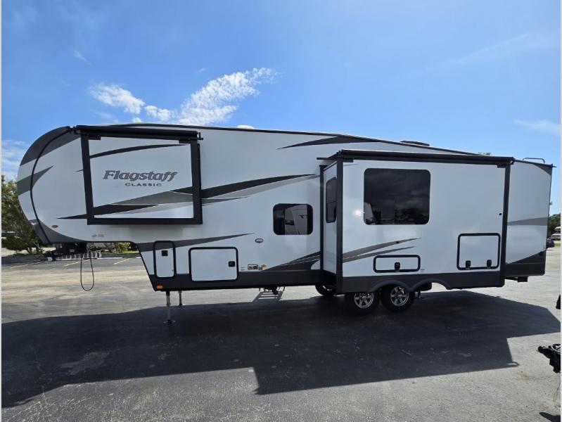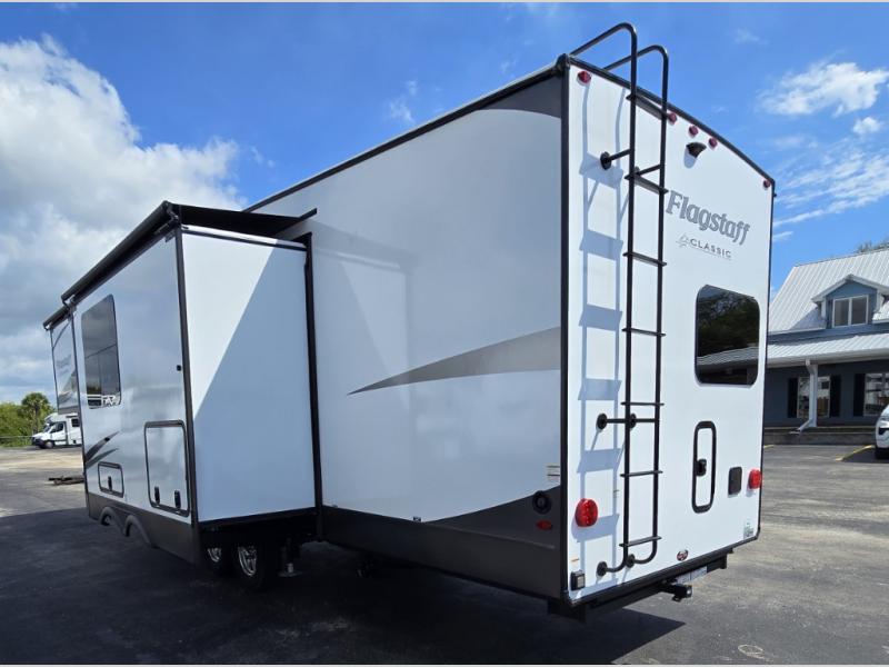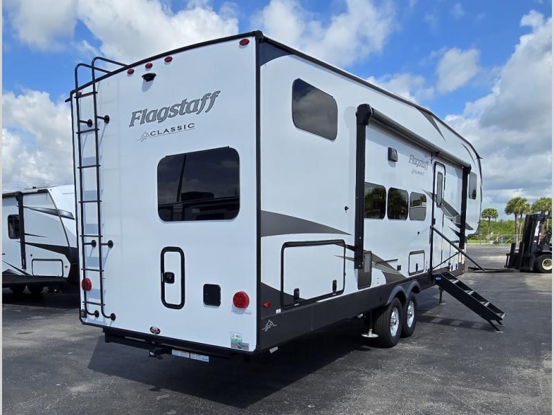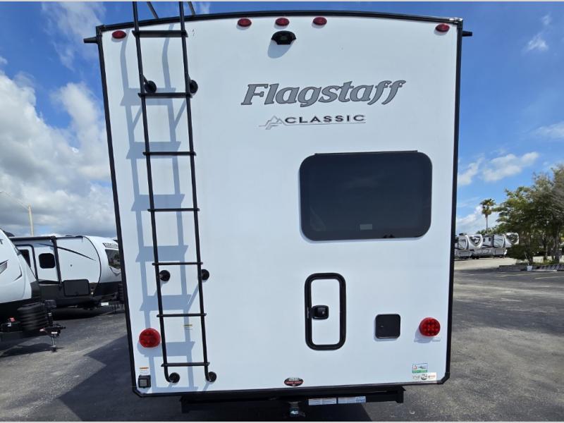 Each one of these Forest River Flagstaff Classic fifth wheels or travel trailers will be your home on wheels! Their quality craftsmanship and attention to detail shines through the surface-coated steel I-beam frame on fifth wheels, the enclosed underbelly, the radius roof with vaulted interior ceilings, and six-sided fully aluminum-framed floor, walls, and roof. Towing your unit will be easy with the torsion axle, Rubber-Ryde suspension, and nitrogen-filled Goodyear Endurance tires. You will even reduce your use of water with the Showermiser water saving system in the bathroom. A few other convenient features you will enjoy include a control panel with WeRV app control, designer headboard and bedding, and an outside hot and cold water port. Come choose your favorite one today!