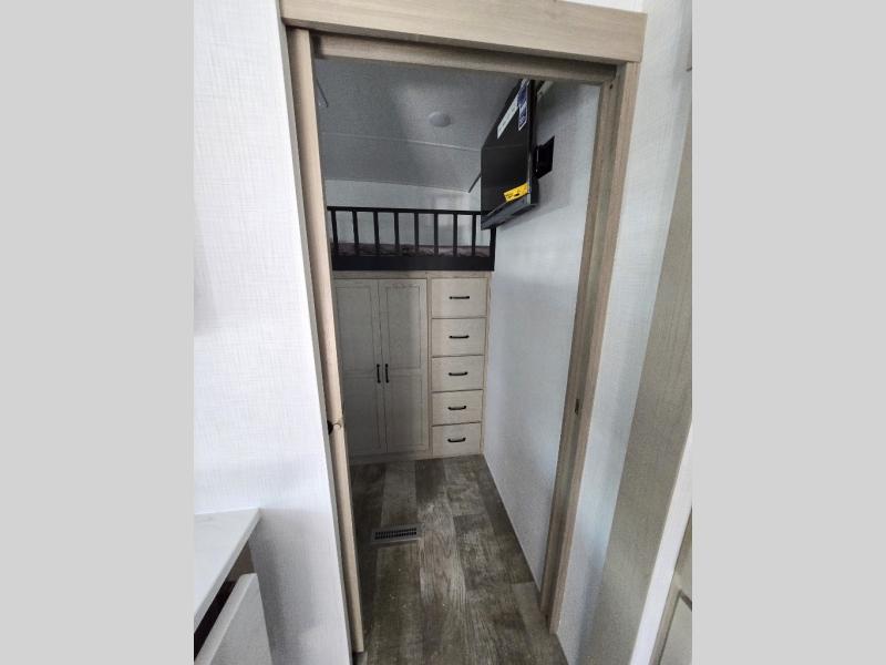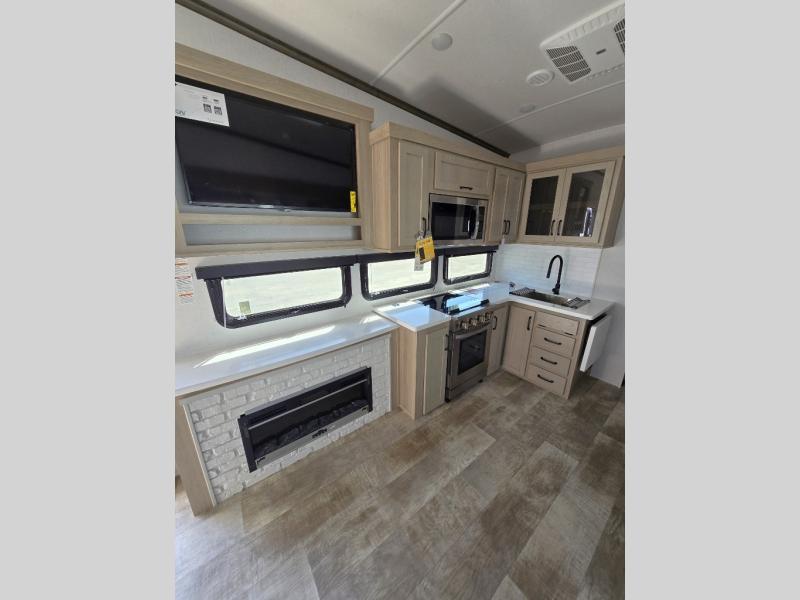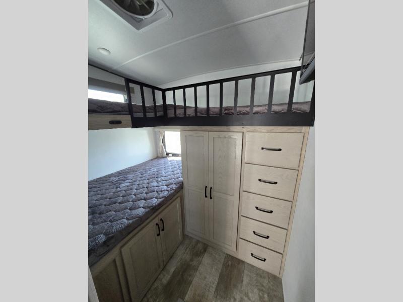 If you have a larger family or friend group this fifth wheel will allow you to bring everyone with sleeping space for ten or eleven campers. The kids or your guests will have privacy in the rear bunkhouse which offers a single 32" top bunk, and a set of 42" x 72" bunks, plus storage and a TV option. There is even a space prepped for a washer/dryer option if you like to keep everyone clean while camping. You will have privacy on the opposite side of the RV in the front bedroom which offers a queen bed, a dresser, and a slide out wardrobe that stretchers into the double entry bathroom which creates linen storage. And don't forget about all the kitchen amenities and the living area furniture which includes a hide-a-bed sofa and a king U-shaped dinette, Smart TV and fireplace. Outside, you will find pass-through storage, a 20' awning creating an outdoor living space, plus an outside kitchen and griddle giving the cook more choices when making meals for everyone.