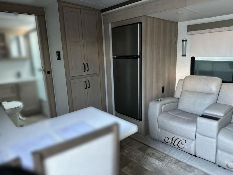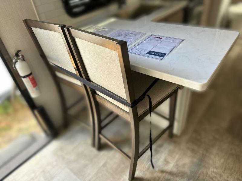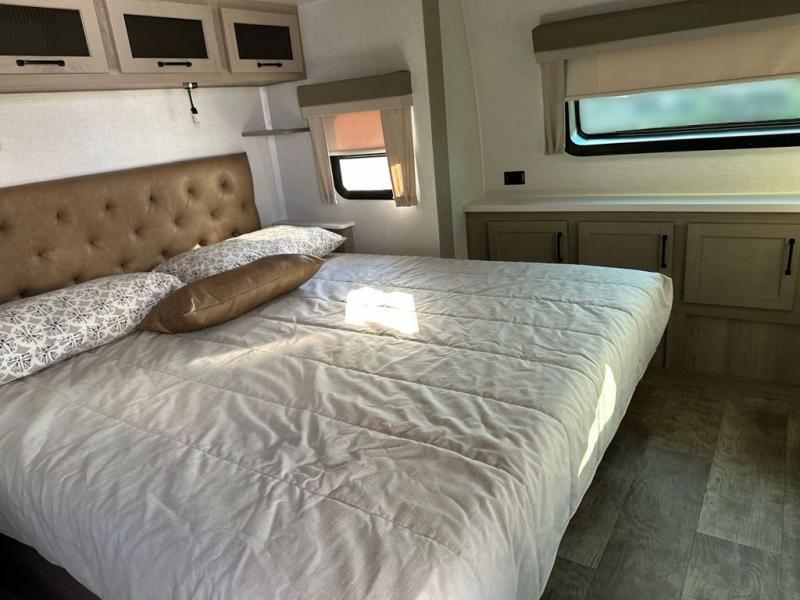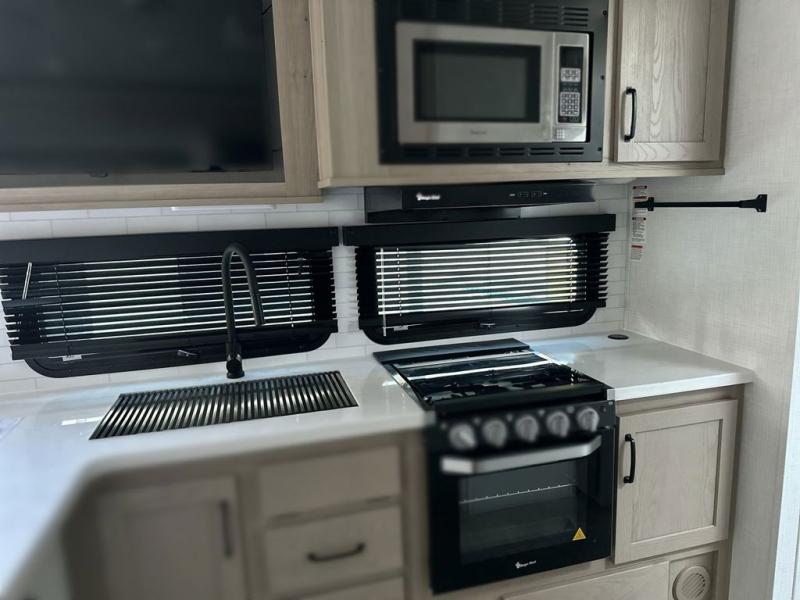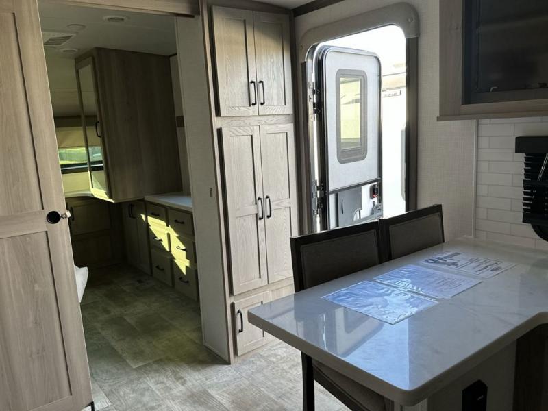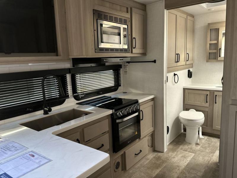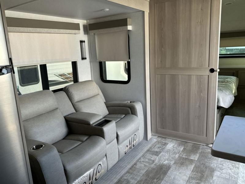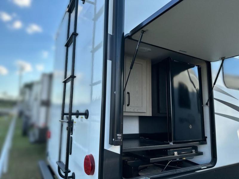 A perfect couples coach to get away featuring dual slides for added interior space. The main entry leads into a combined kitchen and living room providing an L-shaped counter with two-person bar top seating! This is a great place to enjoy your meals and morning coffee inside. Your nights will be spent in true relaxation with the 67" theater seating to watch TV, and a king bed slide in the front bedroom for a great night's rest. The full rear bathroom features a shower with a seat plus overhead skylight, and linen storage. You can also choose to cook outdoors when you have an outside kitchen and griddle, plus a 22' awning. This creates a nice outdoor living area that is perfect both day and night!