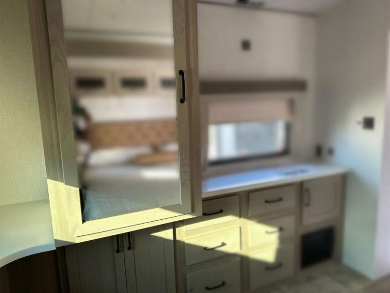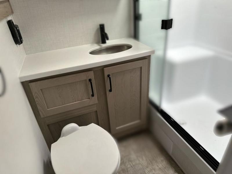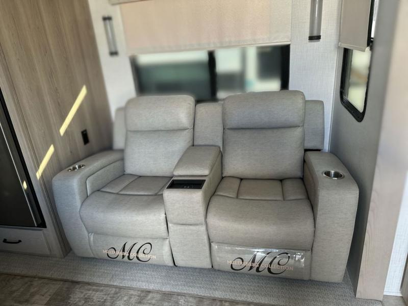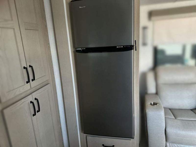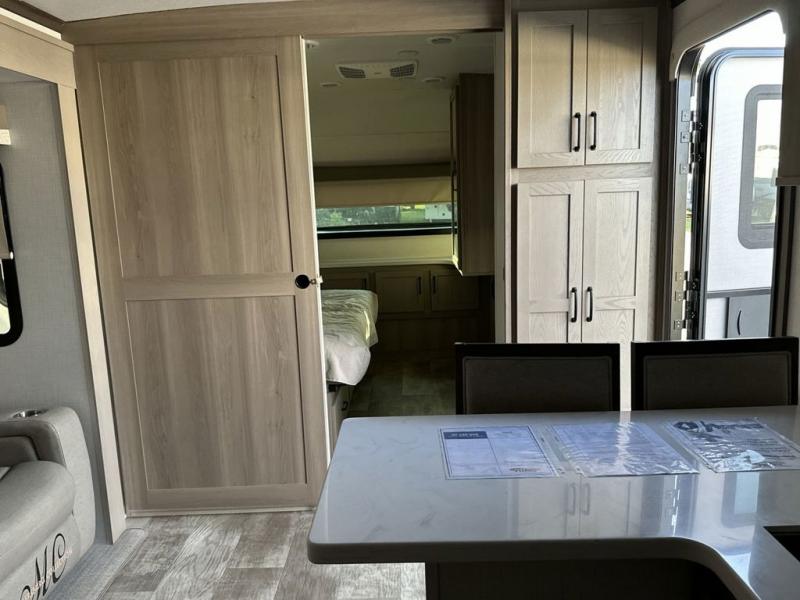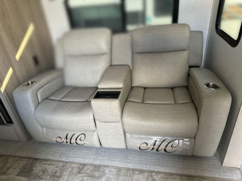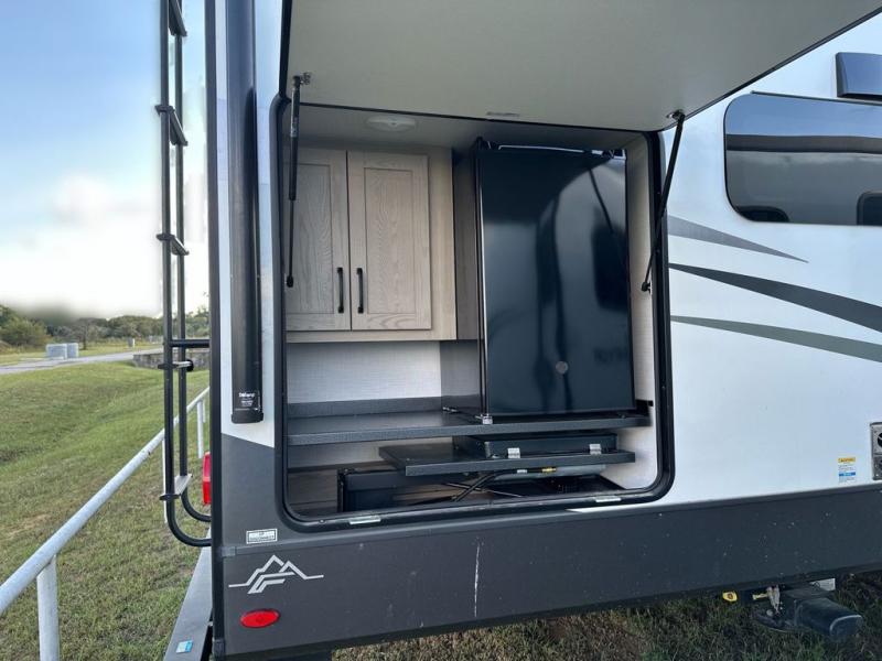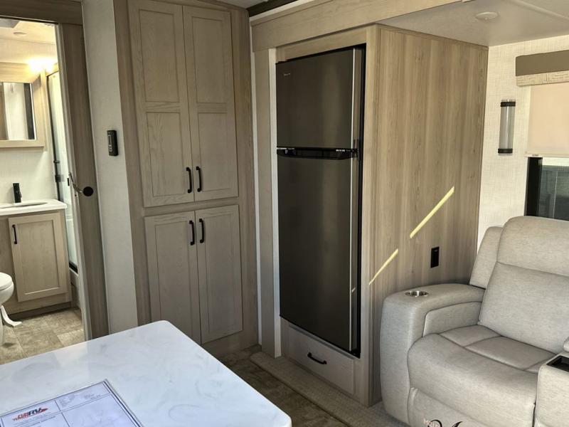 A perfect couples coach to get away featuring dual slides for added interior space. The main entry leads into a combined kitchen and living room providing an L-shaped counter with two-person bar top seating! This is a great place to enjoy your meals and morning coffee inside. Your nights will be spent in true relaxation with the 67" theater seating to watch TV, and a king bed slide in the front bedroom for a great night's rest. The full rear bathroom features a shower with a seat plus overhead skylight, and linen storage. You can also choose to cook outdoors when you have an outside kitchen and griddle, plus a 22' awning. This creates a nice outdoor living area that is perfect both day and night!