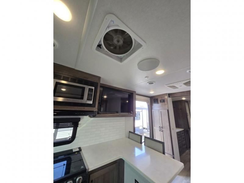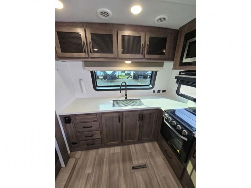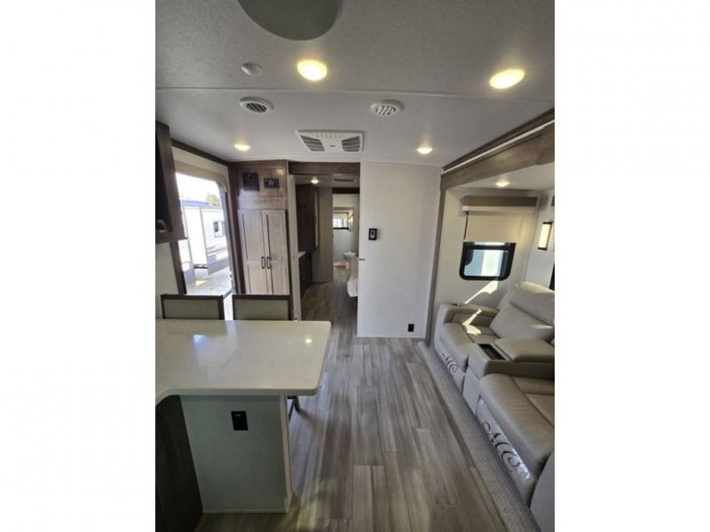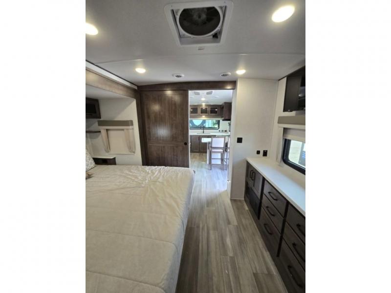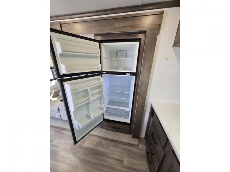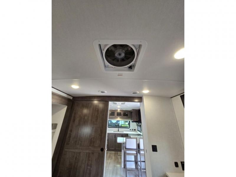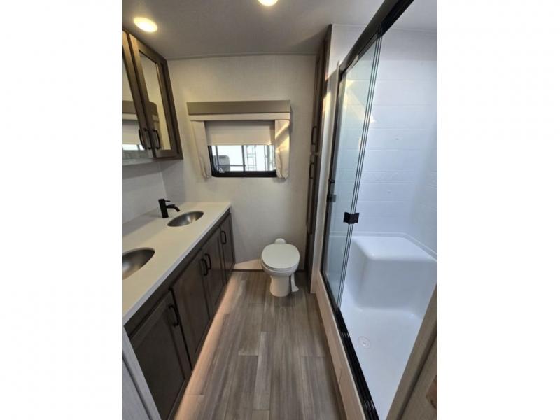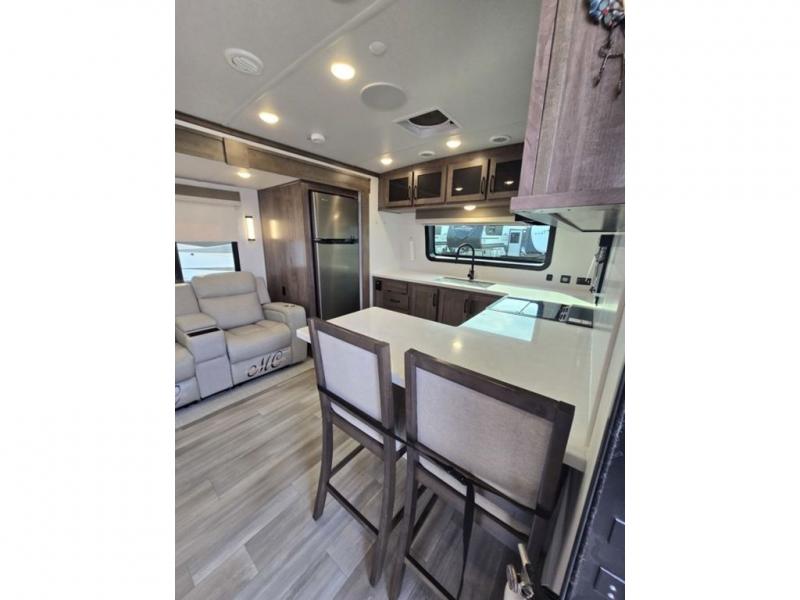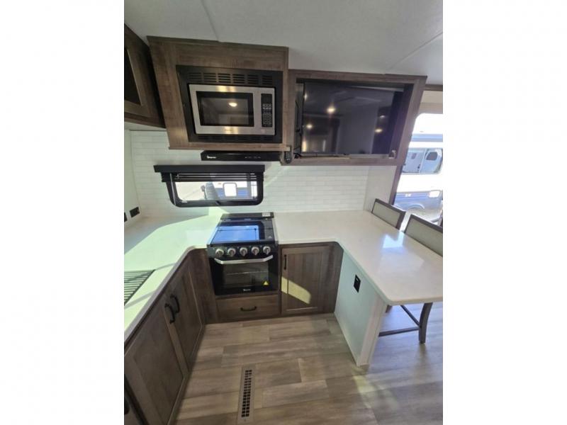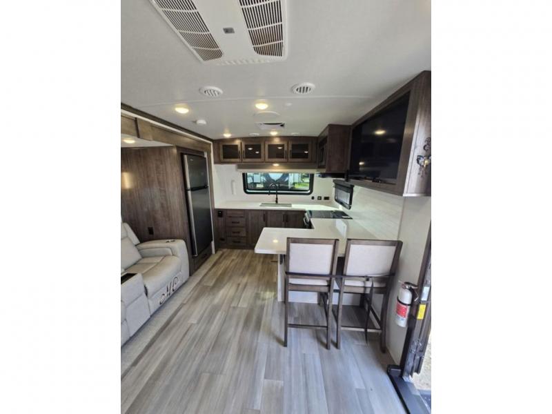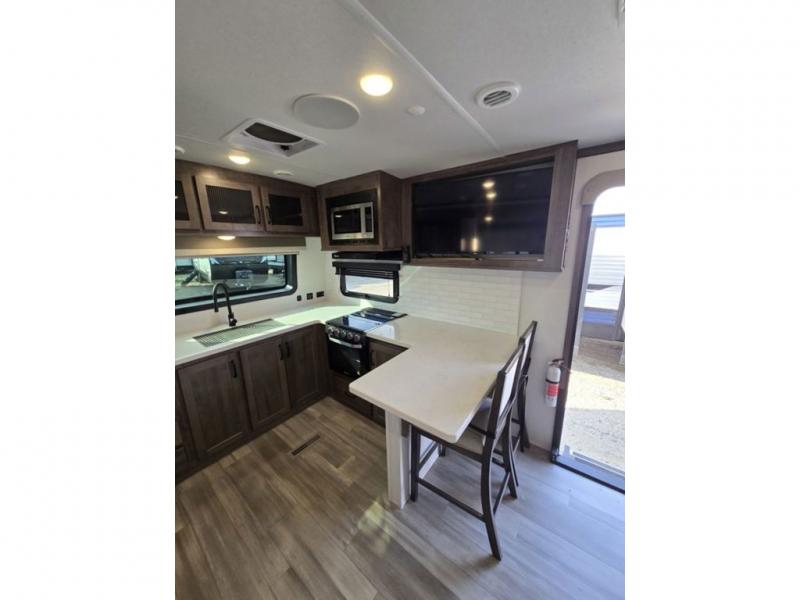 You will love how open this travel trailer will feel with the large front window that you can look out from the two-person bar top seating! The front kitchen has plenty of countertop space for you to prepare your best meals. Your nights will be spent in true relaxation with a 67" theater seating and king bed slide in the bedroom for a great night's rest. The full rear bathroom has a shower with a seat to take a nice, hot shower before bed, and a dual-sink vanity for two to get ready at once in the mornings!