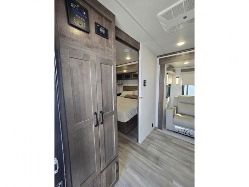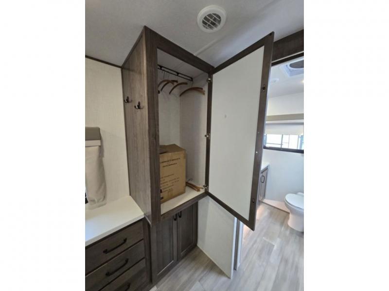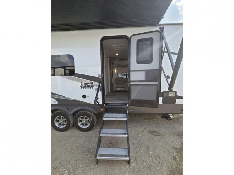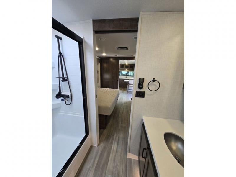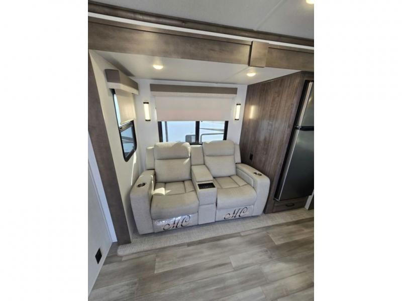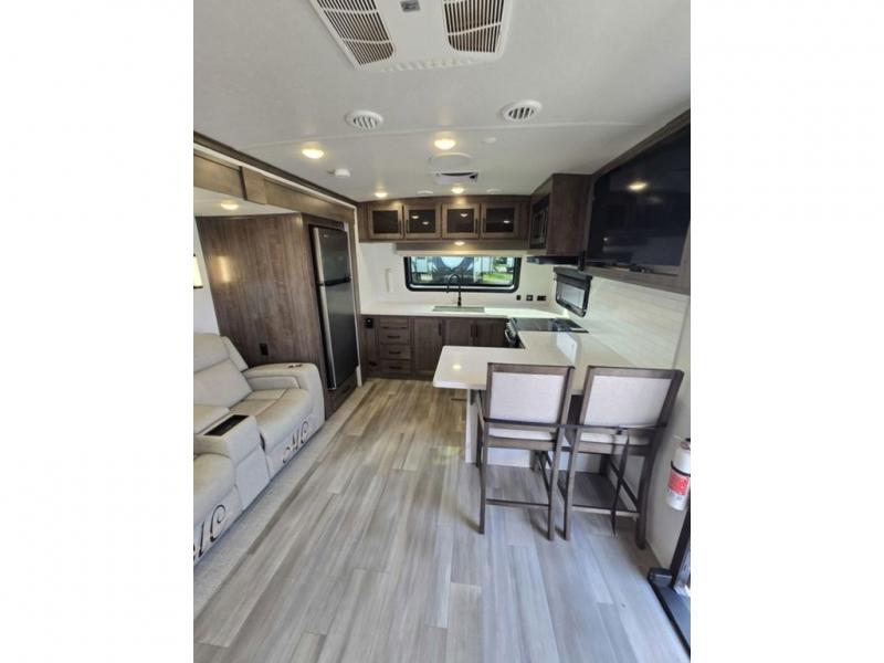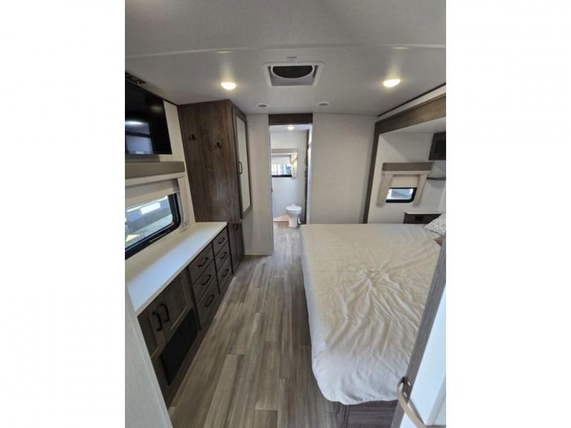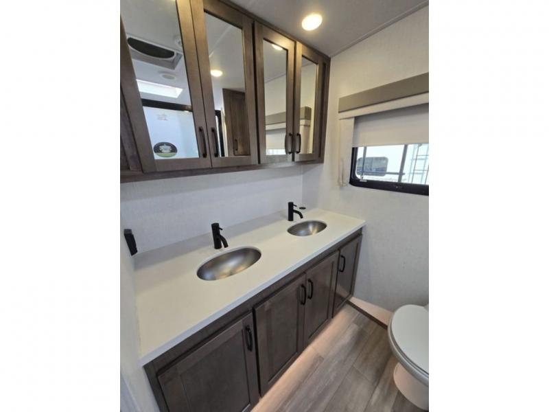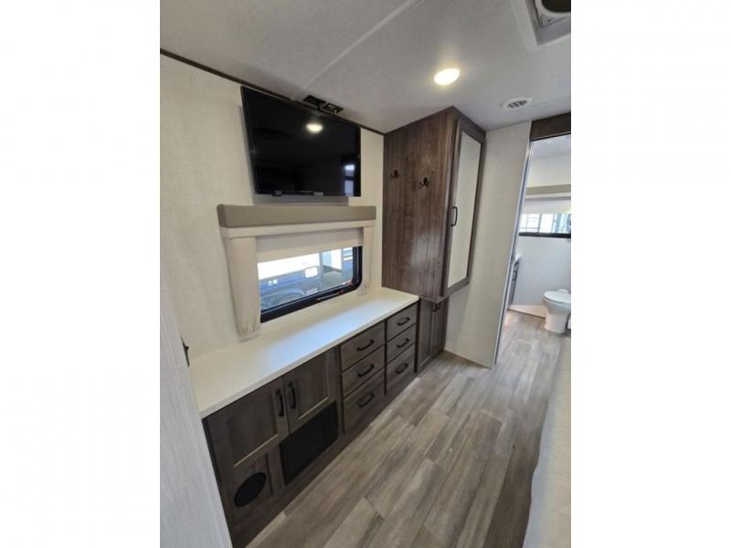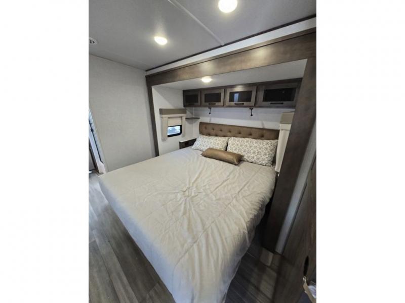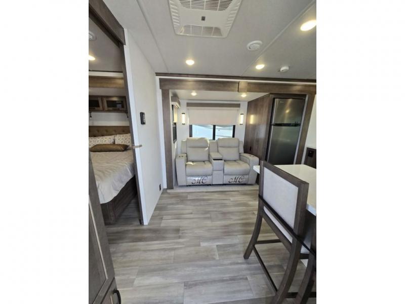 You will love how open this travel trailer will feel with the large front window that you can look out from the two-person bar top seating! The front kitchen has plenty of countertop space for you to prepare your best meals. Your nights will be spent in true relaxation with a 67" theater seating and king bed slide in the bedroom for a great night's rest. The full rear bathroom has a shower with a seat to take a nice, hot shower before bed, and a dual-sink vanity for two to get ready at once in the mornings!