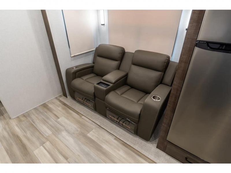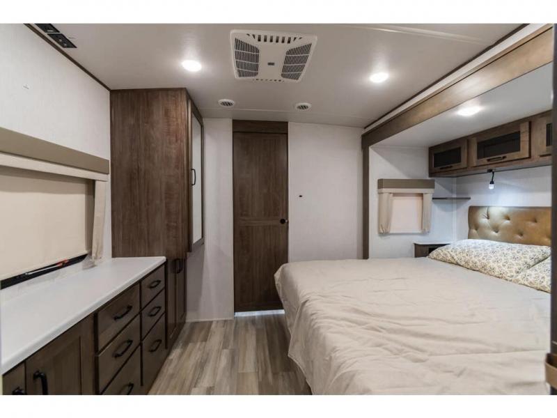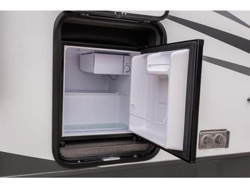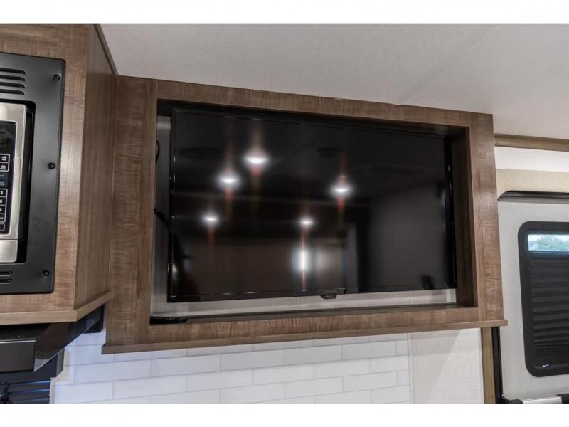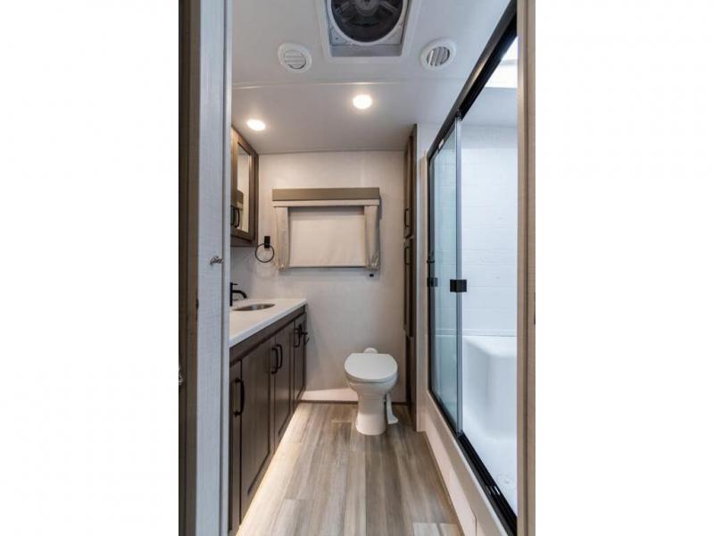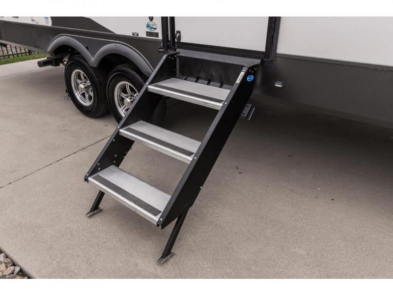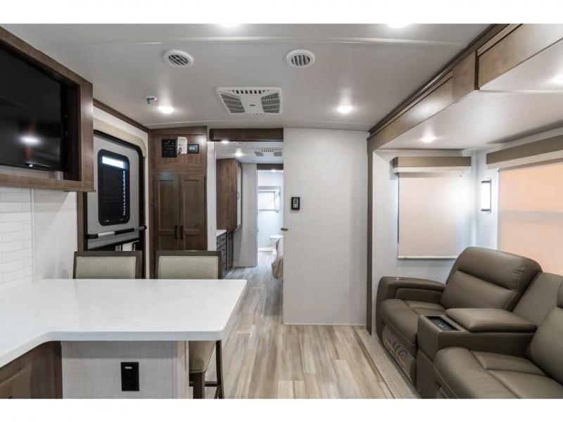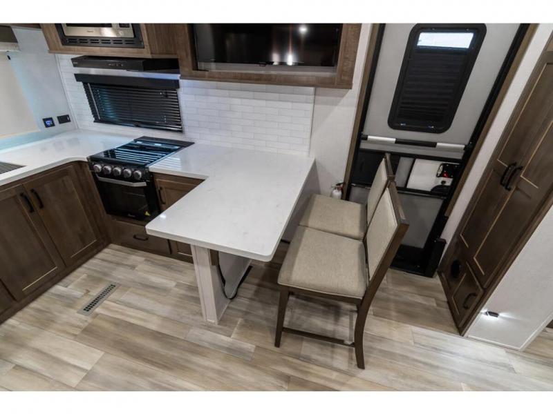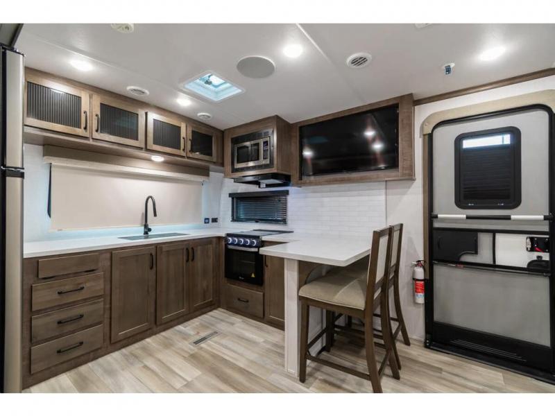 You will love how open this travel trailer will feel with the large front window that you can look out from the two-person bar top seating! The front kitchen has plenty of countertop space for you to prepare your best meals. Your nights will be spent in true relaxation with a 67" theater seating and king bed slide in the bedroom for a great night's rest. The full rear bathroom has a shower with a seat to take a nice, hot shower before bed, and a dual-sink vanity for two to get ready at once in the mornings!