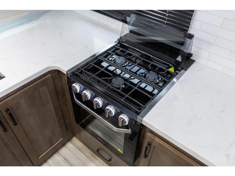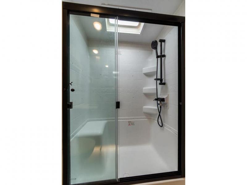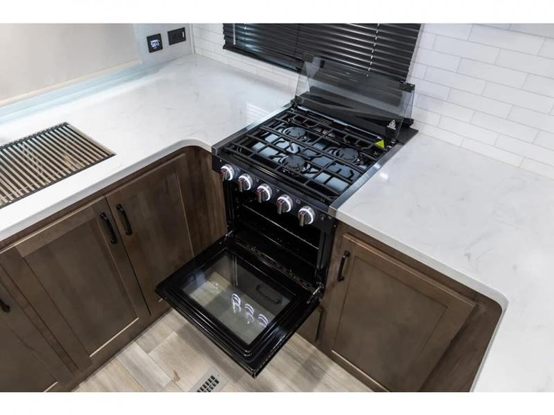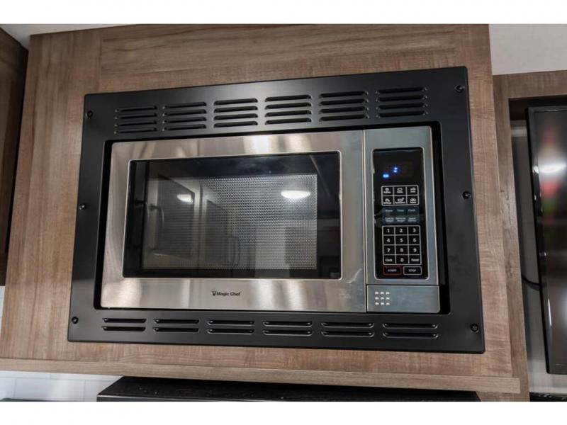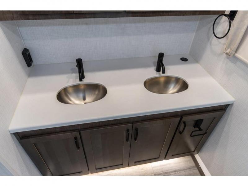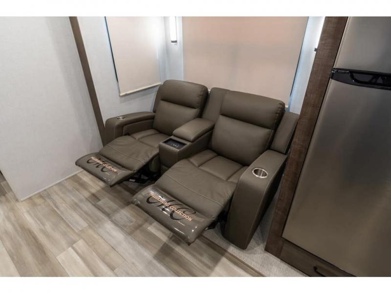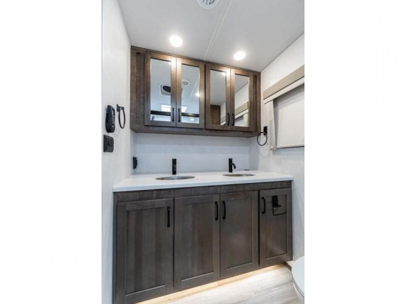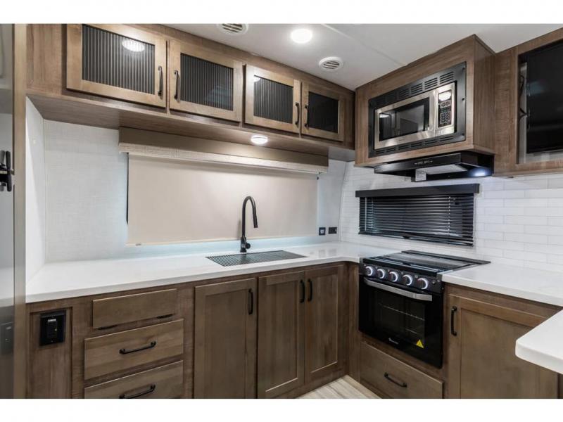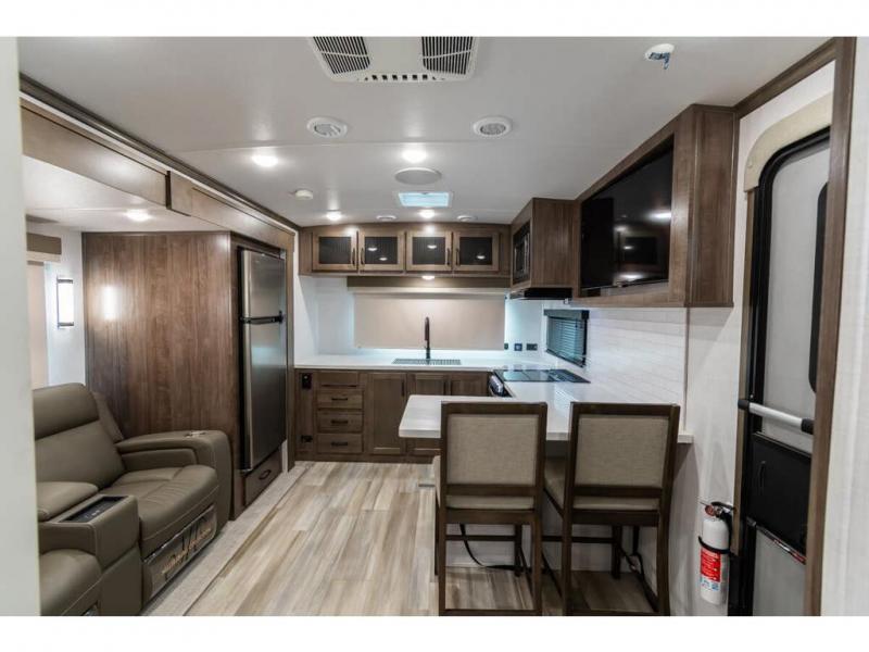 You will love how open this travel trailer will feel with the large front window that you can look out from the two-person bar top seating! The front kitchen has plenty of countertop space for you to prepare your best meals. Your nights will be spent in true relaxation with a 67" theater seating and king bed slide in the bedroom for a great night's rest. The full rear bathroom has a shower with a seat to take a nice, hot shower before bed, and a dual-sink vanity for two to get ready at once in the mornings!