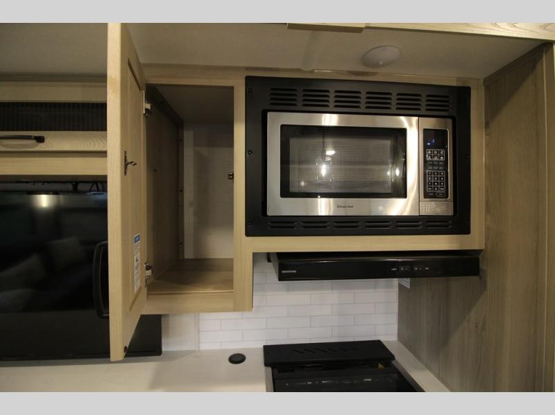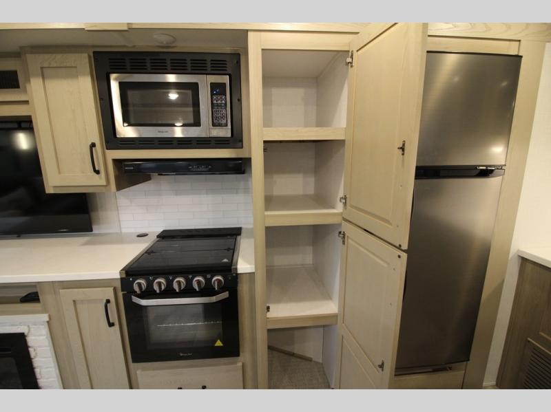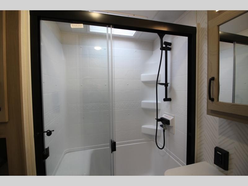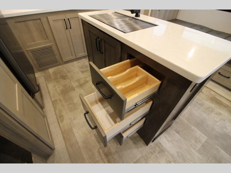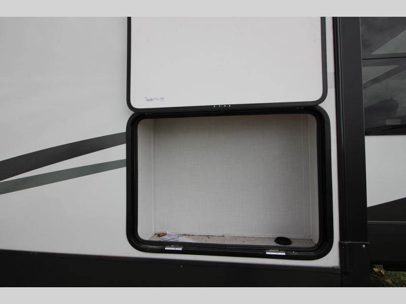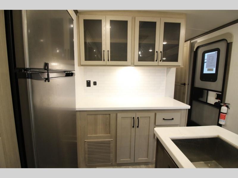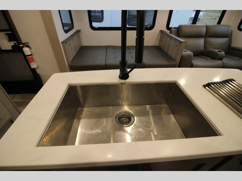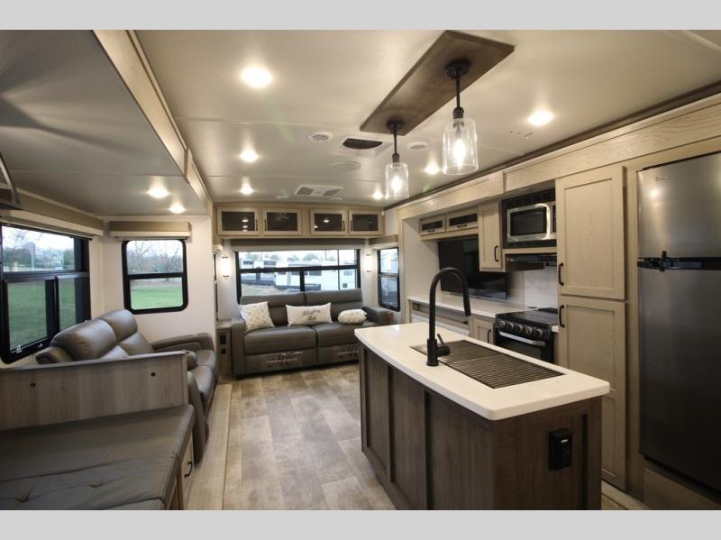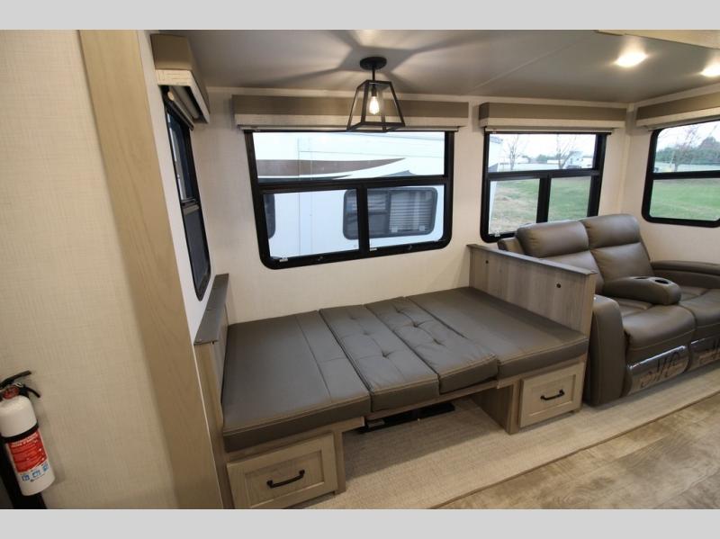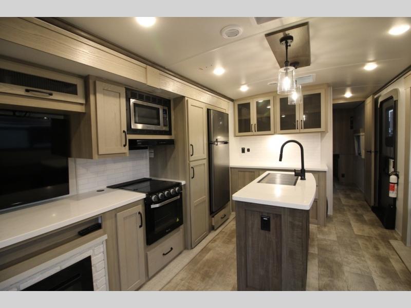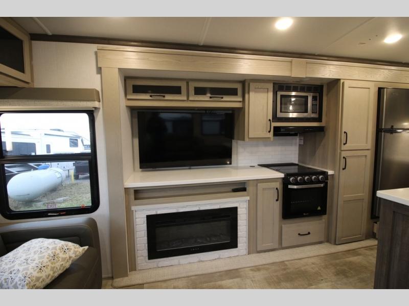 The large windows in the rear and door side slide will bring nature's scenery indoors with this travel trailer! Everyone can relax together in the rear living area featuring a 76" hide-a-bed sofa and 60" theater seating across from the entertainment center with a fireplace. Meal prepping will be even easier with the kitchen island, and the 39" booth dinette is a comfortable place to enjoy your meals. The full bathroom has a shower with a seat and a linen closet to keep your towels close. You will feel well rested each morning after sleeping on the king bed slide in the front private bedroom which also has a wardrobe with washer and dryer prep and an area to add an optional TV!