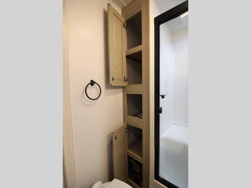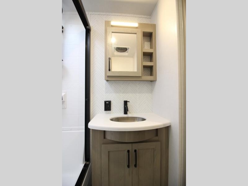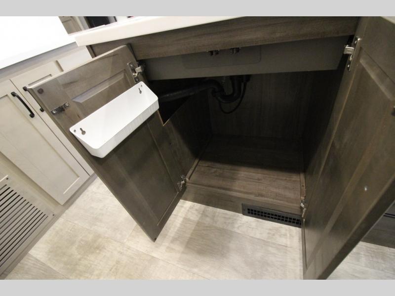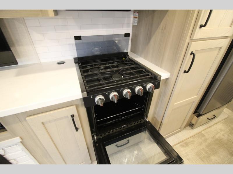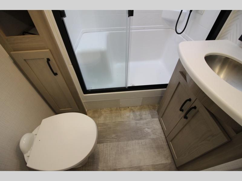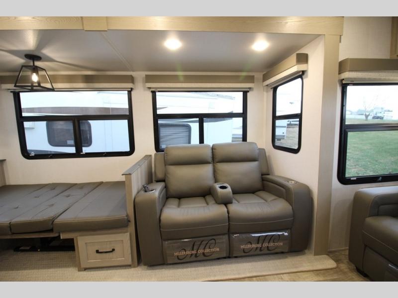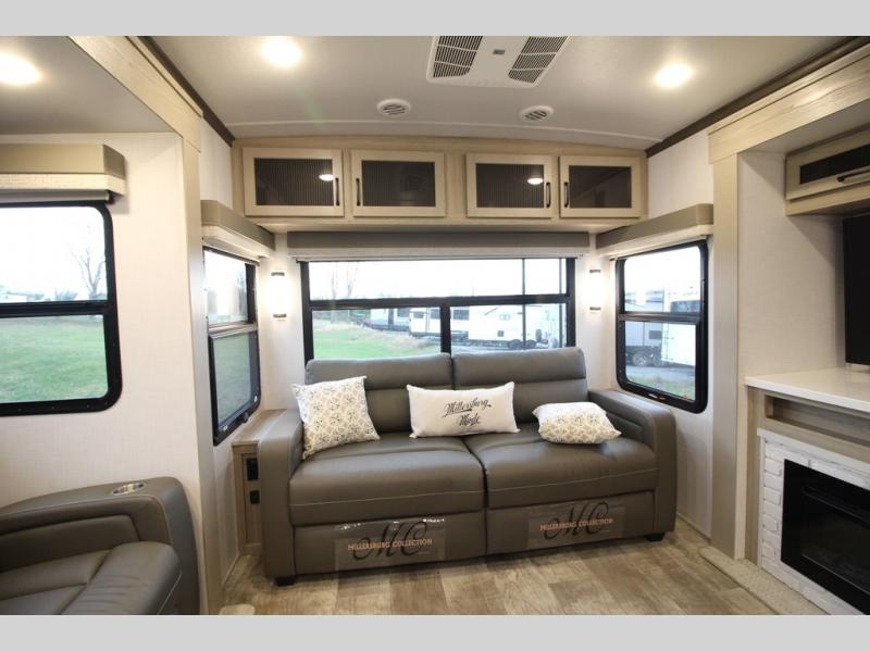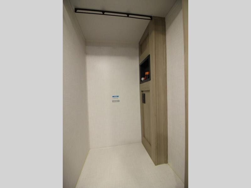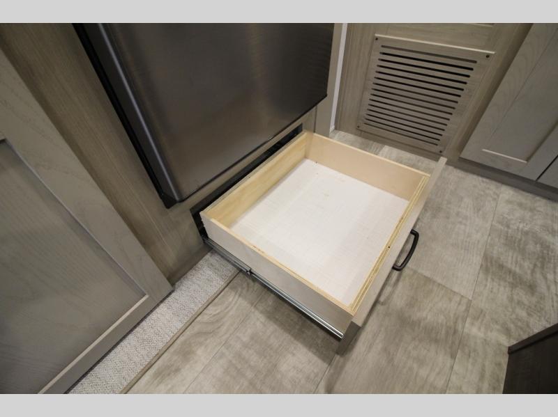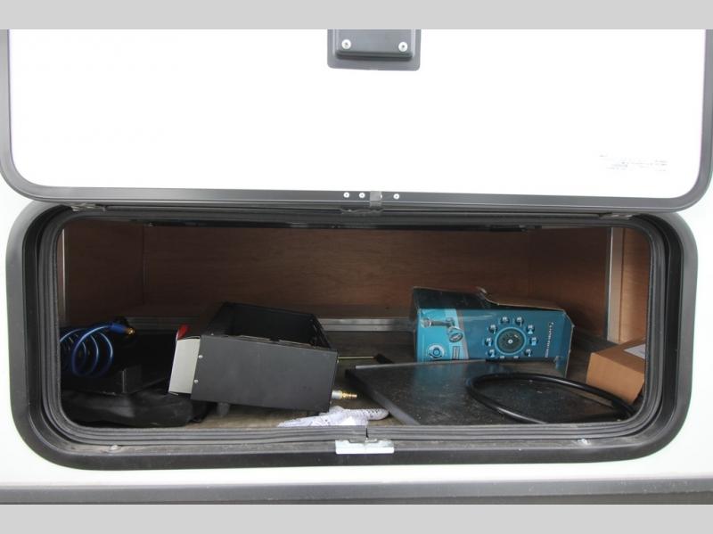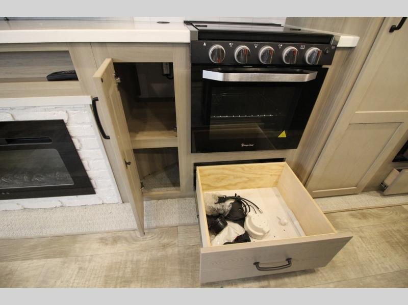 The large windows in the rear and door side slide will bring nature's scenery indoors with this travel trailer! Everyone can relax together in the rear living area featuring a 76" hide-a-bed sofa and 60" theater seating across from the entertainment center with a fireplace. Meal prepping will be even easier with the kitchen island, and the 39" booth dinette is a comfortable place to enjoy your meals. The full bathroom has a shower with a seat and a linen closet to keep your towels close. You will feel well rested each morning after sleeping on the king bed slide in the front private bedroom which also has a wardrobe with washer and dryer prep and an area to add an optional TV!