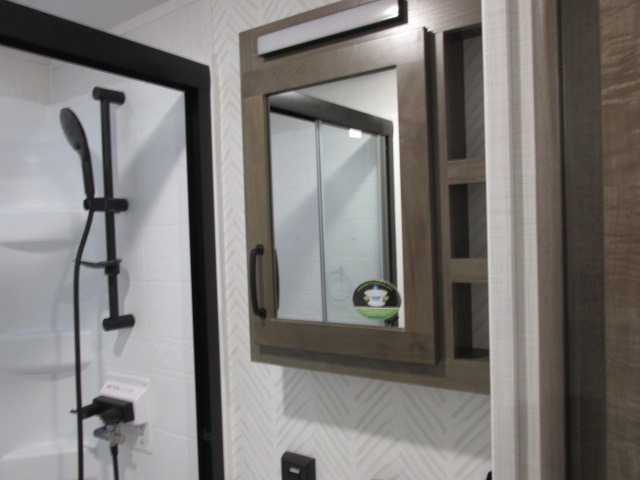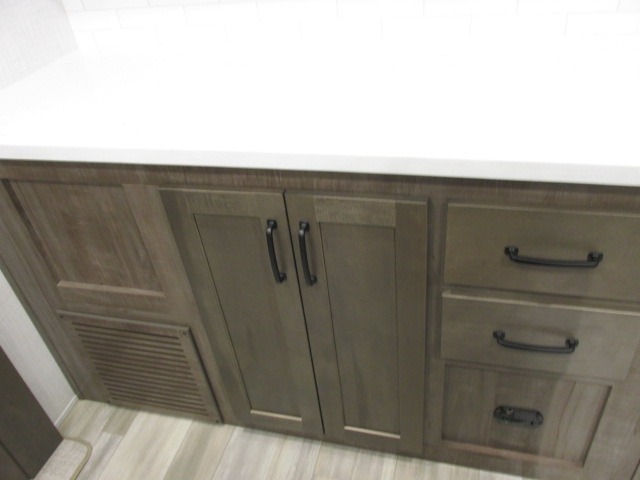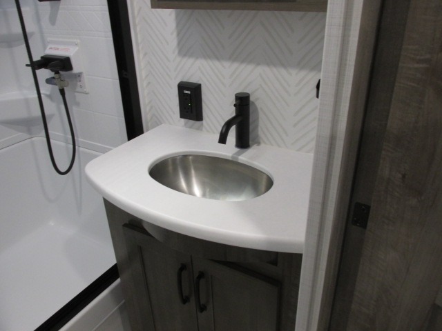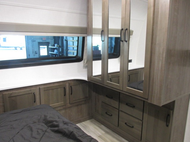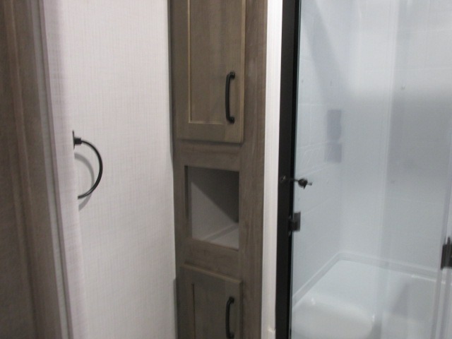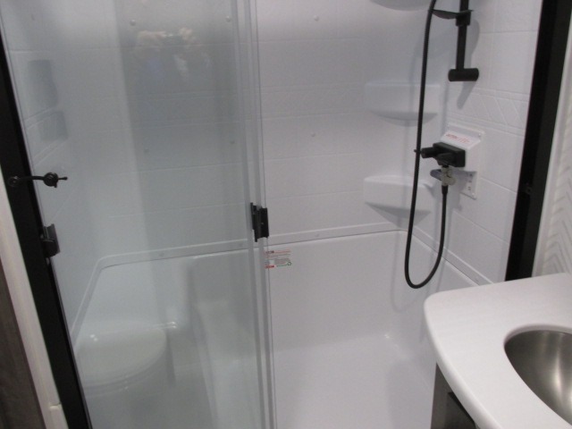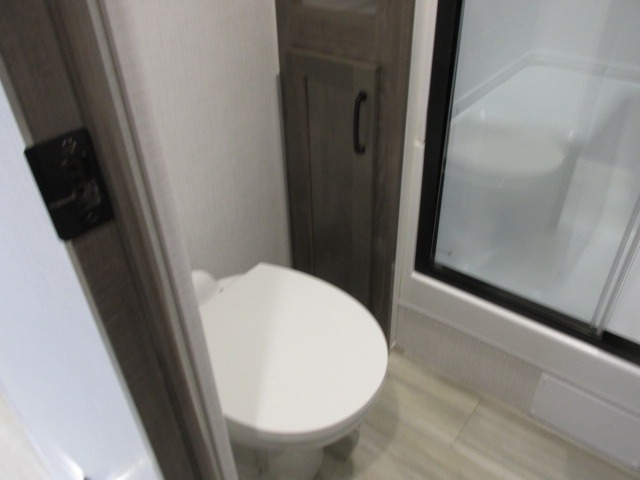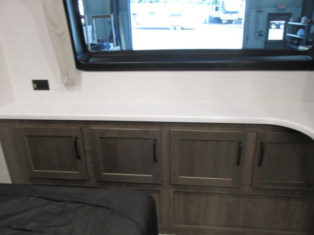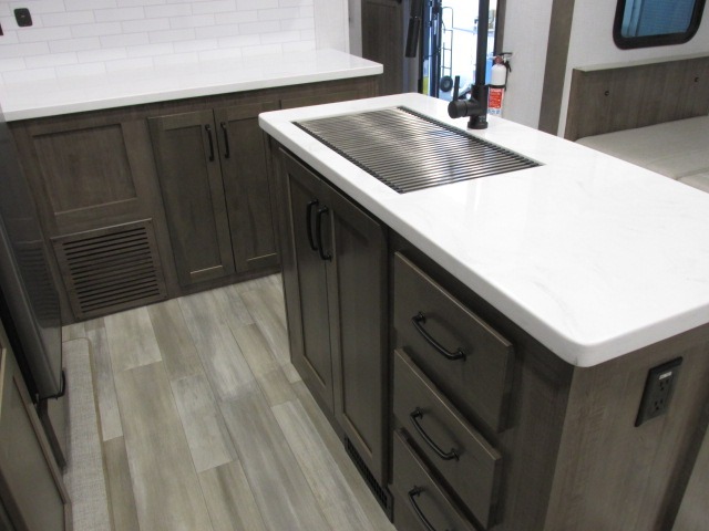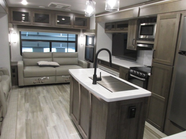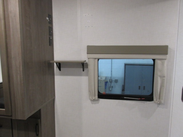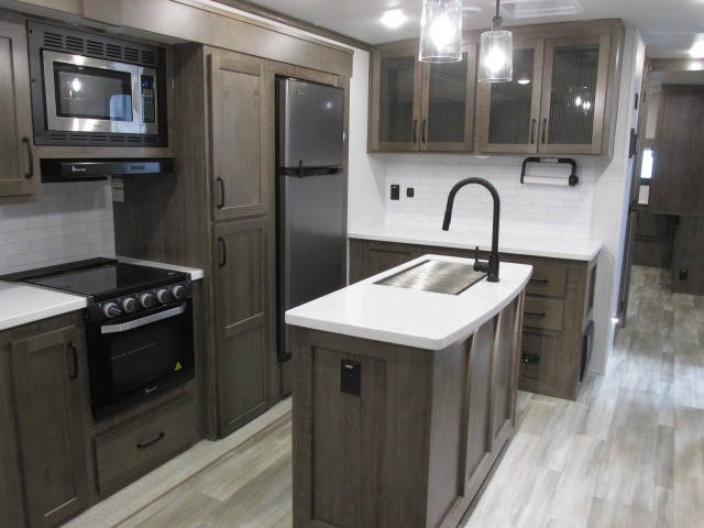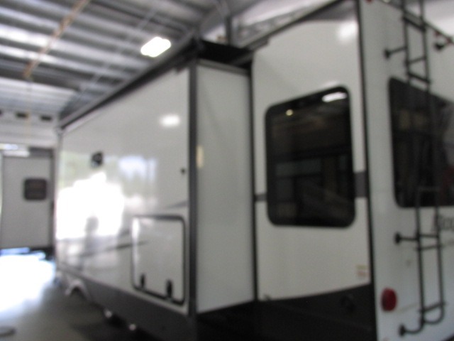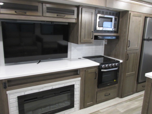 The large windows in the rear and door side slide will bring nature's scenery indoors with this travel trailer! Everyone can relax together in the rear living area featuring a 76" hide-a-bed sofa and 60" theater seating across from the entertainment center with a fireplace. Meal prepping will be even easier with the kitchen island, and the 39" booth dinette is a comfortable place to enjoy your meals. The full bathroom has a shower with a seat and a linen closet to keep your towels close. You will feel well rested each morning after sleeping on the king bed slide in the front private bedroom which also has a wardrobe with washer and dryer prep and an area to add an optional TV!