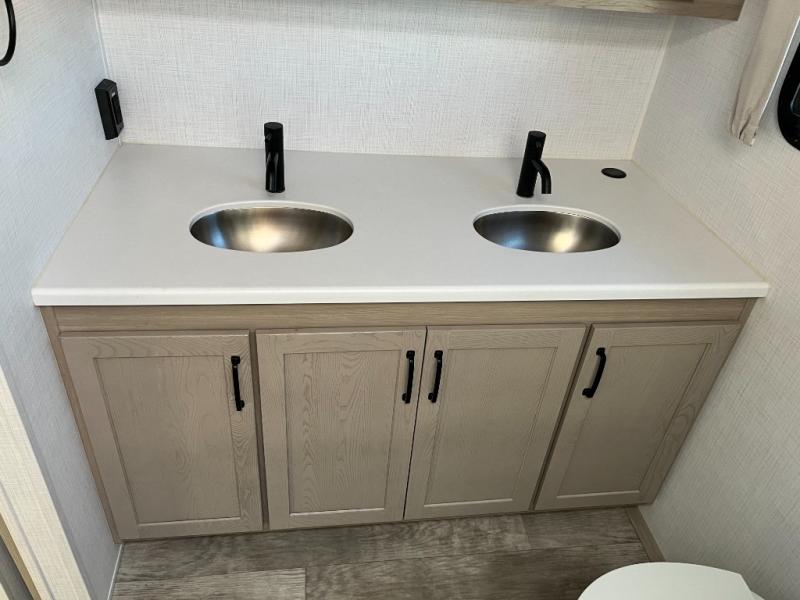 The bathroom in the 826MBR delivers everyday convenience with a roomy shower, vanity, and toilet. Designed for comfort and function, it provides privacy and ease — no running back and forth to campground facilities.