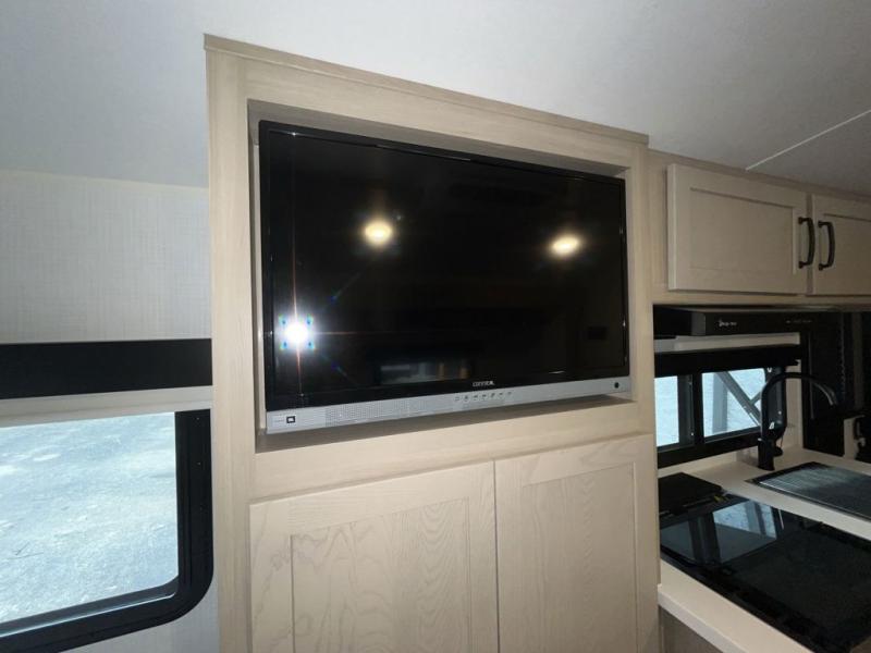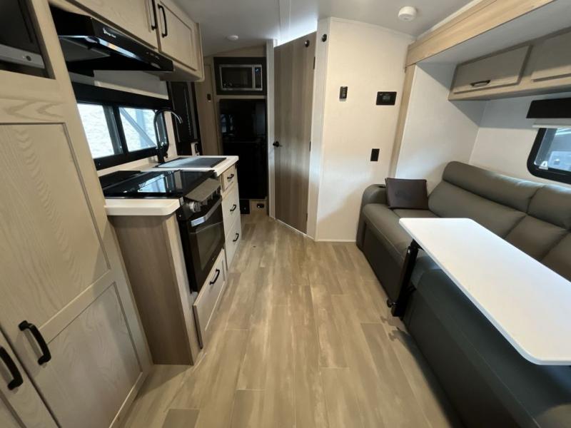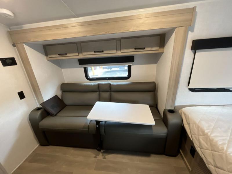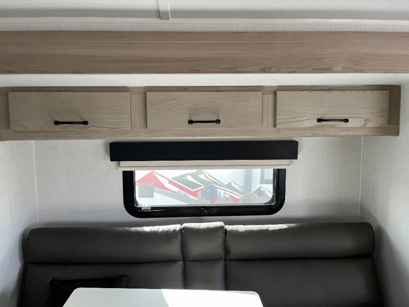 Step inside and you’ll find a bright, thoughtfully laid-out interior that maximizes every inch of space. Large windows bring in natural light and outdoor views, creating an open, airy atmosphere. The comfortable dinette provides the perfect place for meals, relaxing, or planning your next adventure, and easily converts into additional sleeping space when needed.