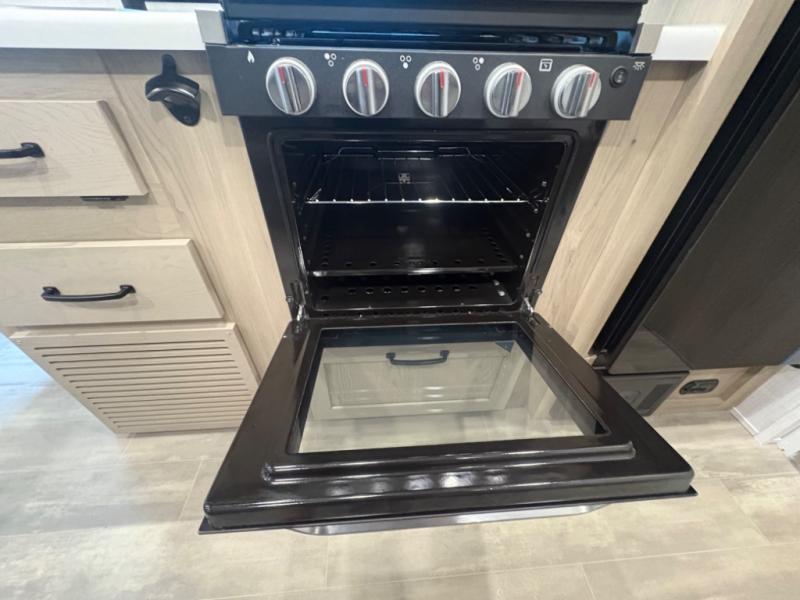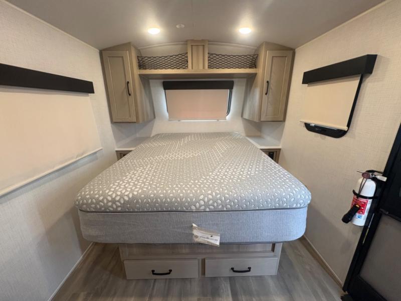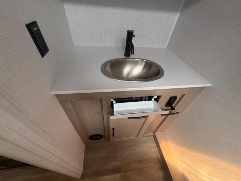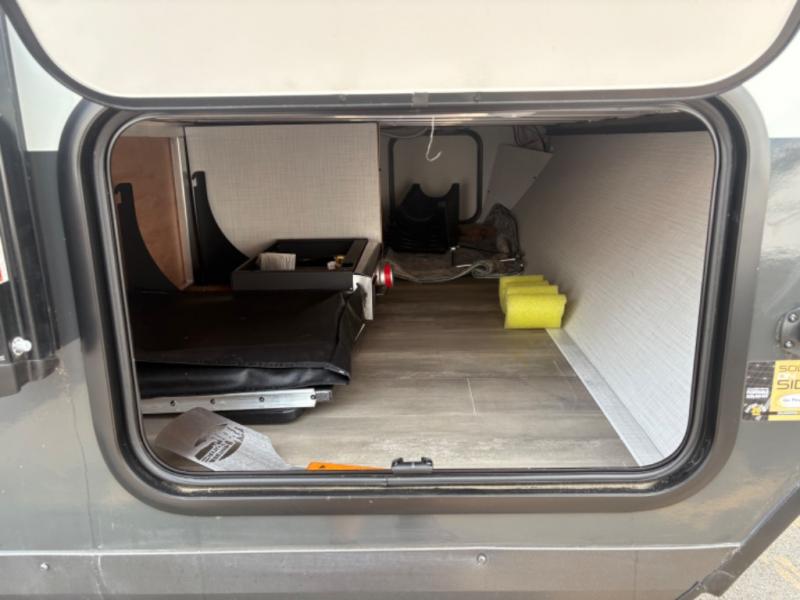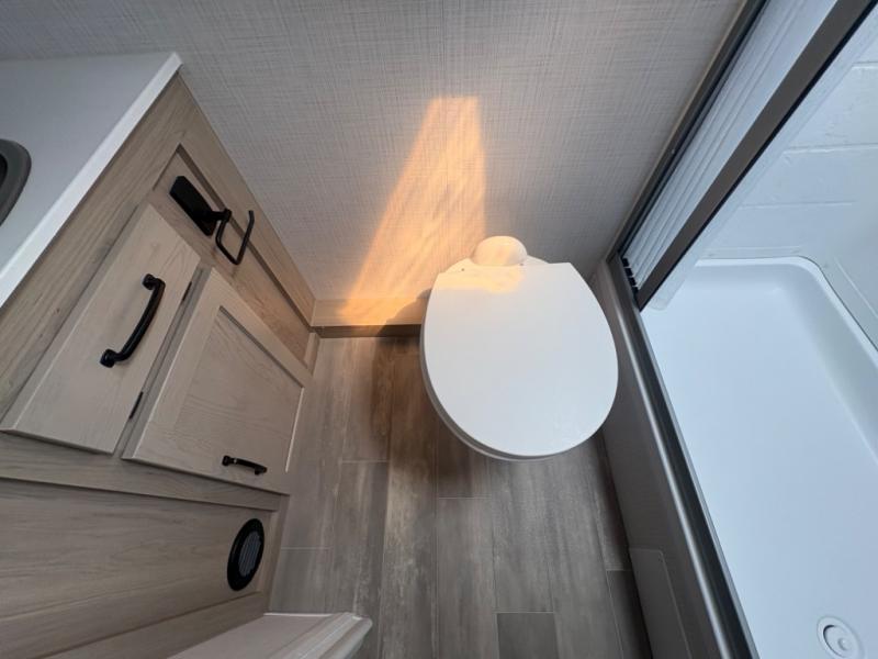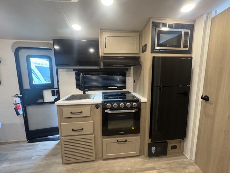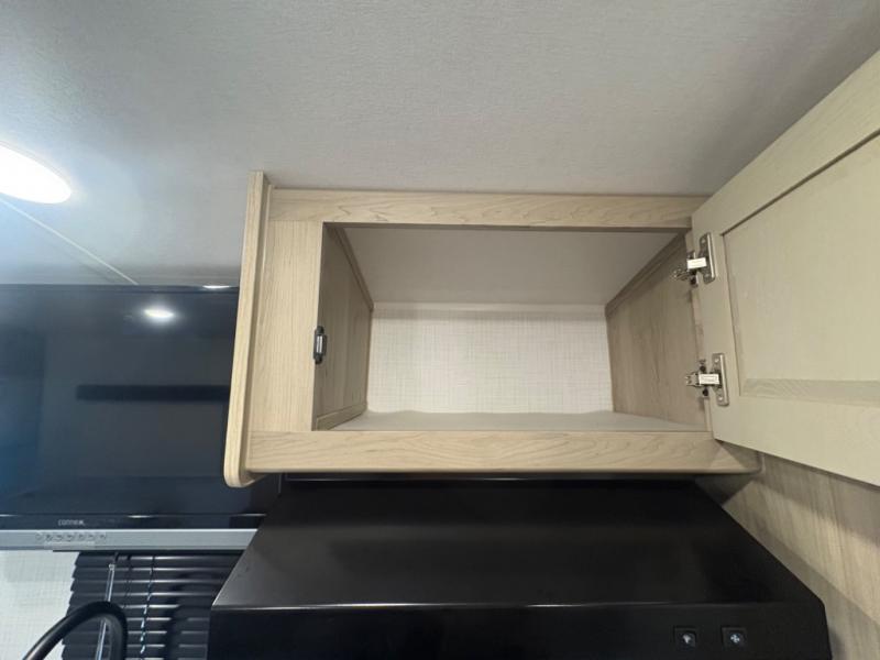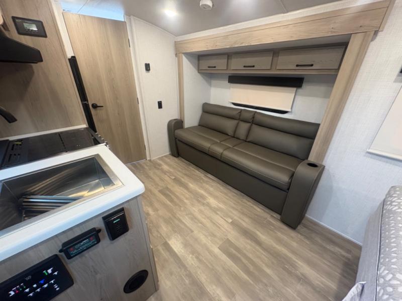 At just over 21 feet long and under 4,000 pounds (dry weight), this travel trailer is towable by many SUVs and smaller trucks, making it accessible for more travelers. The spacious rear bathroom offers a residential-style shower, vanity, and extra storage—perfect for keeping things organized on the road. The slide-out adds valuable living space, featuring a sofa with a table across from the entertainment center, creating a comfortable spot to dine, relax, or work remotely.