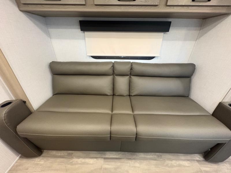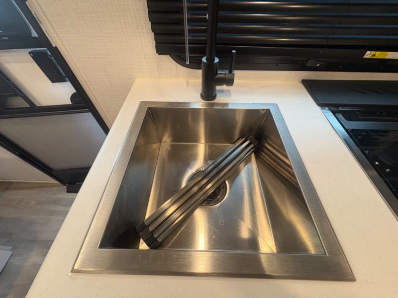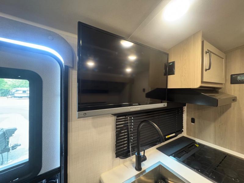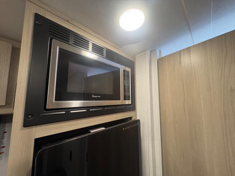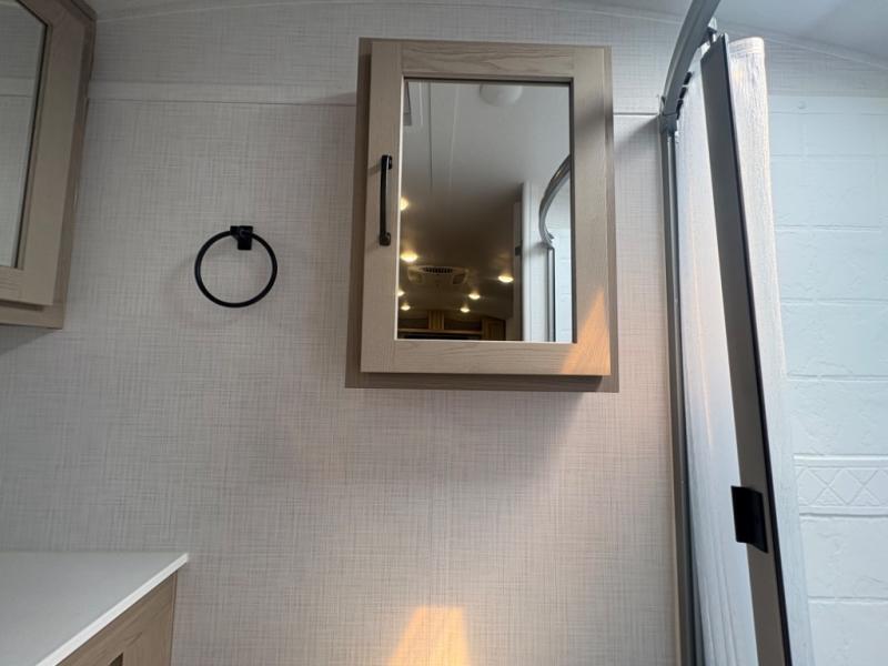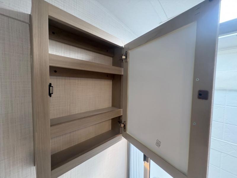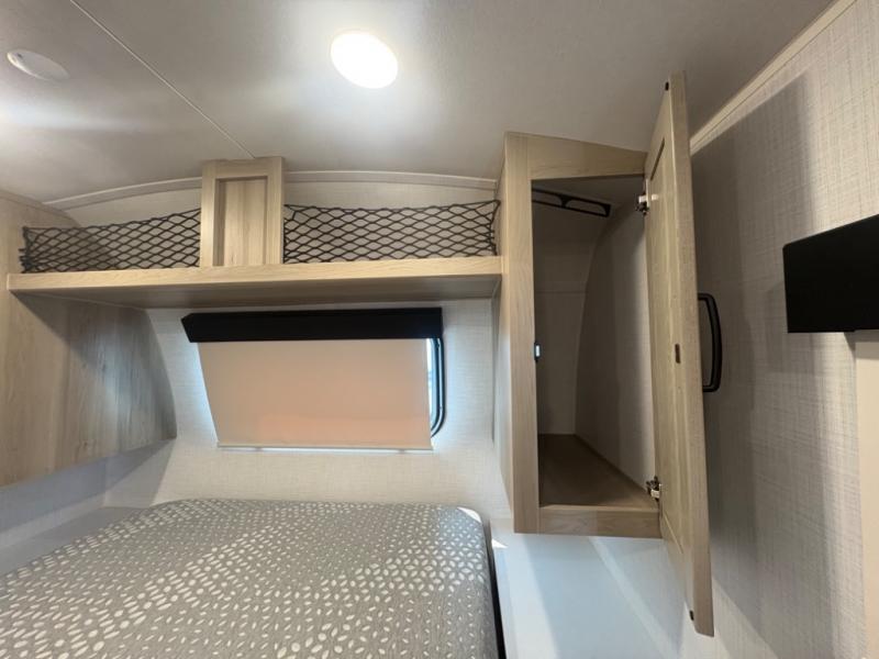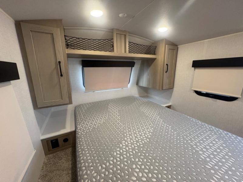 At just over 21 feet long and under 4,000 pounds (dry weight), this travel trailer is towable by many SUVs and smaller trucks, making it accessible for more travelers. The spacious rear bathroom offers a residential-style shower, vanity, and extra storage—perfect for keeping things organized on the road. The slide-out adds valuable living space, featuring a sofa with a table across from the entertainment center, creating a comfortable spot to dine, relax, or work remotely.