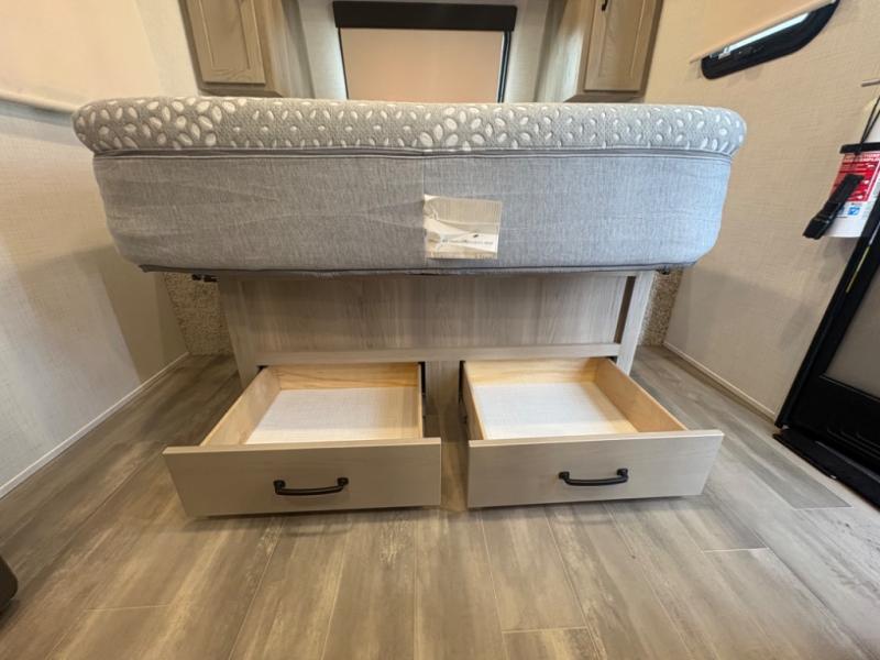The well-equipped kitchen includes a cooktop, microwave, refrigerator, and ample counter space, so you can prepare meals wherever your adventures take you. Up front, the queen bed with wardrobes on each side ensures restful nights, while the large windows bring in natural light and beautiful campground views. Built with Forest River’s attention to durability, the Flagstaff E-Pro includes laminated walls, high-quality insulation, and modern features like solar prep for off-grid capability.