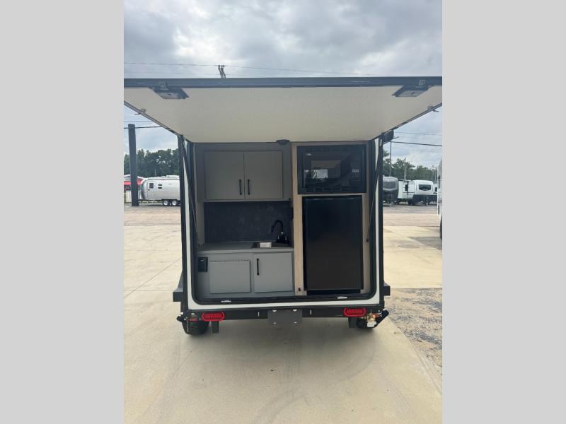 This travel trailer is perfect for those who enjoy the simplicity of tent camping, but also desire a sturdy roof over their head! The gaucho bed provides a comfortable place to lay your head at night. Your bellies can stay full with delicious home cooked meals prepared at the outside kitchen which has a sink for clean up, a carry out range and griddle for burgers, and refrigerator/microwave, plus overhead cabinets for your cooking essentials. There is storage inside between the wardrobe, the overhead cabinets, and a shelf!