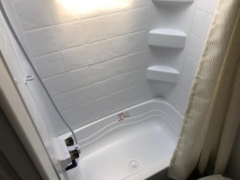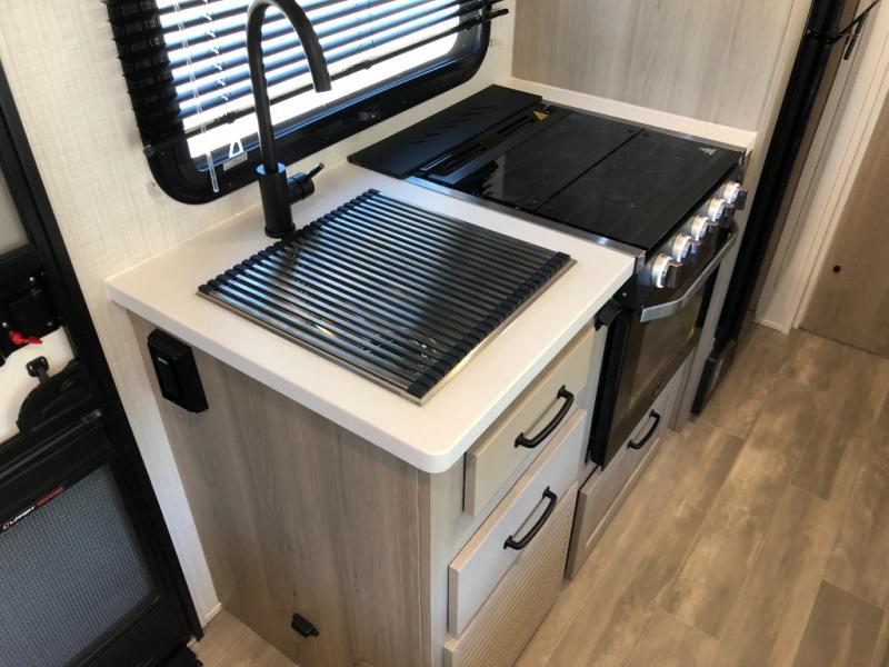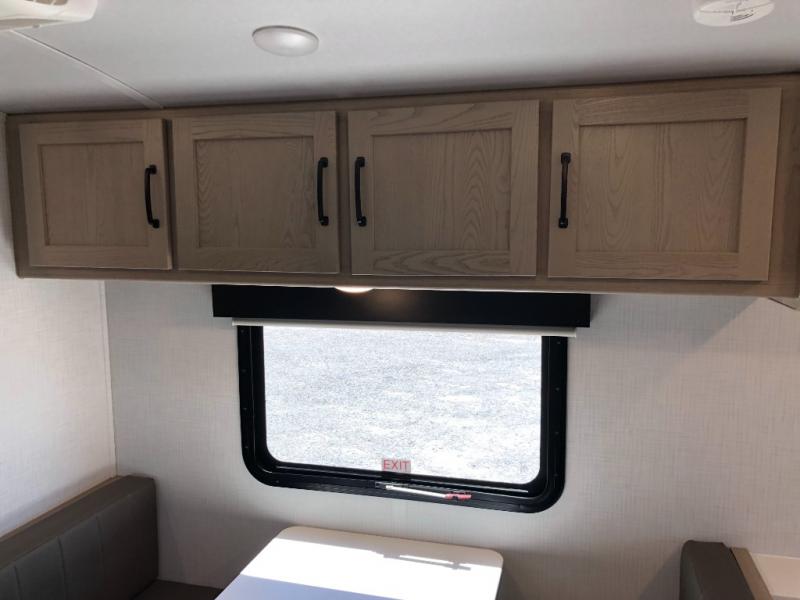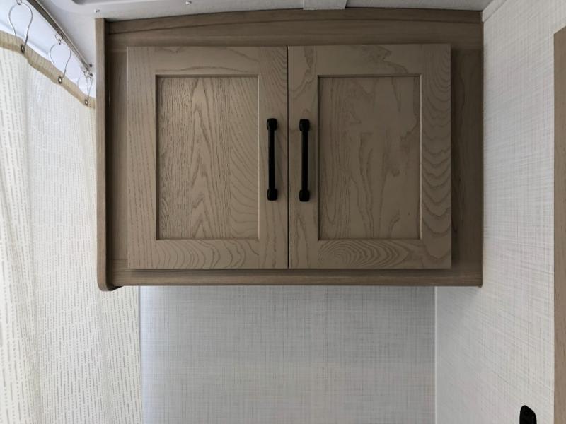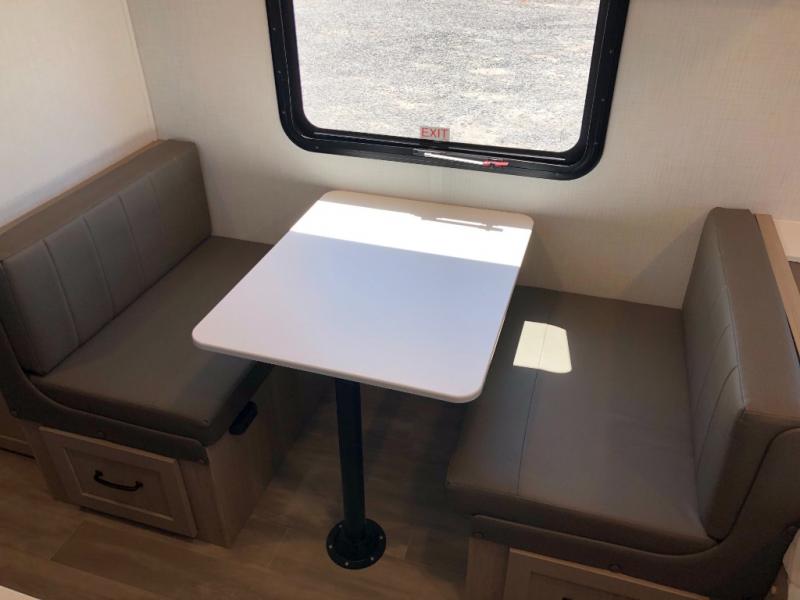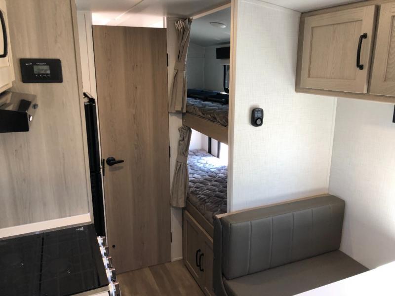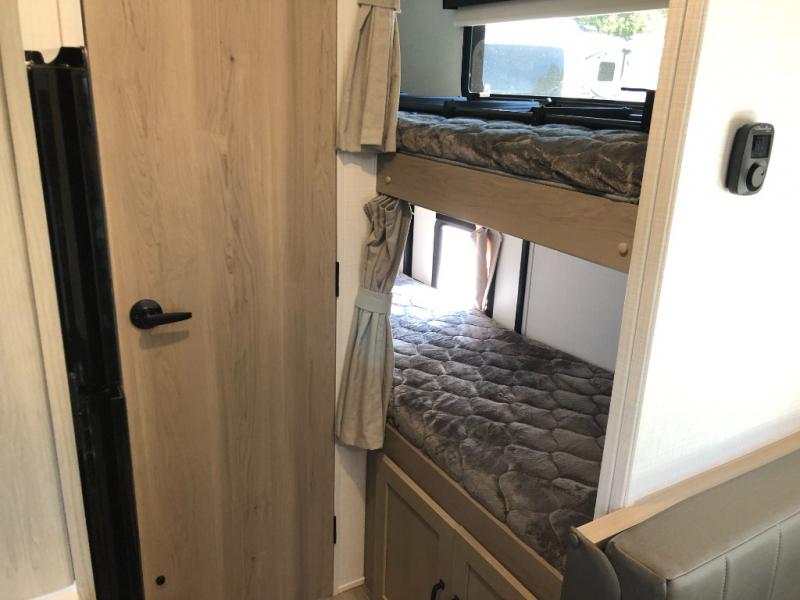 Enjoy moving from campground to campground easily in this trailer thanks to not having a slide out, you can hitch up and go when you are ready. Just don't forget to push the button to the 14' power awning. Your kids or friends will enjoy having their own bunk bed to sleep on while you have a full bed up front, and the 32" dinette sleeps one more. Convenience is appreciated in the rear toilet and shower/bath giving you a place to change in privacy and get cleaned up. The bike door allows you to store bicycles or totes easily inside for traveling, and the exterior storage compartments give you extra space for outdoor gear, camping chairs and such.
