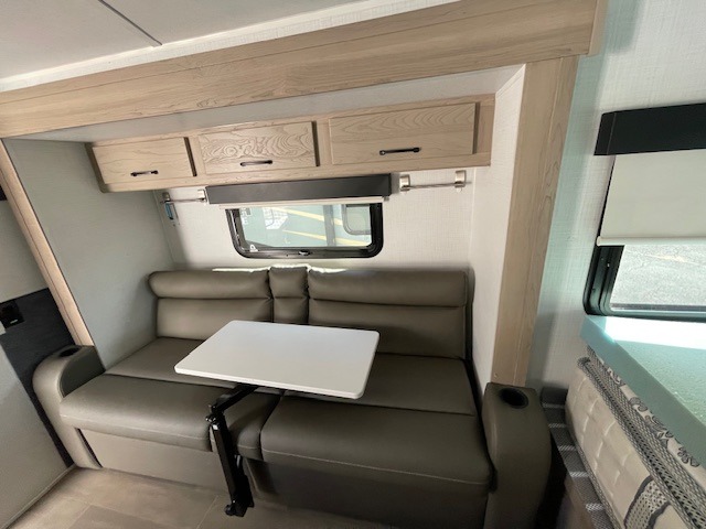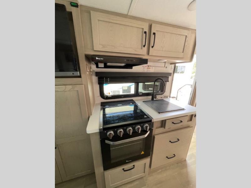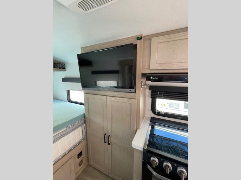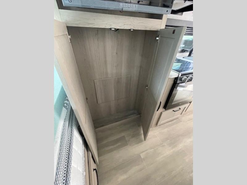 This can be the perfect couples trailer for you or your own RV with more floor space to move around thanks to the slide out sofa with a table which offers sleeping space for friends. You will have a queen bed to lay your head up front, and everyone can watch the 32" TV. The wardrobe and overhead cabinets give you clothing storage, and the kitchen cooktop and microwave allow the cook to make warm meals. And the 12V refrigerator is conveniently next to the entry so you can grab a drink on your way out to relax under the 11' power awning.