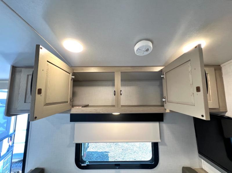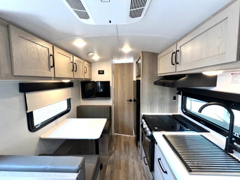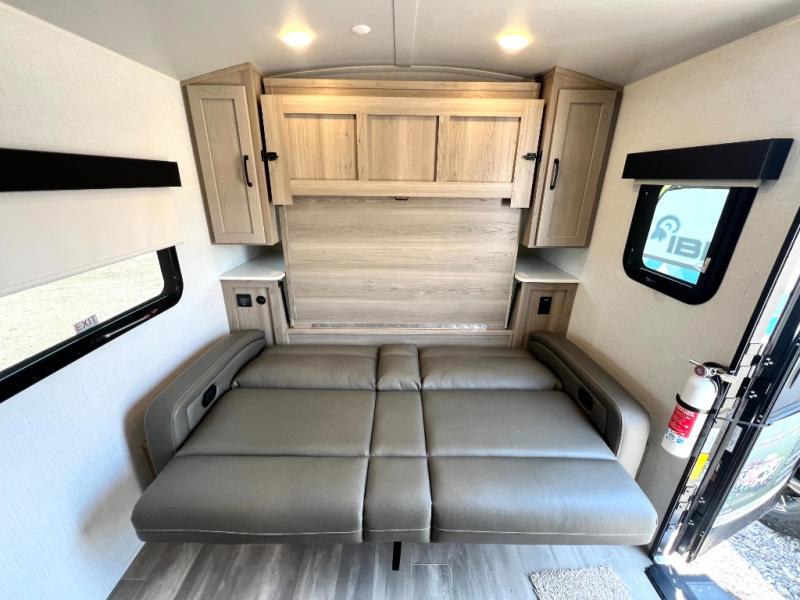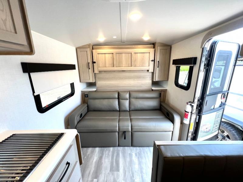 Whether you enjoy staying at the campground for a weekend or longer and/or you enjoy off-grid camping, this 20'2" long trailer gives you lots of interior space and versatility to enjoy each and every trip. From the Murphy bed/sofa combo up front offering sleeping space and seating depending on which you prefer at the time, to the full rear bathroom which also offers linen storage, you will have everything you need. And the kitchen cooktop, microwave and 12V refrigerator allow you to make meals and store leftovers. Two can dine at the booth dinette or you can eat outdoors under the 14' power awning.