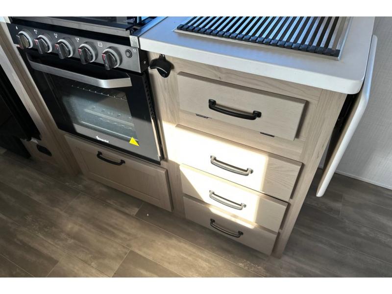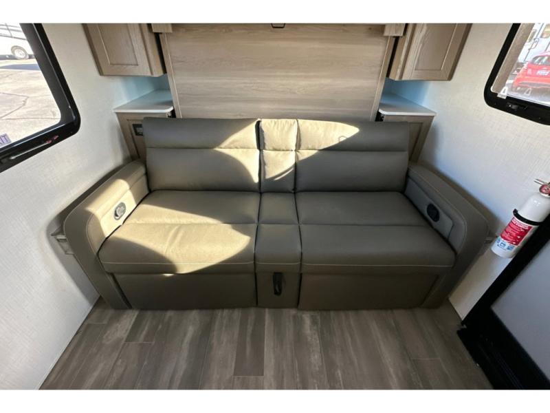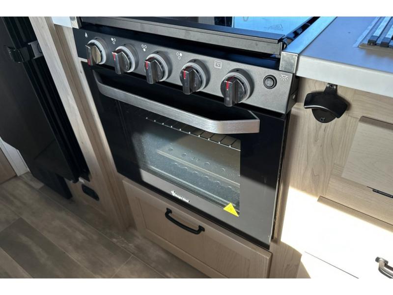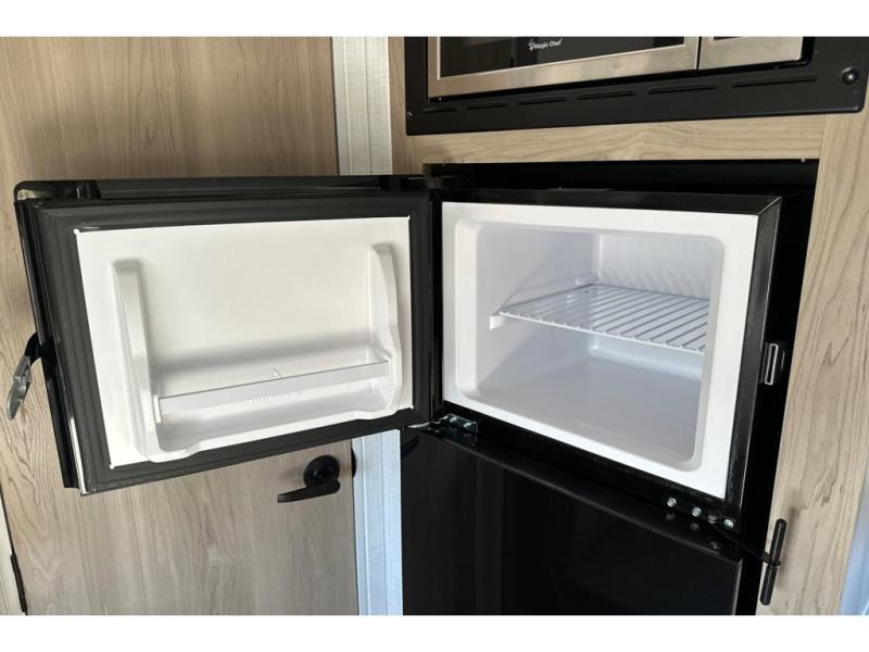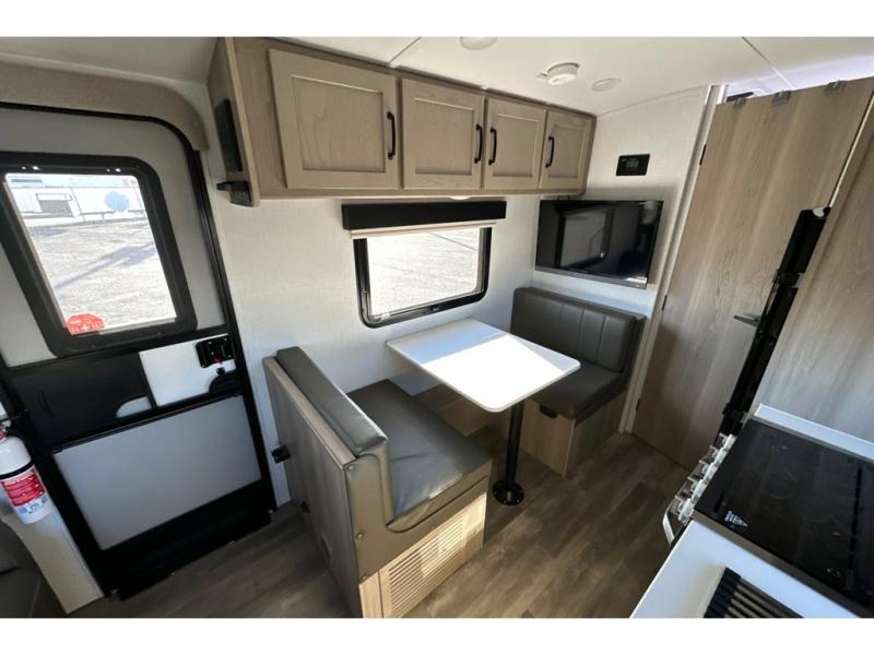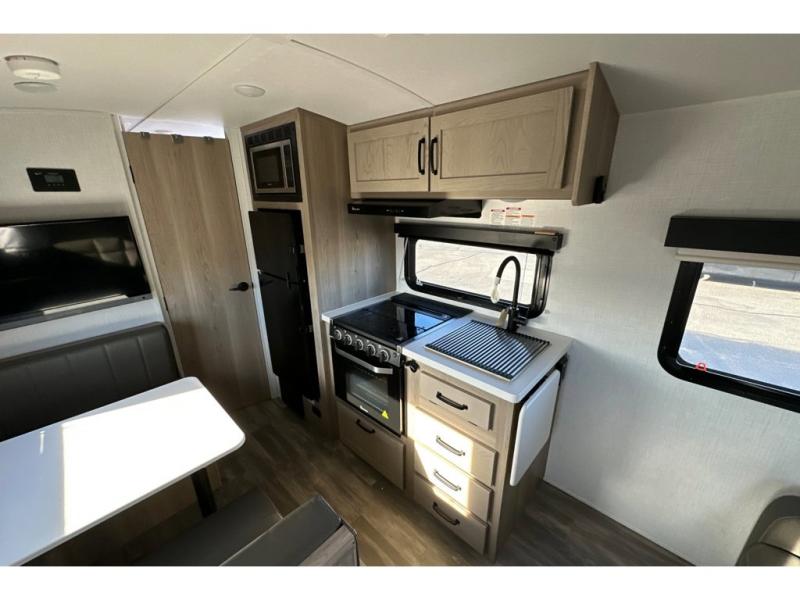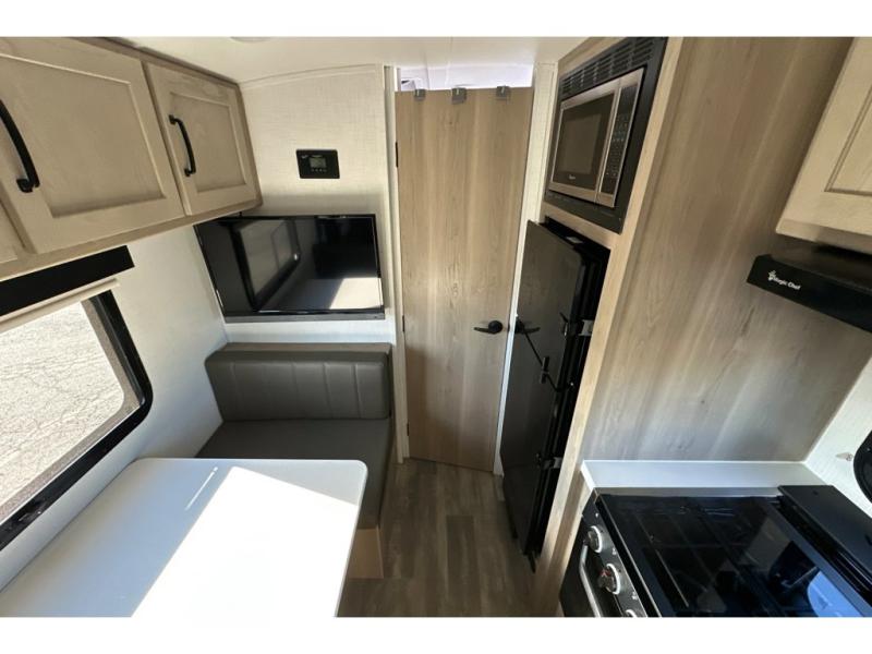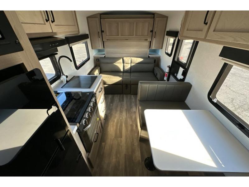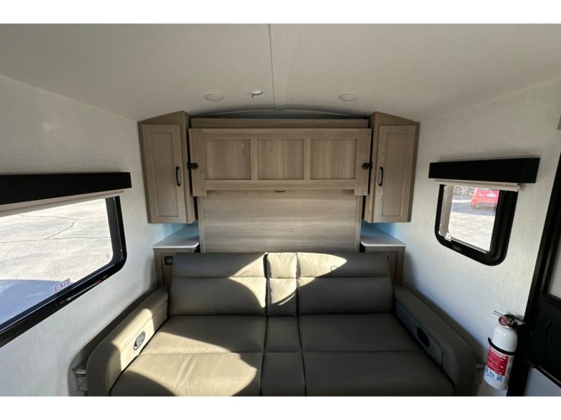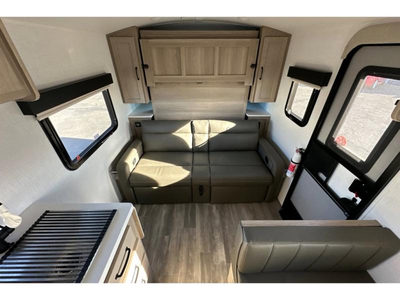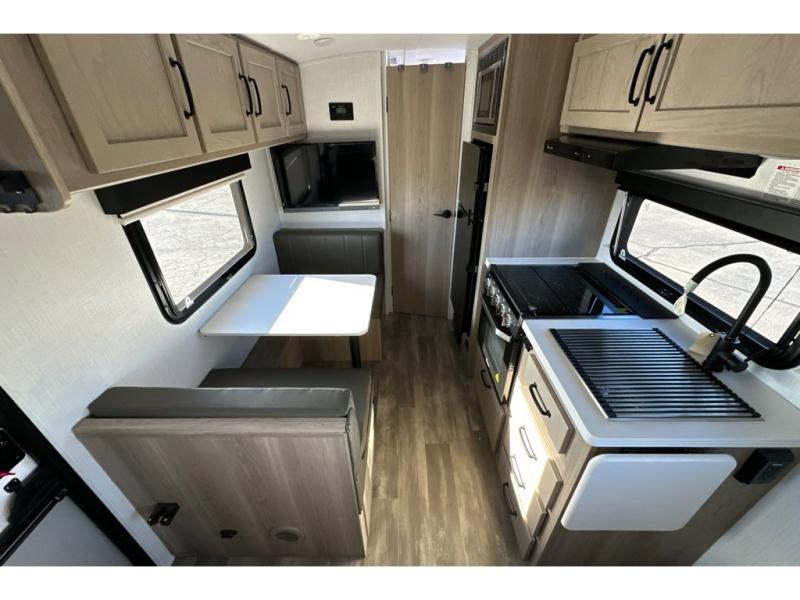 Whether you enjoy staying at the campground for a weekend or longer and/or you enjoy off-grid camping, this 20'2" long trailer gives you lots of interior space and versatility to enjoy each and every trip. From the Murphy bed/sofa combo up front offering sleeping space and seating depending on which you prefer at the time, to the full rear bathroom which also offers linen storage, you will have everything you need. And the kitchen cooktop, microwave and 12V refrigerator allow you to make meals and store leftovers. Two can dine at the booth dinette or you can eat outdoors under the 14' power awning.