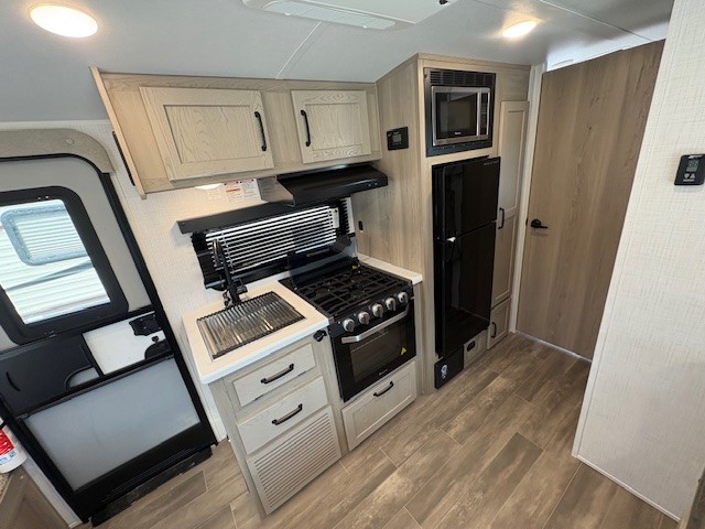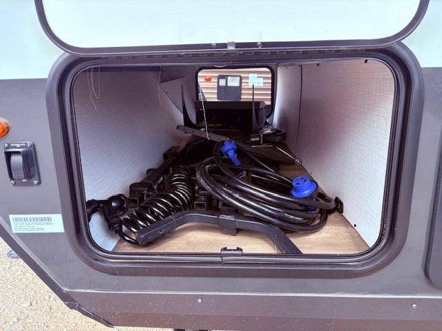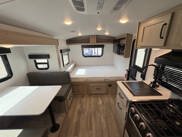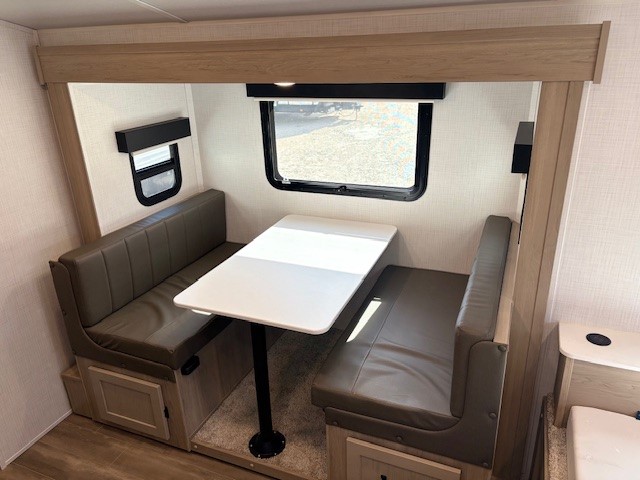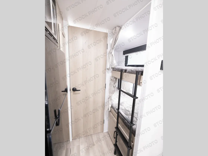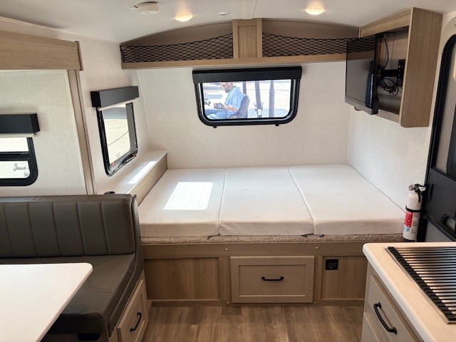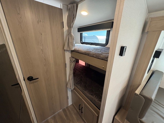 The largest bunk trailer in the E-Pro lineup will work perfectly for a family or friend group that enjoys their own sleeping space, plus more floor space with the dinette slide out that can sleep one to two. The bottom bunk even flips up so you can stow away your bikes, totes and such through the bike door for secure travels. There is exterior storage for more outdoor gear, and interior storage found throughout. The cook will love having a pantry and overhead cabinets for snacks, canned goods, dishes and more. After making a warm meal, the 12V refrigerator can hold the leftovers. The private toilet and shower/tub room gives you privacy and a place to get cleaned up after a fun day outdoors.