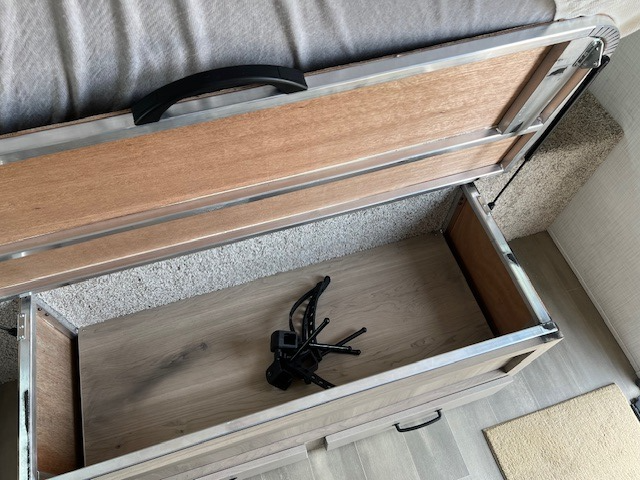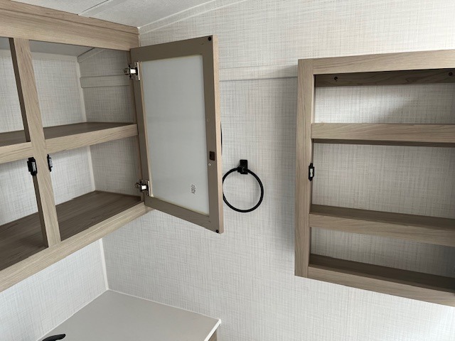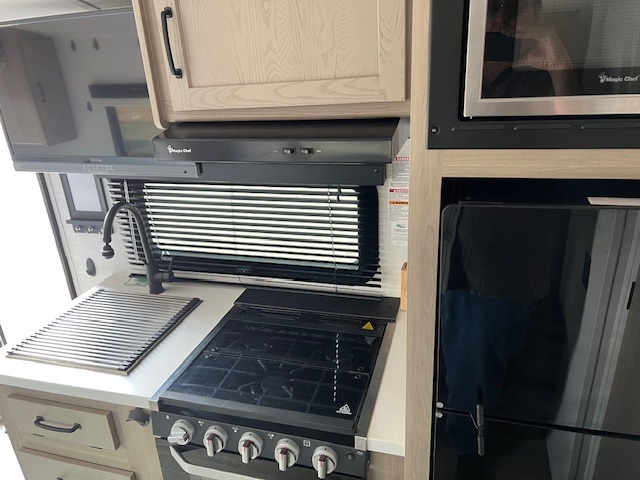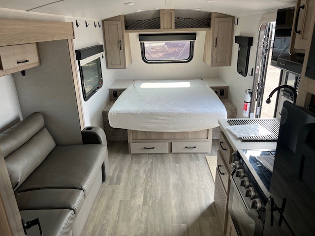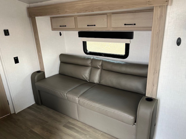 Get ready for a spacious and comfortable trip in this trailer, plus you will have a convenient rear full bathroom with an oversized shower and linen storage to utilize instead of using the campground's facilities. The walk-around full bed gives you two sides with wardrobes to claim as your own. And the kitchen offers full amenities to make meals, and the outside griddle gives you even more choices when cooking. You can relax, dine, or even work from the slide out sofa with a 30" x 15" table and watch the 32" TV. You will find storage along the exterior for your outdoor gear, plus a 14' power awning.