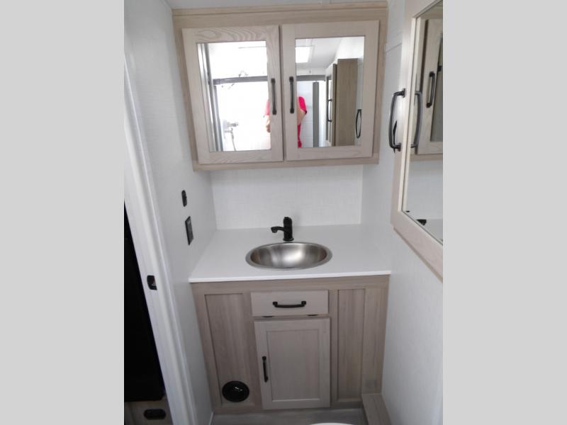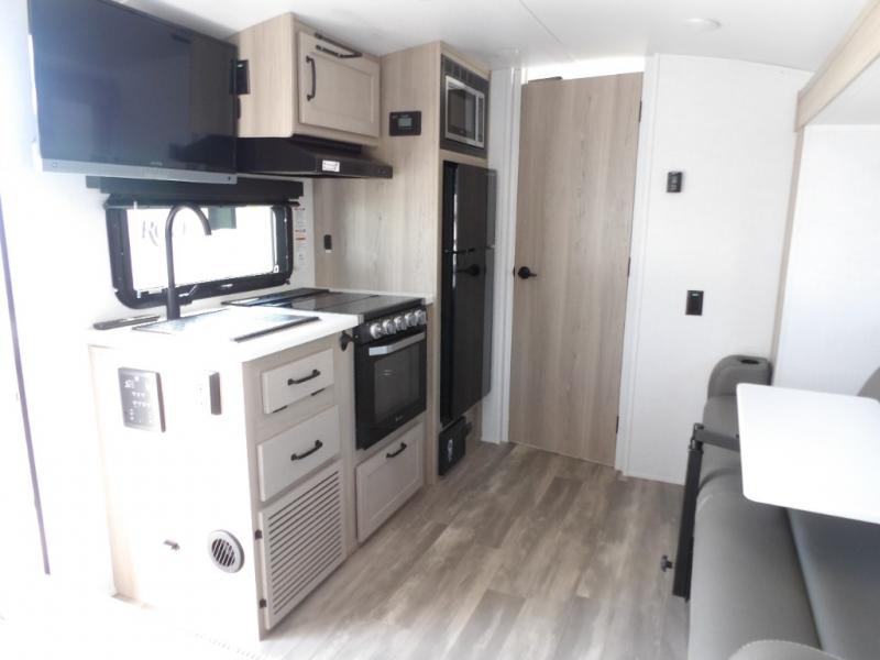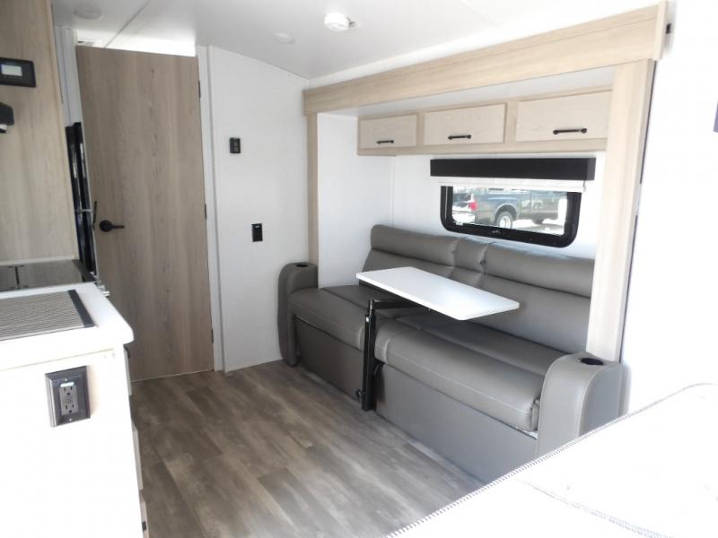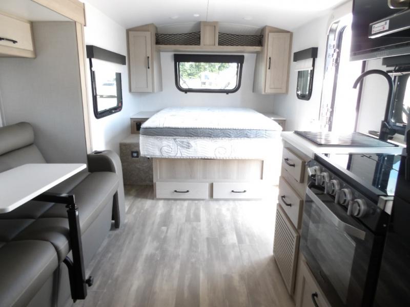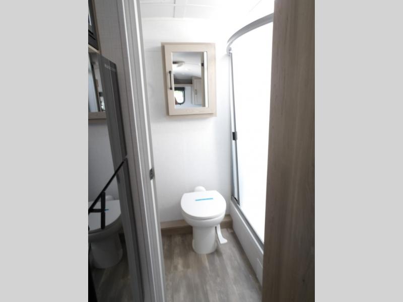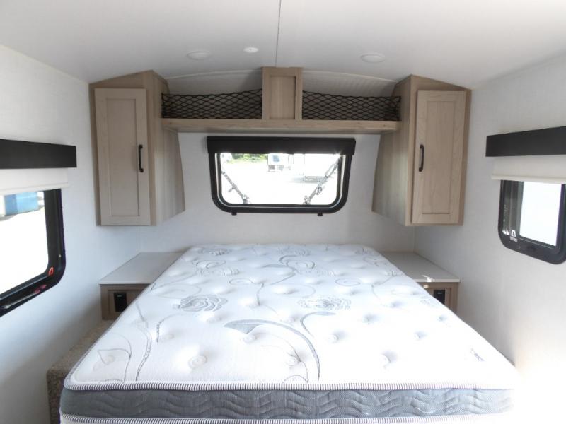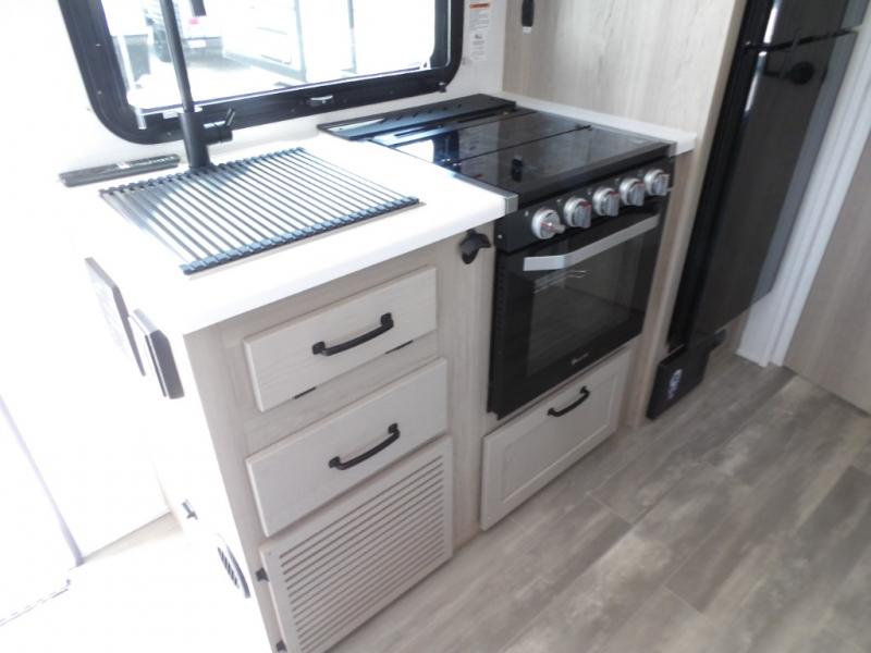 Get ready for a spacious and comfortable trip in this trailer, plus you will have a convenient rear full bathroom with an oversized shower and linen storage to utilize instead of using the campground's facilities. The walk-around full bed gives you two sides with wardrobes to claim as your own. And the kitchen offers full amenities to make meals, and the outside griddle gives you even more choices when cooking. You can relax, dine, or even work from the slide out sofa with a table and watch the TV. You will find storage along the exterior for your outdoor gear, plus a 14' power awning.