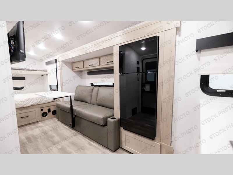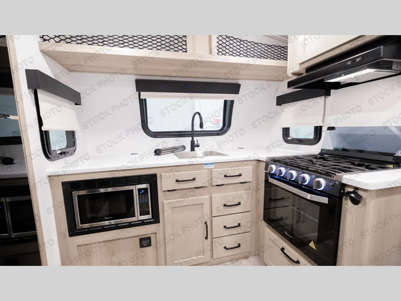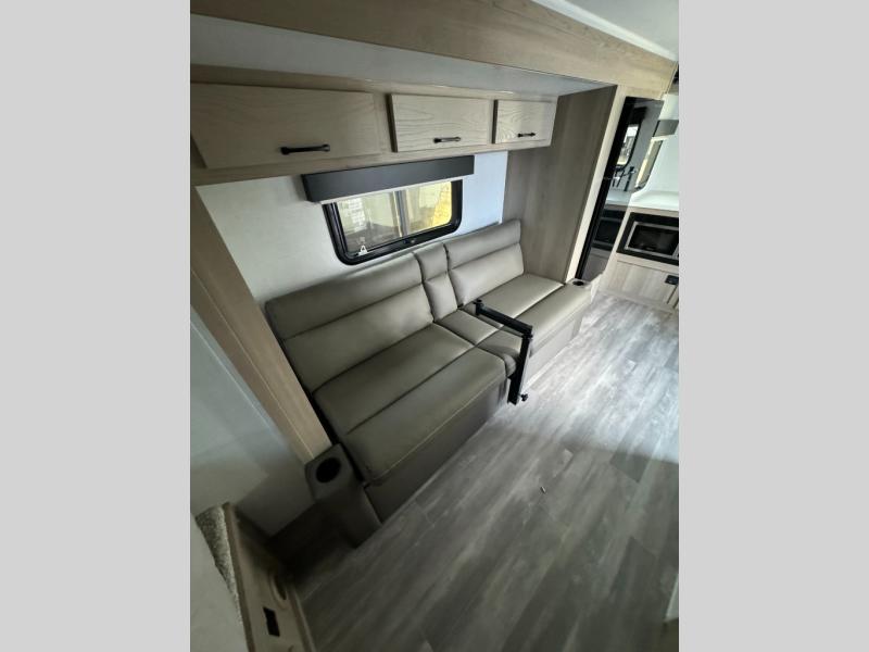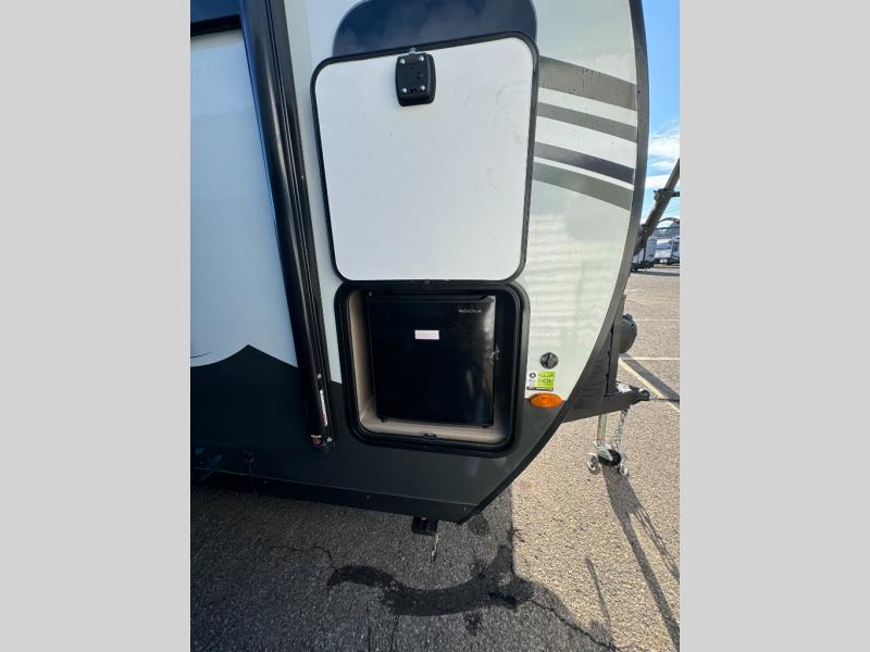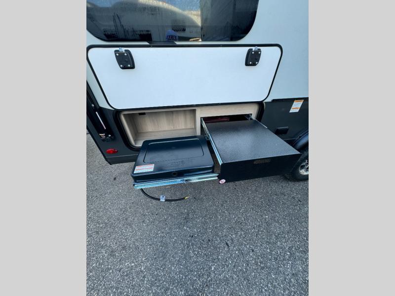 The chef will love cooking in the front kitchen of this travel trailer! It offers plenty of countertop space to meal prep and all of the essentials to cook delicious meals, plus there is even an outside kitchen with a refrigerator, a pull-out stove, and a griddle to fry what you caught that day. Enjoy all of your meals at the 72" sofa slide with a table or pull up a table and chairs under the 15' power awning. The queen bed offers a comfortable place for you to rest up each night and it even has a 26" x 80" flip-up bunk above it for a guest or two to tag along. Store all of your camping essentials in the exterior storage and rinse your feet off with the outside spray port after a fun day at the beach!