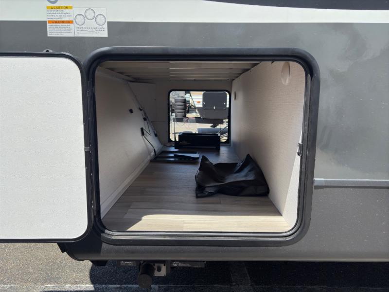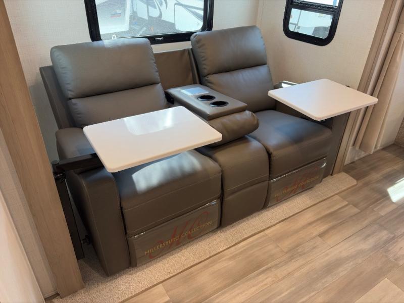Relax in the 67" theater seating with swivel tables—perfect for dining, working, or watching your favorite shows. The queen-size bed up front includes flip-up storage underneath and dual wardrobes for keeping your space tidy. The entryway wardrobe adds convenience for jackets, shoes, or quick-access items.