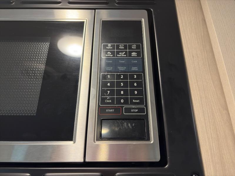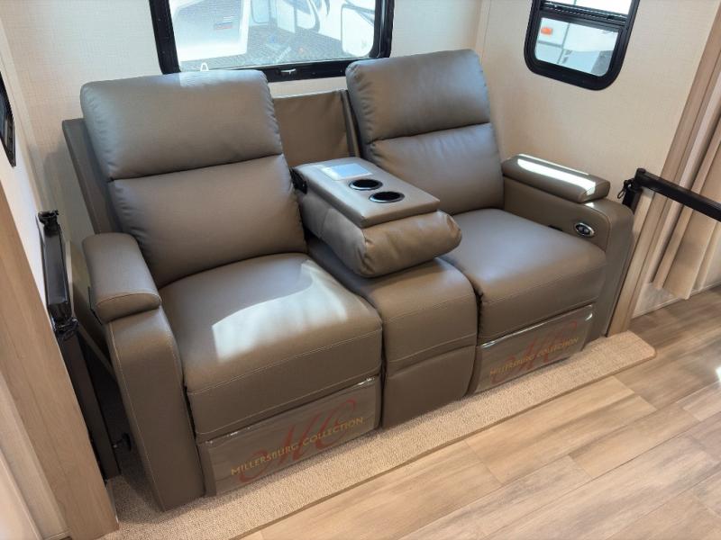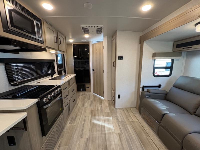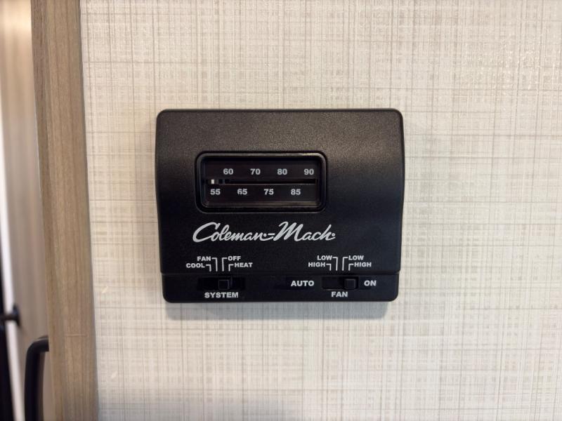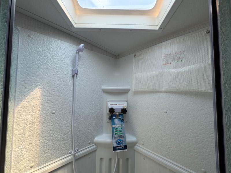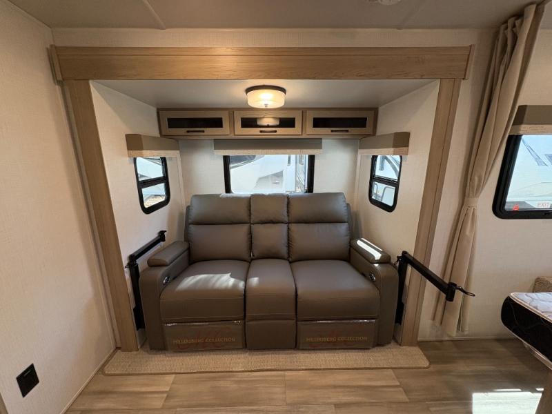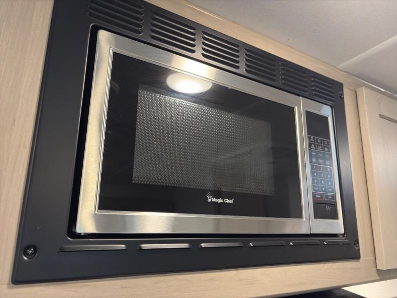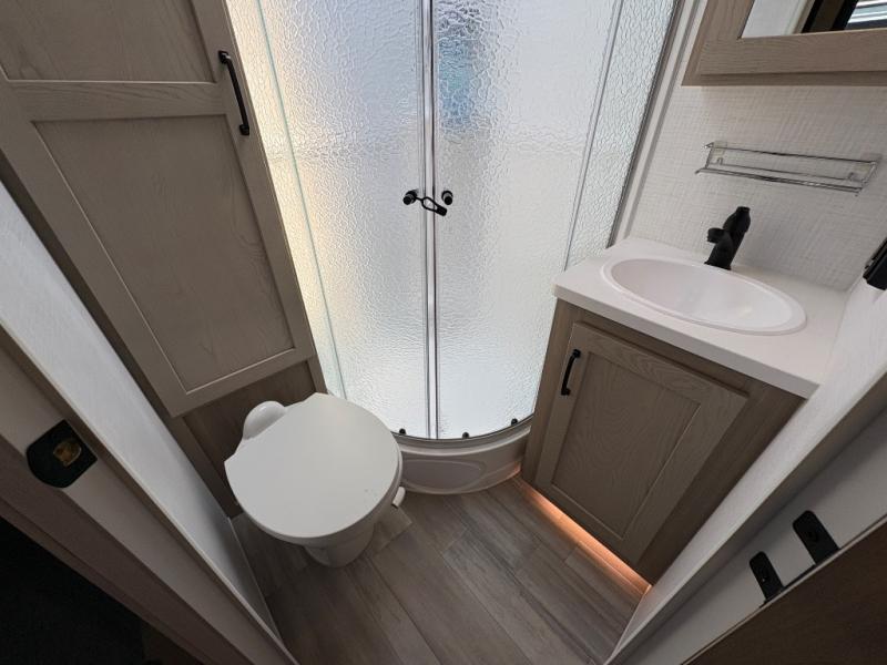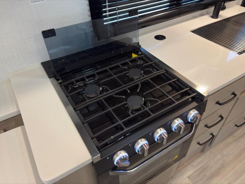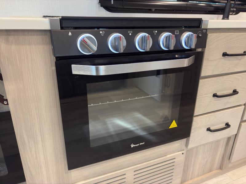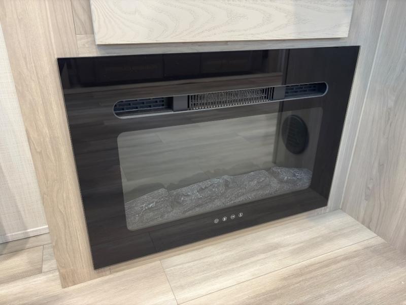 Enjoy home-style cooking with a three-burner range, gas oven, and 12V refrigerator, and unwind in front of the electric fireplace after a day of exploring. The full bathroom features a radius shower, linen closet, and skylight, offering comfort and privacy wherever you roam.