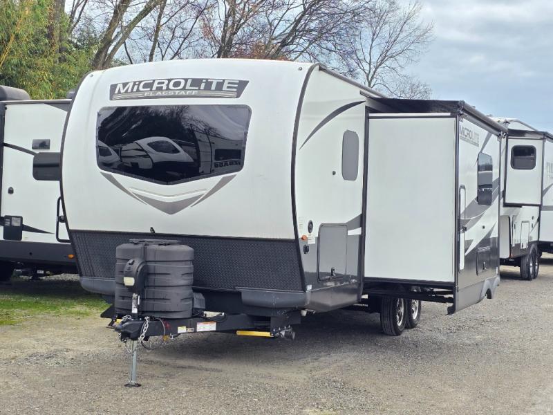 With any Flagstaff Micro Lite travel trailer by Forest River you will enjoy lightweight towing, durable construction, and added interior comforts to make each trip memorable! Each model features a torsion axle, Rubber-Ryde suspension, nitrogen filled, Goodyear Endurance tires, and easy lube axles with Nev-R-Adjust brakes for smooth towing from home to campground. The 6-sided aluminum framed construction provides a strong foundation so you can enjoy your RV for years to come, plus electronically controlled heated holding tanks and an enclosed underbelly will let you camp all year long. Head inside to find hybrid woven flooring in the slide outs, Sedona wood cabinetry, solid surface kitchen countertops, and many more amenities. These travel trailers also include exterior conveniences for hassle-free camping, like the power tongue jack, magnetic compartment door catches, Keyed Alike locks, and rear ladder to name a few!