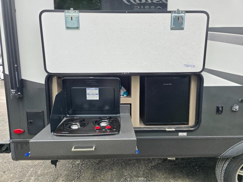 Load up your family of eight and head out to the campground of your choice with this Flagstaff Micro Lite travel trailer in tow! The kids will enjoy the double-size bunks so that they can invite their friends or cousins. This unit features a single slide with a U-shaped dinette so that you can gather around for family game night. And the dinette can be replaced by an optional theater seat or optional hide-a-bed sofa, depending on your needs! Relax on the sofa and visit with friends before converting the sofa into a Murphy bed. Everyone will appreciate having a full bathroom with a shower skylight above the shower for some extra sunlight while getting ready. Spend time outdoors with a an outside kitchen so that you can enjoy dinner under the stars.