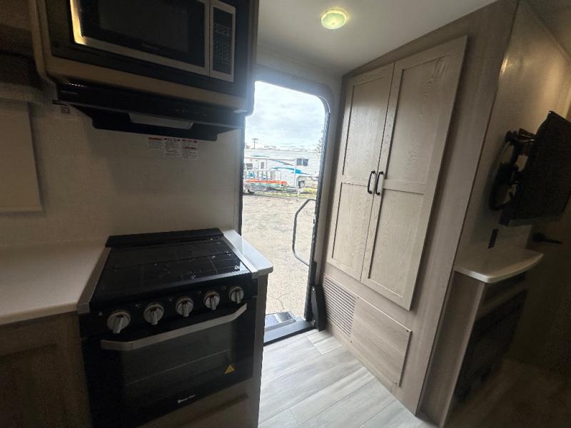 This Flagstaff Micro Lite travel trailer is going to make your camping dreams come true! With a queen bed slide and a large wardrobe in the private bedroom, you will have all that you need for sleeping and storing your belongings. Plus, the second exterior entry door leads right into the bedroom so that you can escape for an early morning run without running through the entire trailer to get outside. The front kitchen is open and accommodating with its helpful tools, and the 67" theater seat is right next to the 12V refrigerator on the slide out. Right next to the front entry door is a coat closet/pantry so you can keep your jackets readily available, and there is also a linen closet in the walk-through bath so that you can keep your towels ready for your shower.