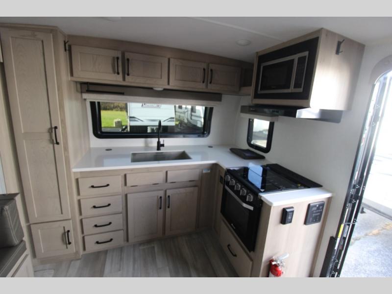 With any Flagstaff Micro Lite travel trailer by Forest River you will enjoy lightweight towing, durable construction, and added interior comforts to make each trip memorable! Each model features a torsion axle, Rubber-Ryde suspension, nitrogen filled, Goodyear Endurance tires, and easy lube axles with Nev-R-Adjust brakes for smooth towing from home to campground. The 6-sided aluminum framed construction provides a strong foundation so you can enjoy your RV for years to come, plus electronically controlled heated holding tanks and an enclosed underbelly will let you camp all year long. Head inside to find hybrid woven flooring in the slide outs, Sedona wood cabinetry, solid surface kitchen countertops, and many more amenities. These travel trailers also include exterior conveniences for hassle-free camping, like the power tongue jack, magnetic compartment door catches, Keyed Alike locks, and rear ladder to name a few!