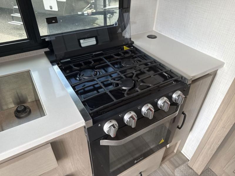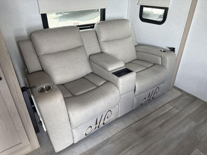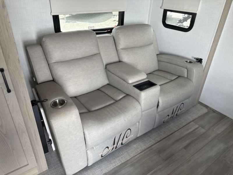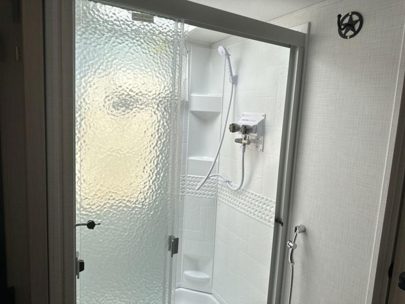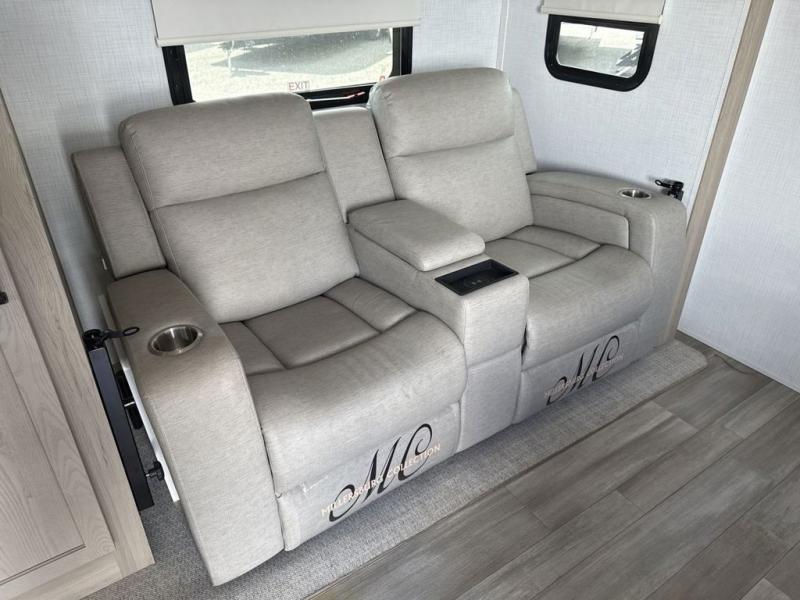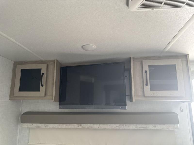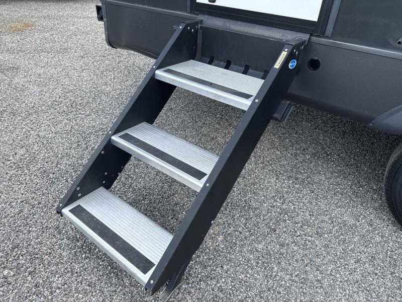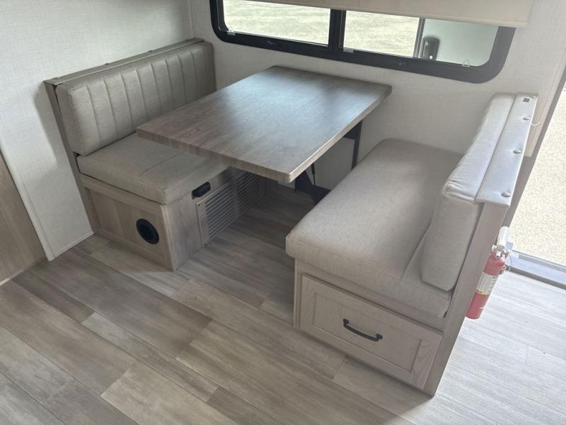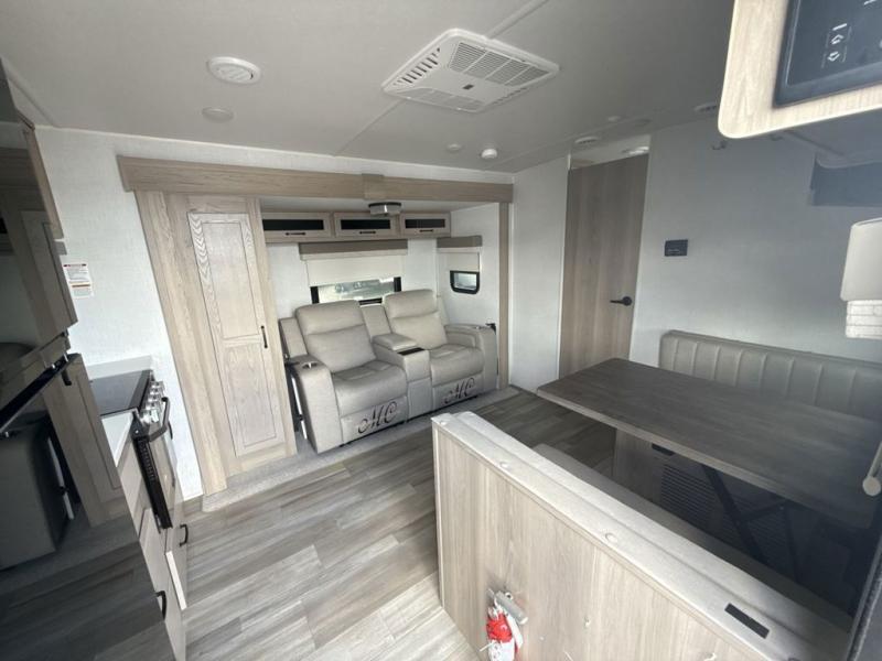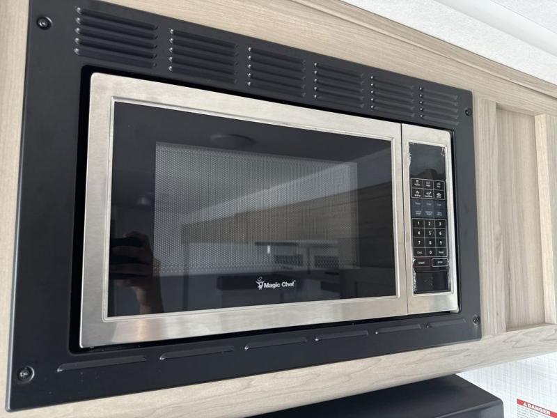 Trips to your favorite campground are made complete with this dual slide out, dual entry trailer! One entry goes straight into the front master bedroom where you'll find an RV queen bed with flip-up storage, a wardrobe slide out, and easy access into the walk-through bath. Once you're through the bath, you'll find the main living area, rear kitchen, and the second entry door at the back. Your crew can play a game at the 39" booth dinette or relax on the theater seat across from the TV. The kitchen includes everything you need to prepare meals in the morning, including a three burner cooktop and microwave oven, plus a 12V refrigerator and a pantry for food storage.