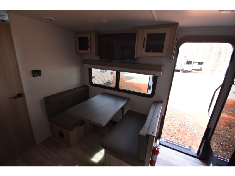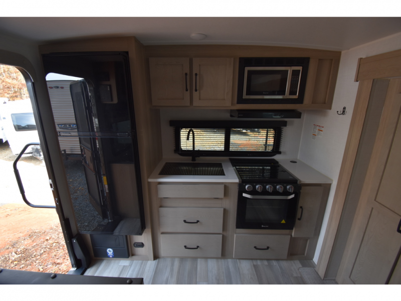 Trips to your favorite campground are made complete with this dual slide out, dual entry trailer! One entry goes straight into the front master bedroom where you'll find an RV queen bed with flip-up storage, a wardrobe slide out, and easy access into the walk-through bath. Once you're through the bath, you'll find the main living area, rear kitchen, and the second entry door at the back. Your crew can play a game at the 39" booth dinette or relax on the theater seat across from the TV. The kitchen includes everything you need to prepare meals in the morning, including a three burner cooktop and microwave oven, plus a 12V refrigerator and a pantry for food storage.