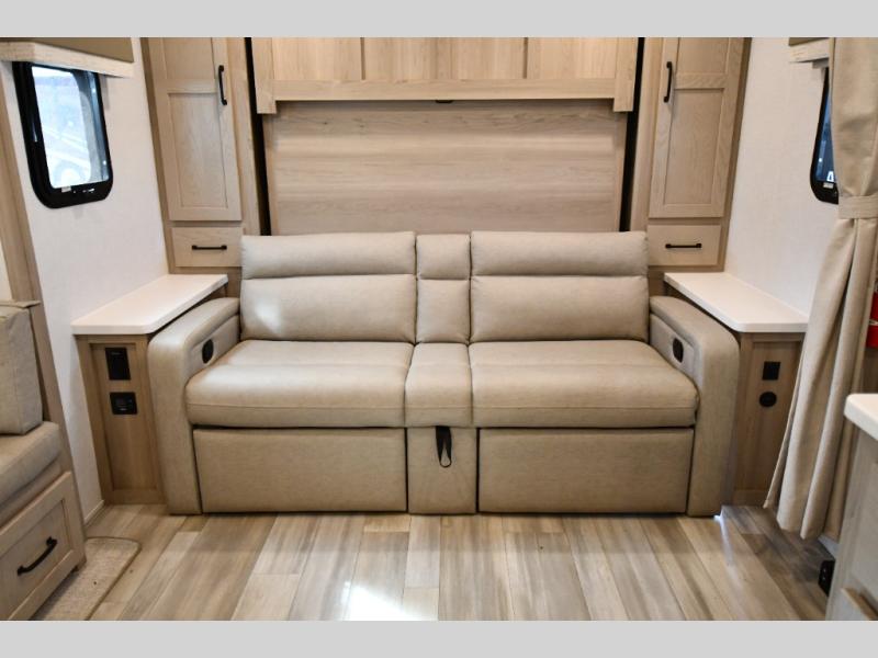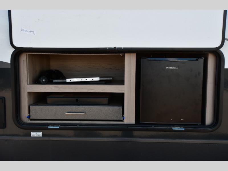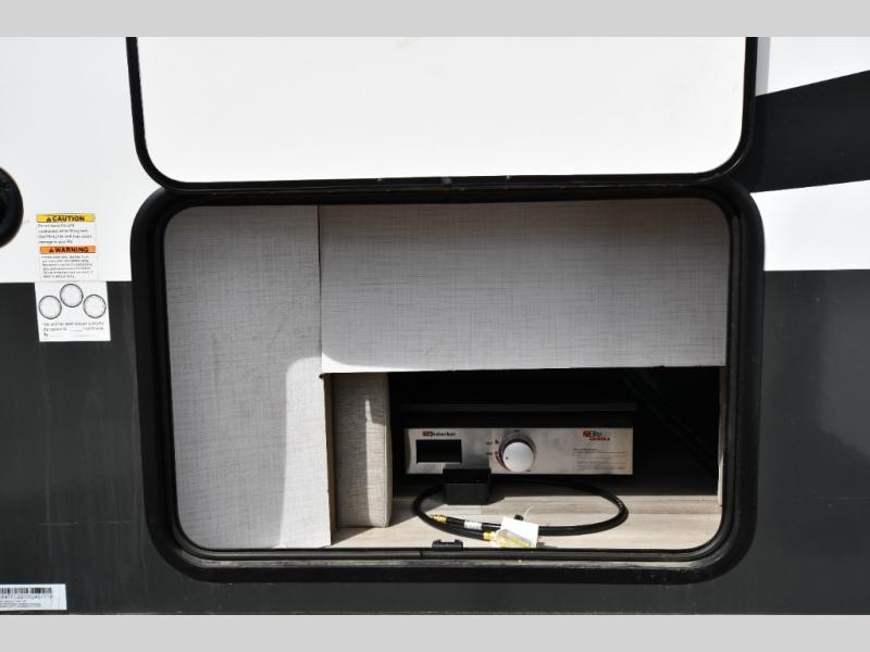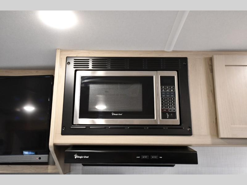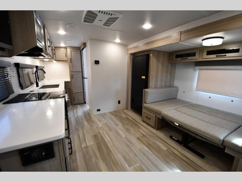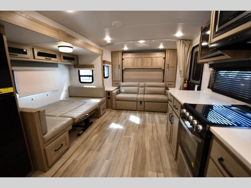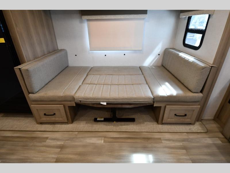 Not only does this travel trailer include an exterior pull out stove and an exterior griddle, but also a full interior kitchen in the back corner! You will appreciate ample counter space inside to prep kabobs for dinner or set out appetizers to keep your campers happy. Up front, you'll find the 74" sofa where you can relax each day, then fold down the Murphy bed in the evening for a great night's rest. There is also a privacy curtain here if you have guests staying over on the U-shaped dinette within the slide out, and the 32" TV means you all can watch a movie at night.