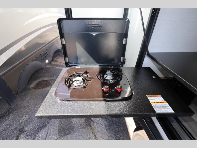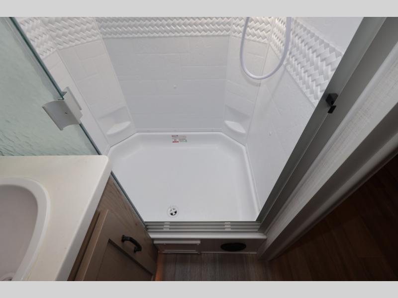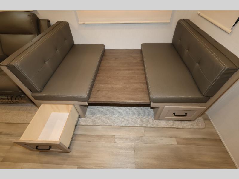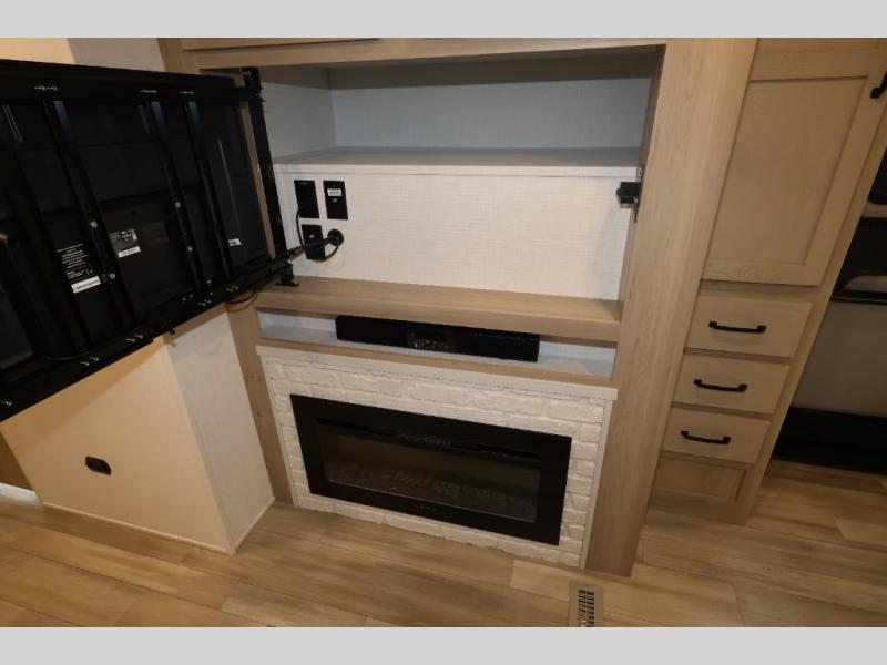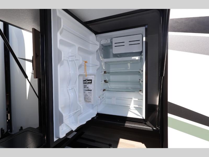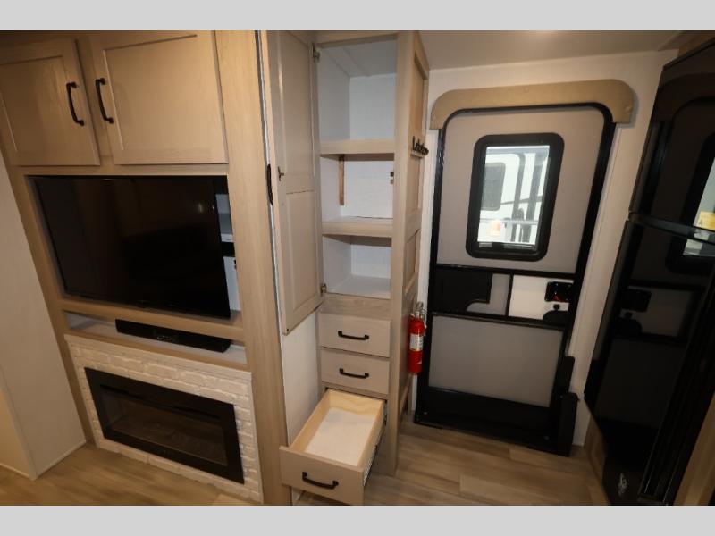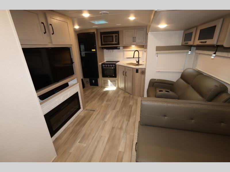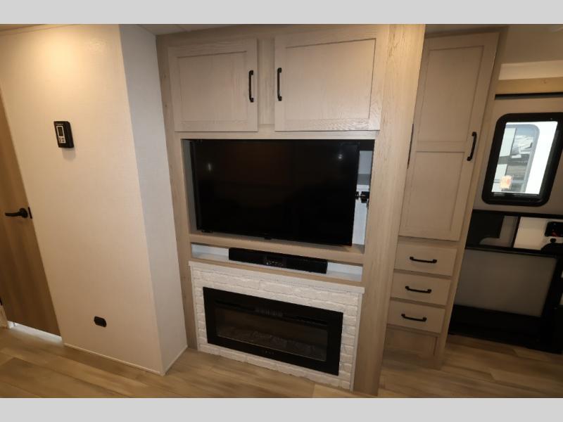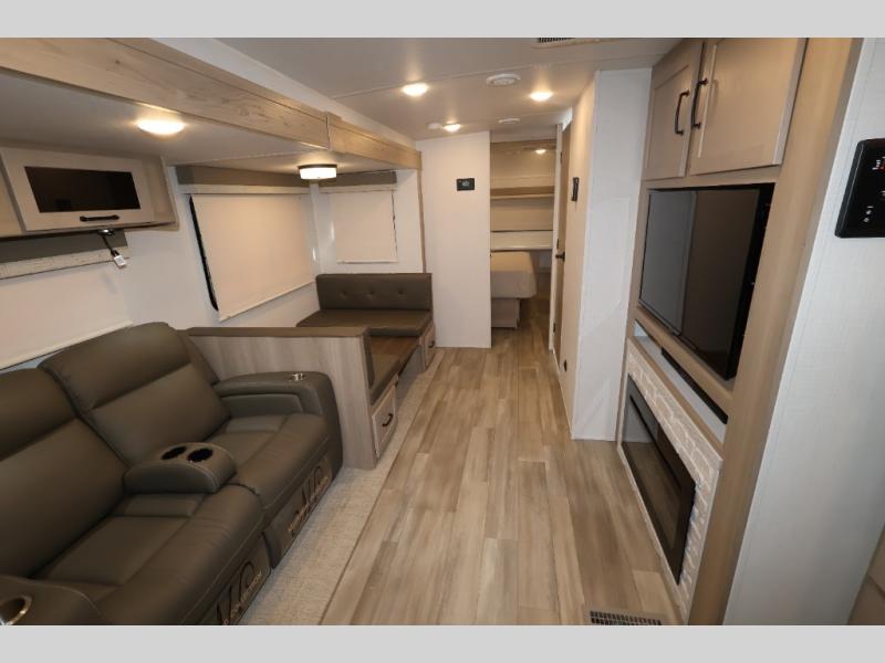 Whether you camp at state parks, national forests or on your friend's land, this trailer offers you plenty of floor space thanks to the two slide outs! As you enter the main entrance near the rear kitchen you can grab a drink from the 12V refrigerator or a snack from the pantry and relax on the 60" theater seating or sit at the booth dinette. The Smart TV offers entertainment while the fireplace will keep you cozy during the cooler months. Everyone will appreciate having a full bathroom to get cleaned up in, and the front bedroom gives you privacy and a queen bed slide, plus storage and the second exterior entry.