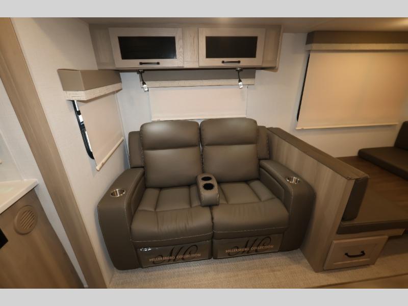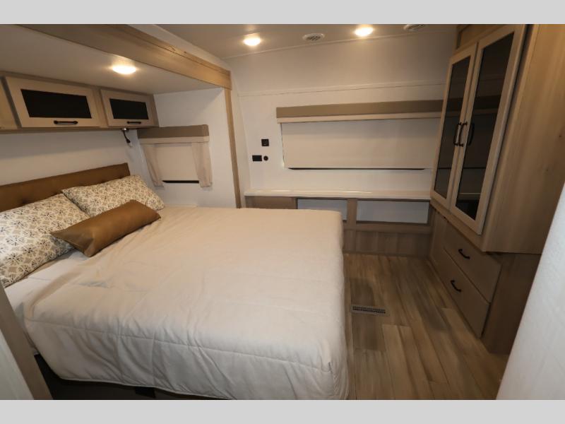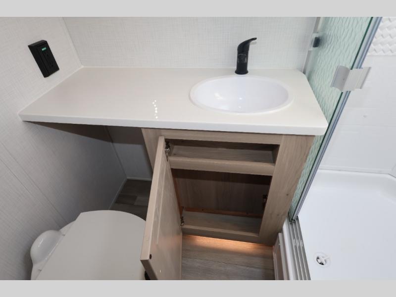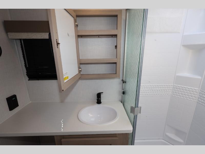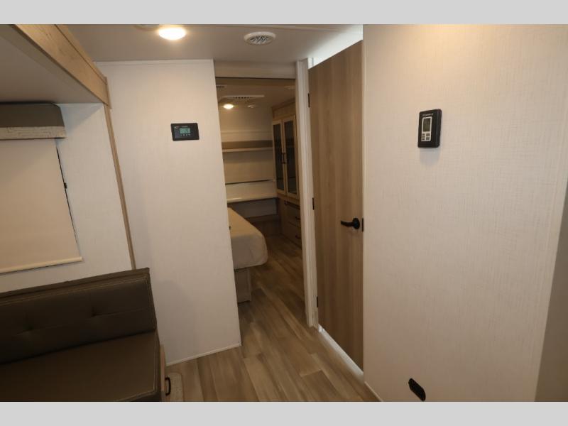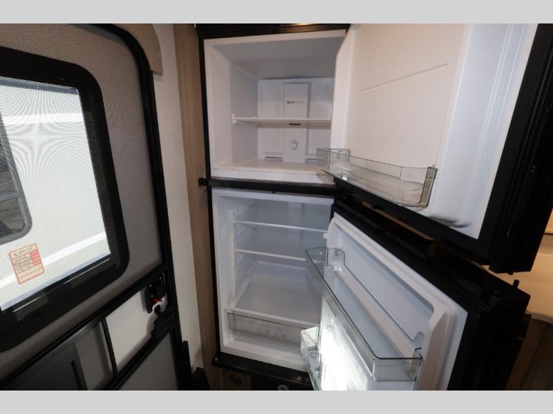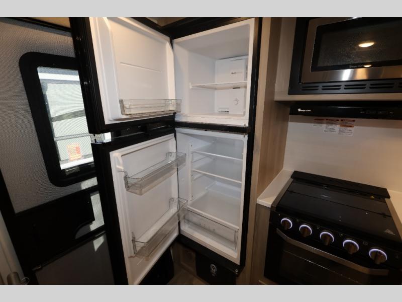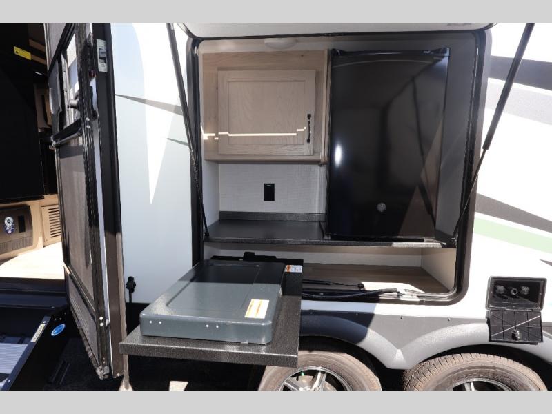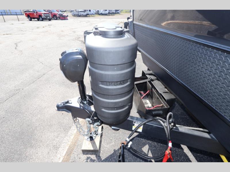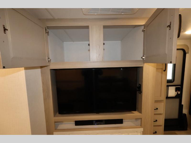 Whether you camp at state parks, national forests or on your friend's land, this trailer offers you plenty of floor space thanks to the two slide outs! As you enter the main entrance near the rear kitchen you can grab a drink from the 12V refrigerator or a snack from the pantry and relax on the 60" theater seating or sit at the booth dinette. The Smart TV offers entertainment while the fireplace will keep you cozy during the cooler months. Everyone will appreciate having a full bathroom to get cleaned up in, and the front bedroom gives you privacy and a queen bed slide, plus storage and the second exterior entry.
