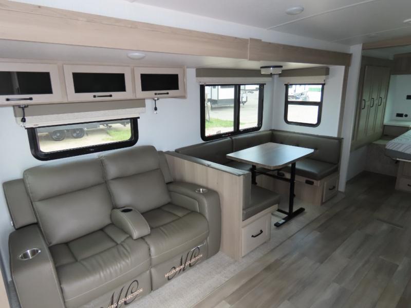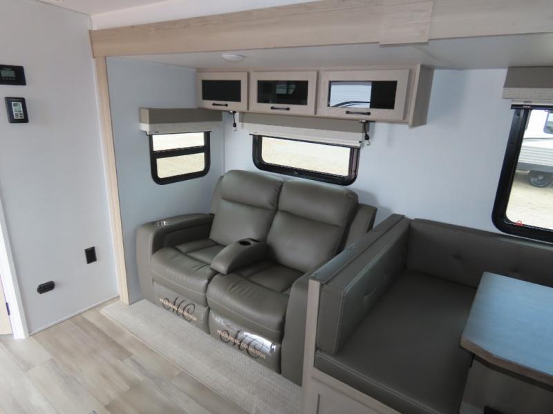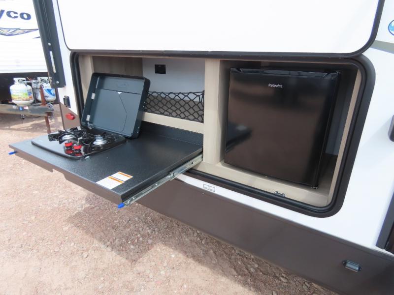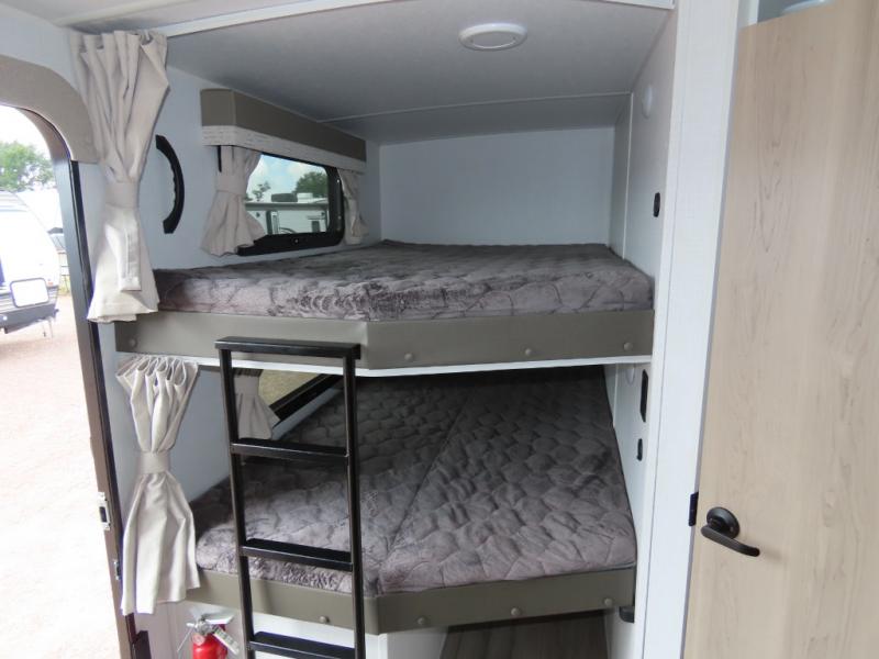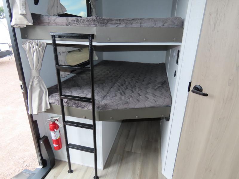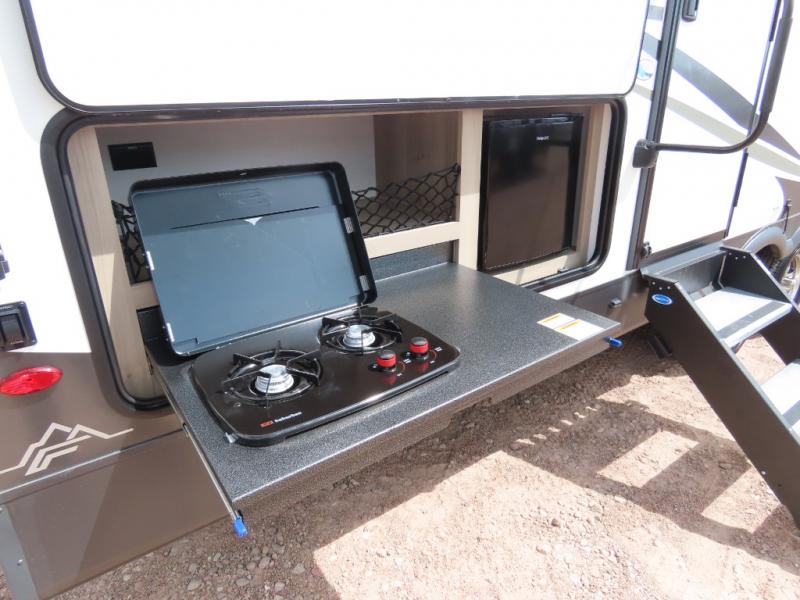 Get ready for a fun camping experience with your family and friends in this trailer that sleeps nine! From the rear double size bunks to the front bedroom's queen bed, and the furniture in the spacious main living area, everyone will find a place to lay their head at night. The cook will have full amenities inside and the choice to make meals on the outside kitchen when feeding everyone. There is abundant storage for your snacks and dry ingredients in the walk-in pantry, your cold items in the 12V refrigerator, and throughout the interior and along the exterior. You can load the larger gear in the front pass-thru with a steel sliding tray, and other outdoor items in the rear or side storage compartments.