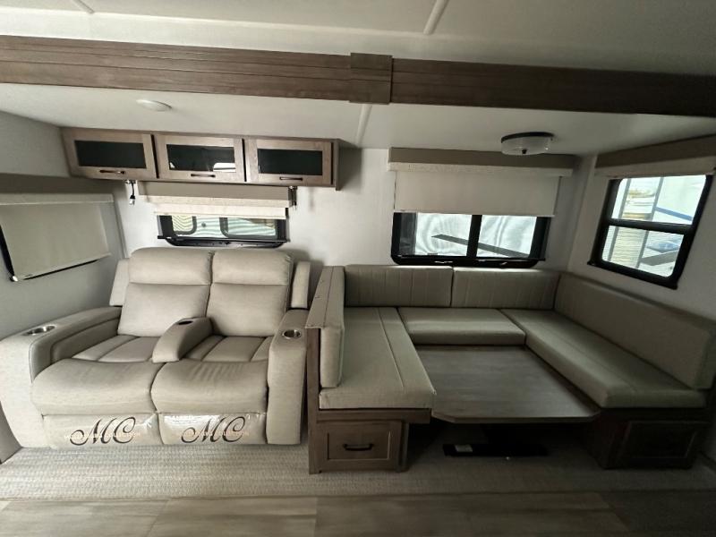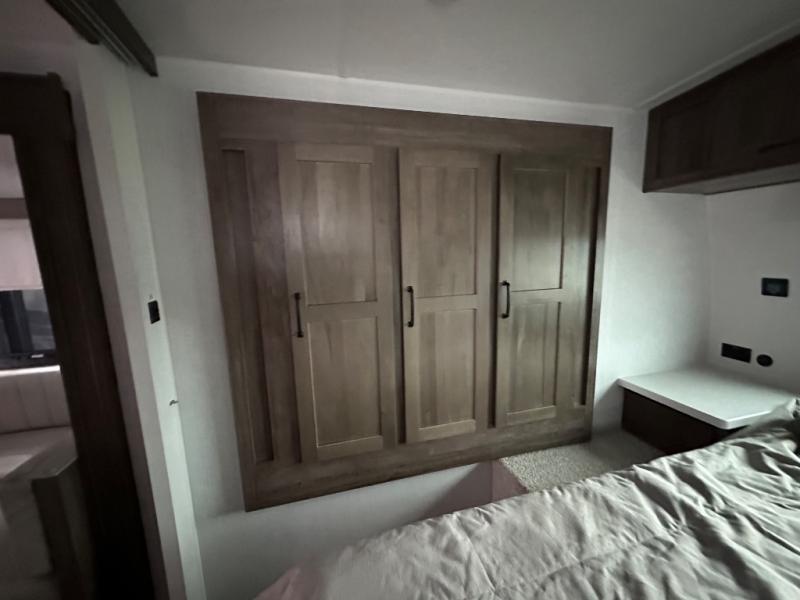 Get ready for a fun camping experience with your family and friends in this trailer that sleeps nine! From the rear double size bunks to the front bedroom's queen bed, and the furniture in the spacious main living area, everyone will find a place to lay their head at night. The cook will have full amenities inside and the choice to make meals on the outside kitchen when feeding everyone. There is abundant storage for your snacks and dry ingredients in the walk-in pantry, your cold items in the 12V refrigerator, and throughout the interior and along the exterior. You can load the larger gear in the front pass-thru with a steel sliding tray, and other outdoor items in the rear or side storage compartments.