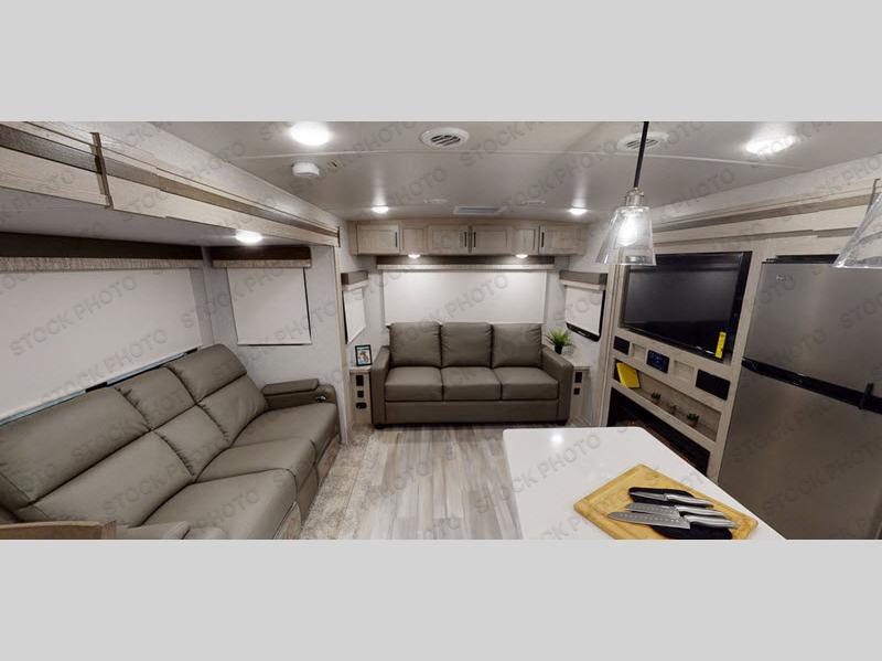 If you enjoy entertaining friends while camping, this trailer offers seating for nine in the combined living and kitchen area on the hide-a-bed sofa, the theater seats and the booth dinette. Everyone can visit, watch the Smart TV and enjoy the fireplace all while the cook is preparing snacks in the kitchen with full amenities. The full bathroom has two entries for convenience, and the front bedroom offers a queen bed slide for more floor space or choose a king option, plus plenty of storage. And the two 11' awnings offer an outdoor living area after you add your camping chairs.