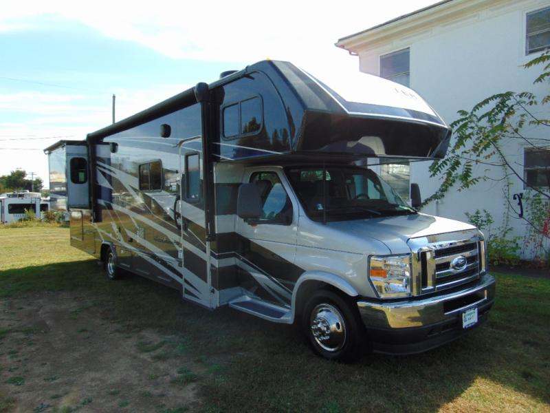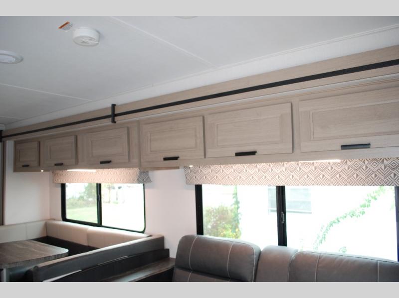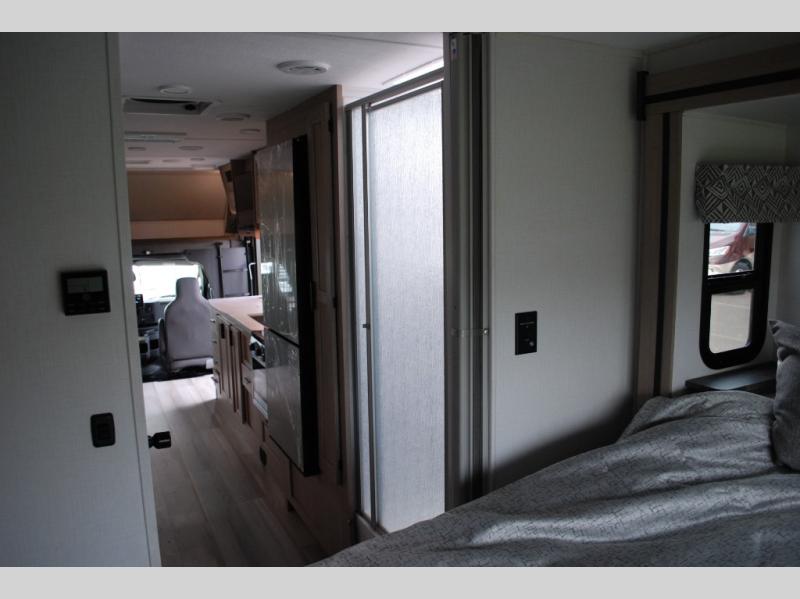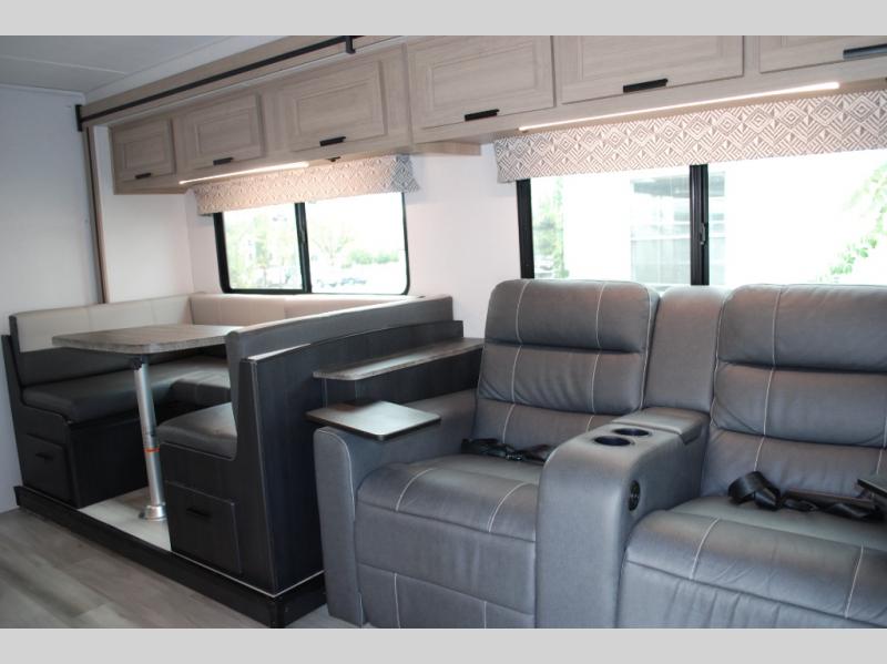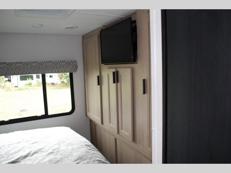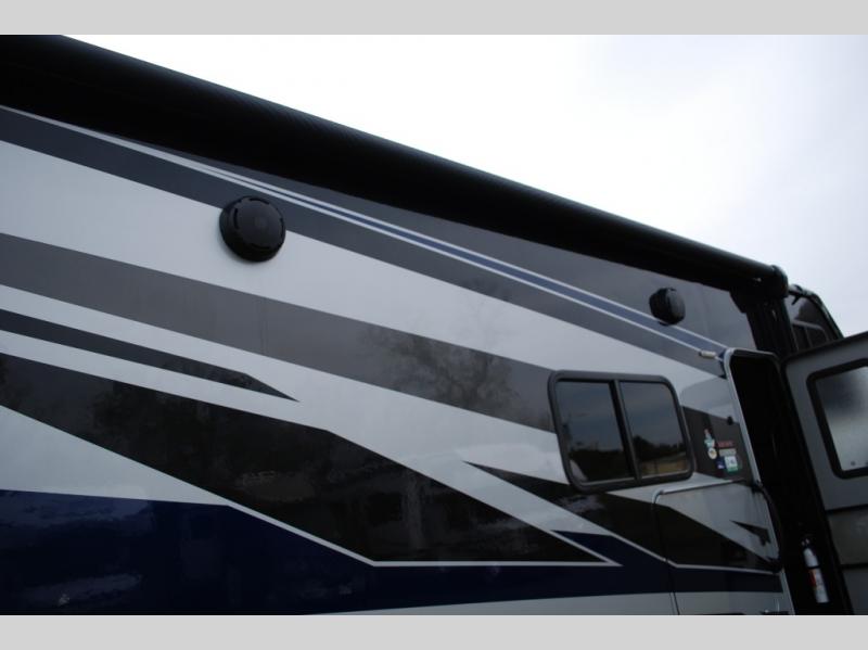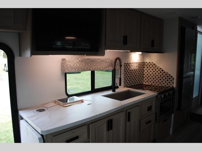 Escape the hustle and bustle of everyday life with this motorhome! It features a 60" x 80" bunk over cab mat which can be switched out for an optional Trekker cap with a built-in entertainment center. The sofa and U-shaped dinette slide offer comfortable places to enjoy meals, socialize, and even sleep once converted. Prepare your best meals with the 10.7 cu. ft. 12V refrigerator, the three burner cooktop, the flip-up countertop, and even the 1.3 cu. ft. undermount convection microwave. The separated bathroom has a 24" x 32" shower across from a toilet with a sink and countertop space, plus it leads directly into the rear private bedroom which has a 60" x 74" queen bed slide across from a linen/12V TV area with wardrobes on either side. You can even add an optional outside 12V TV and stay protected by the 15' 6" power awning!