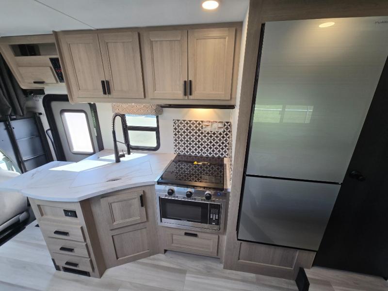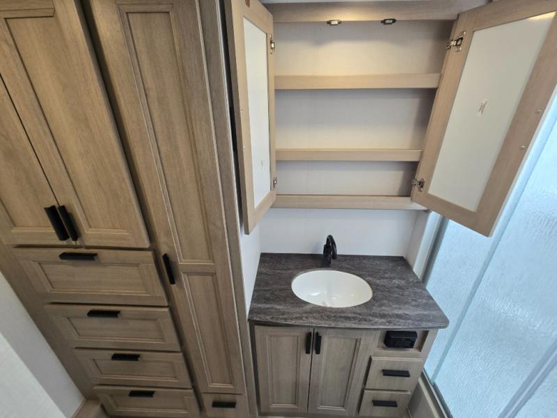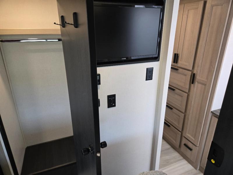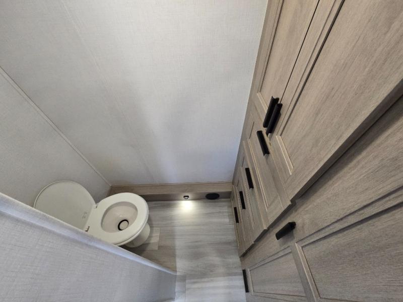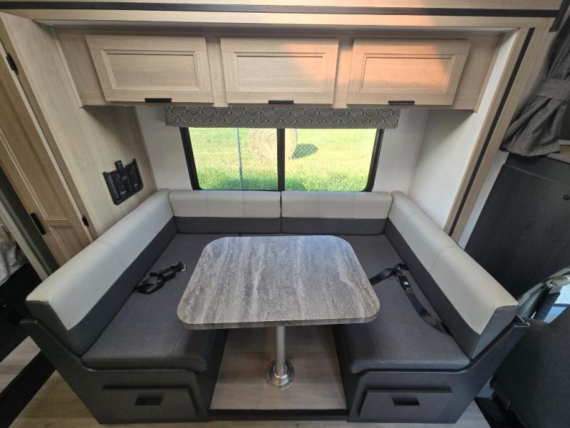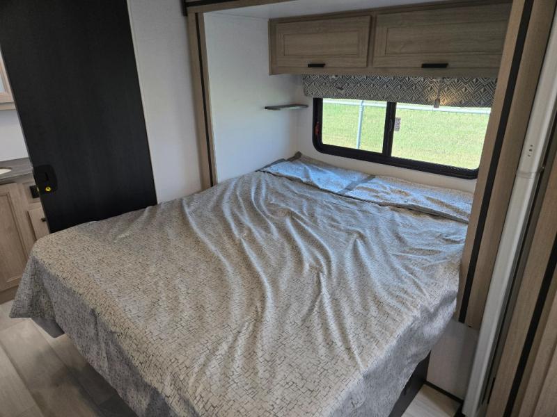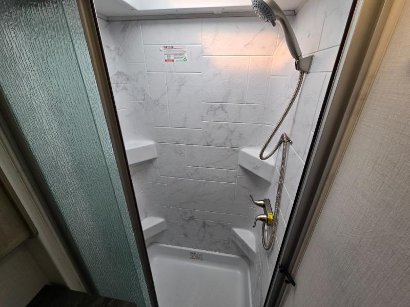 You will feel right at home traveling in this motorhome! The full rear bathroom has a 24" x 36" shower to freshen up in, plus storage space and a private toilet so you both can use this room at once. Inside the bedroom is a 60" x 74" queen bed slide with a wedge mattress for more space, and a 12V TV for movies in bed. Prepare your best meals with the three burner cooktop and the 10.7 cu. ft. 12V refrigerator or throw some leftovers in the undermount 1.3 cu. ft. convection microwave, then enjoy it at the U-shaped dinette slide. The 60" x 80" bunk over cab mat offers a comfortable place to sleep but if you don't need the extra sleeping space, you can switch it out for the optional Trekker cap with a built-in entertainment center, plus there is an optional outside 12V TV to add!