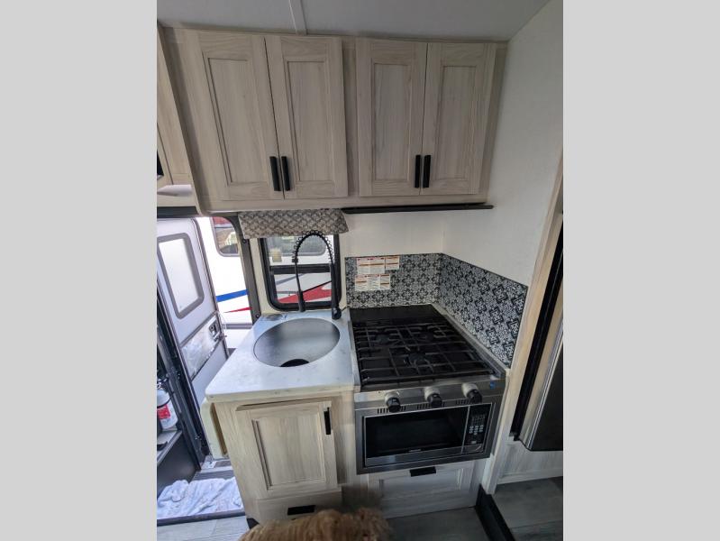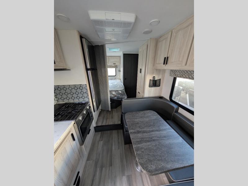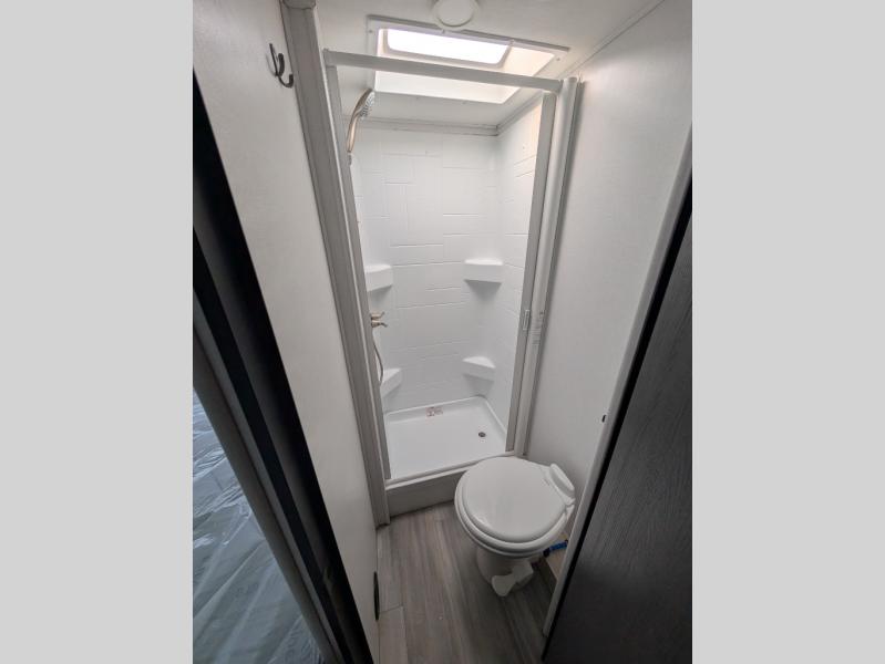 Travel in style with your own accommodations in this coach. You'll find a queen-size cab-over bunk that can be utilized as extra sleeping space or even storage, plus the rear corner offers a queen bed. And don't forget about the U-dinette as extra sleeping space after dining, playing games and relaxing. The kitchen offers a 10.7 cu. ft. 12V refrigerator, a convection microwave, a recessed three-burner range, soft touch self-closing drawer guides and a cordless 12V charging plate. The private toilet and shower room gives you a place to get cleaned up, and the bathroom sink is just outside the door allowing someone else the ability to get ready at the same time.