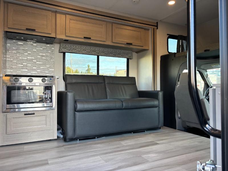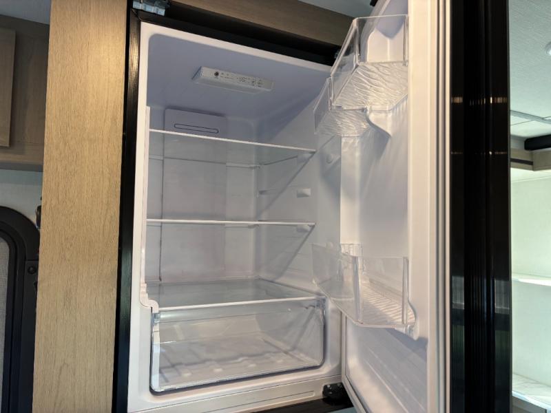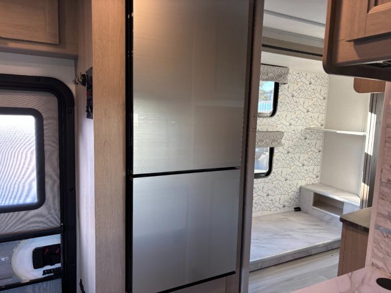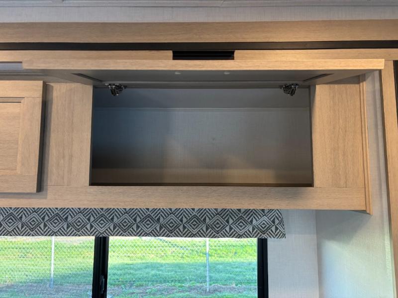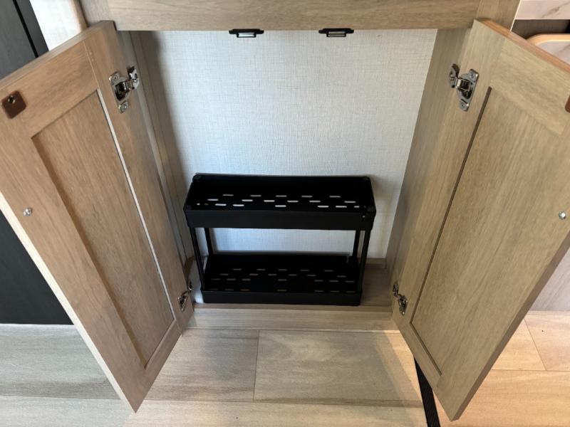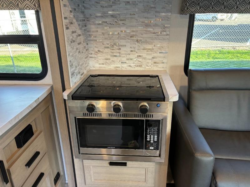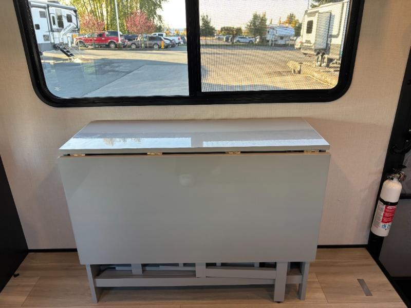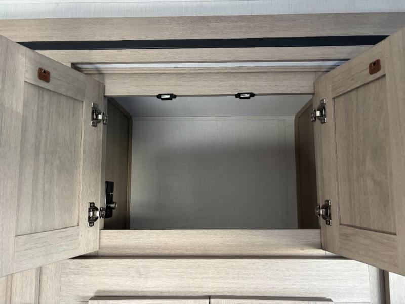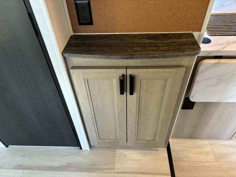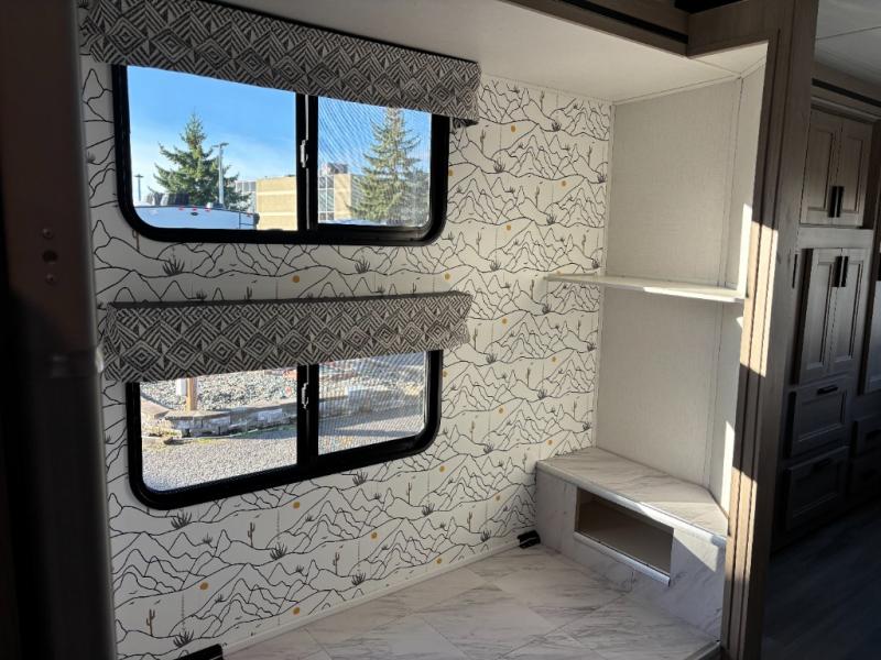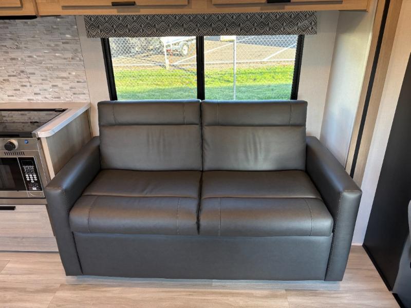 This family friendly coach allows the kids to have their own space either on the flip-down bunk above the kid's sofa sleeper that is across from the full bathroom or on the cab-over bunk. You will have the rear bedroom all to yourselves with a queen bed and a large wardrobe for your things. Everyone can visit while relaxing on the sofa and booth dinette while watching the LED TV or even while sitting under the 11' power awning outside when you add your camping chairs. The kitchen offers a corner area to make meals with a convection microwave and recessed three-burner range, plus a round sink and flip-up counter extension, and you can store cold items in the 10.7 cu. ft. 12V refrigerator near the entry, and the soft touch self-closing drawer guides and cordless 12V charging plate are features you will love.