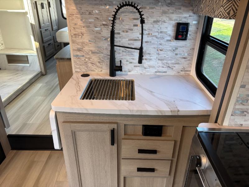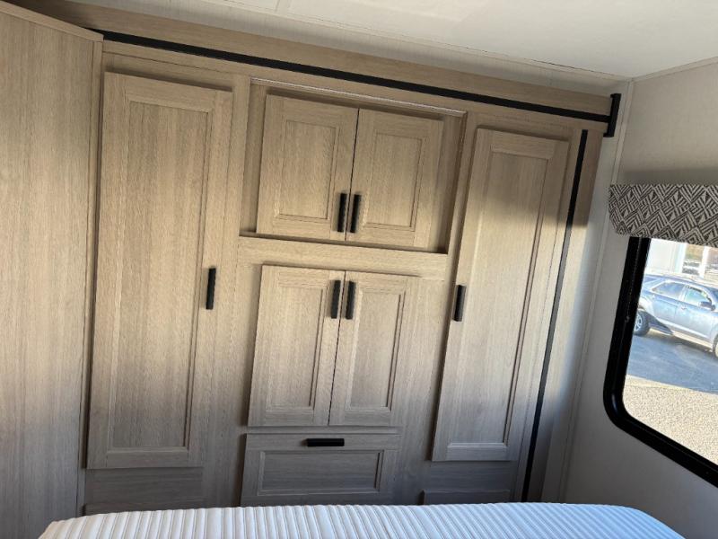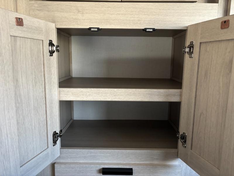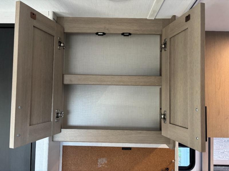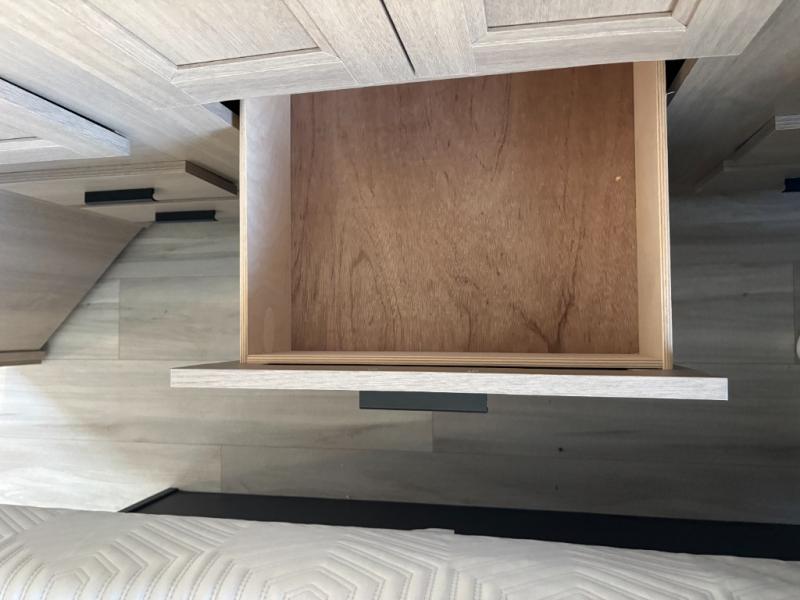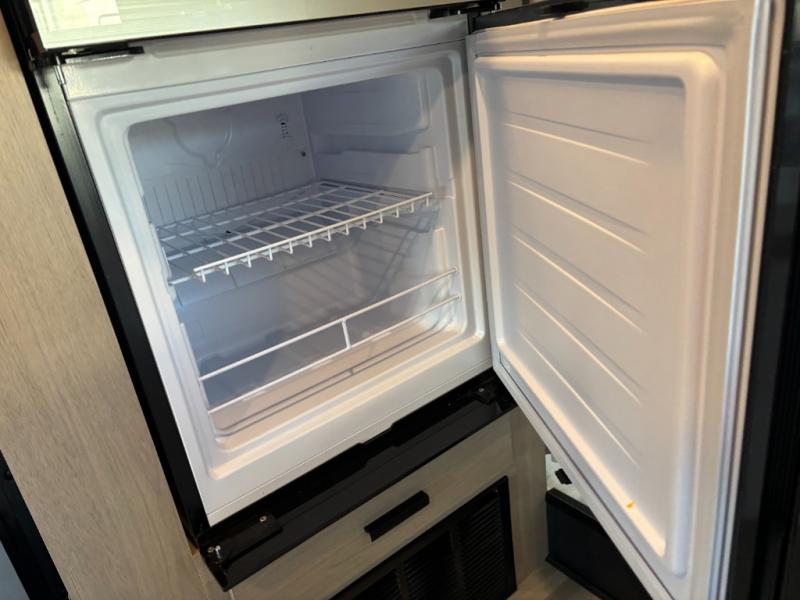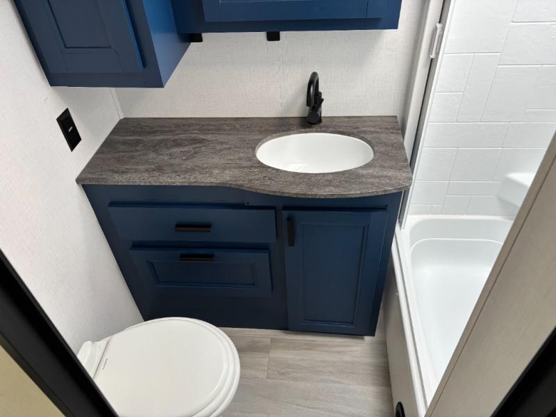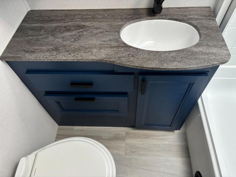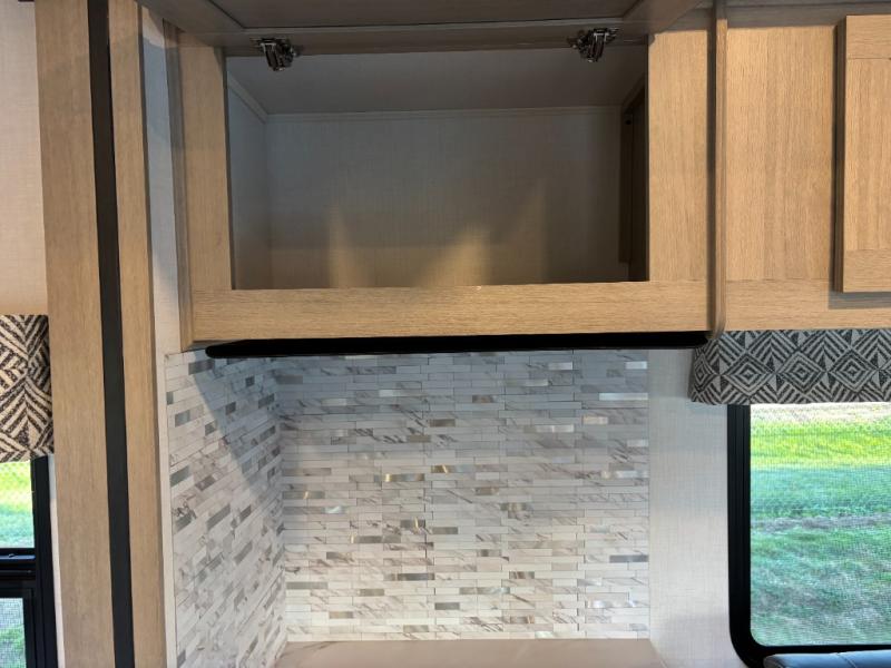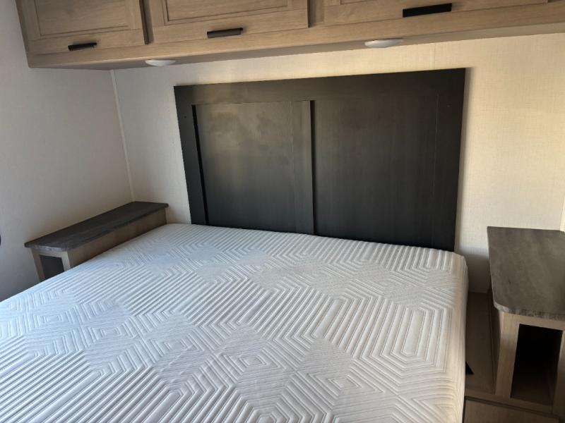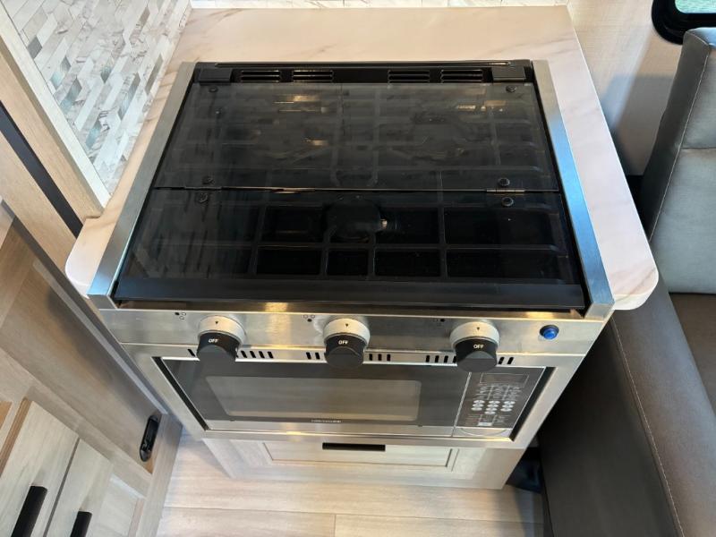 This family friendly coach allows the kids to have their own space either on the flip-down bunk above the kid's sofa sleeper that is across from the full bathroom or on the cab-over bunk. You will have the rear bedroom all to yourselves with a queen bed and a large wardrobe for your things. Everyone can visit while relaxing on the sofa and booth dinette while watching the LED TV or even while sitting under the 11' power awning outside when you add your camping chairs. The kitchen offers a corner area to make meals with a convection microwave and recessed three-burner range, plus a round sink and flip-up counter extension, and you can store cold items in the 10.7 cu. ft. 12V refrigerator near the entry, and the soft touch self-closing drawer guides and cordless 12V charging plate are features you will love.