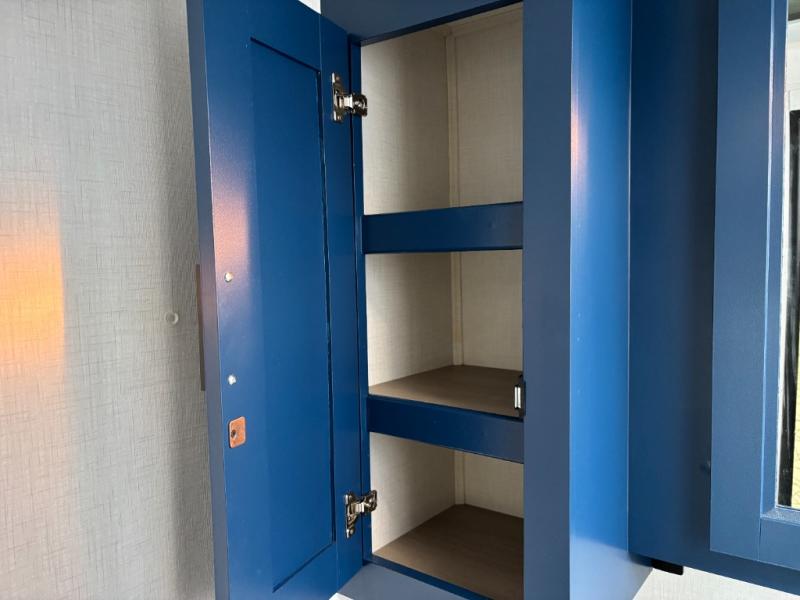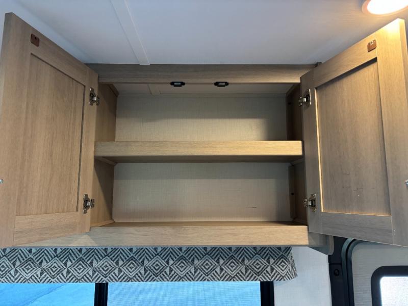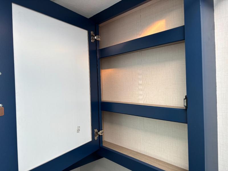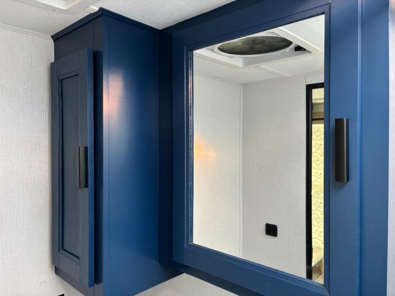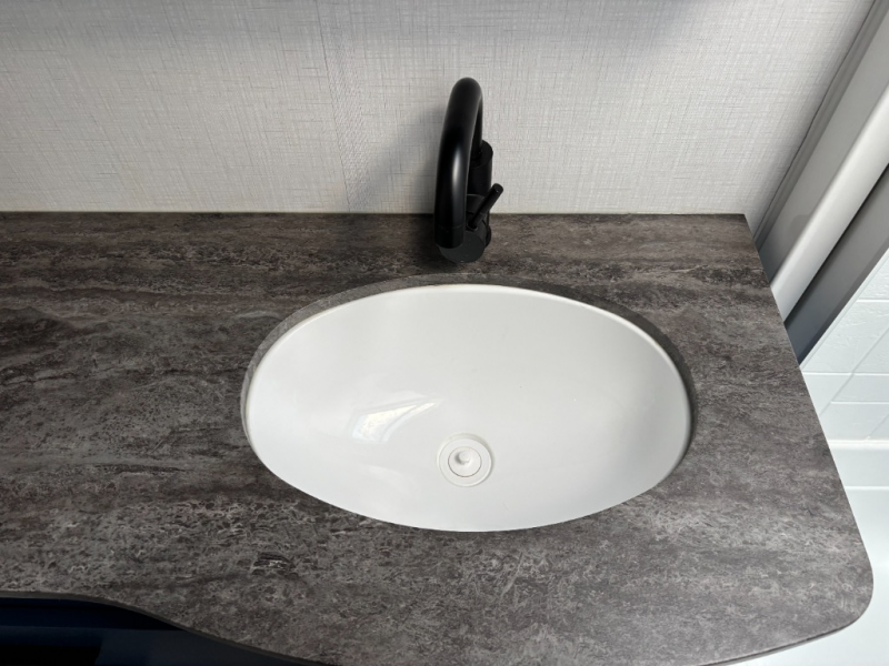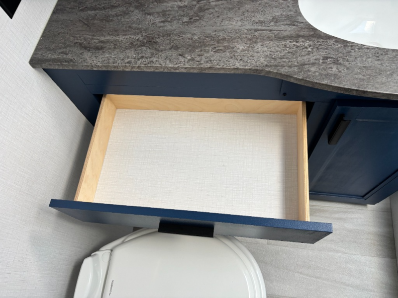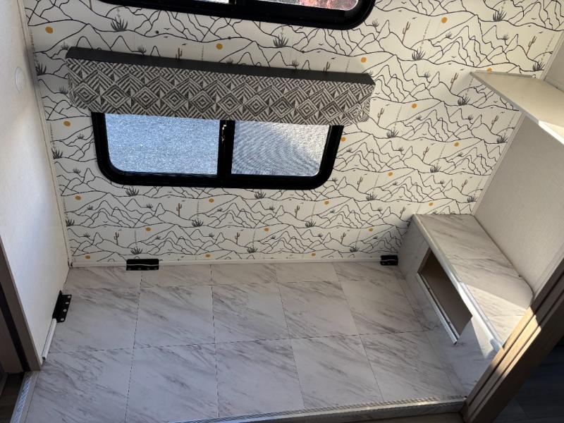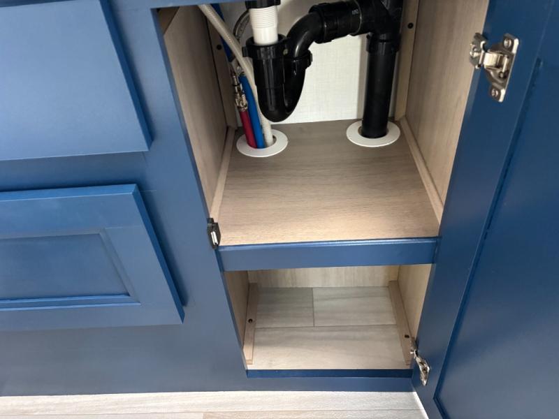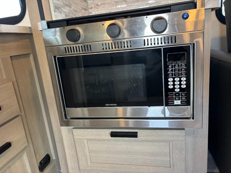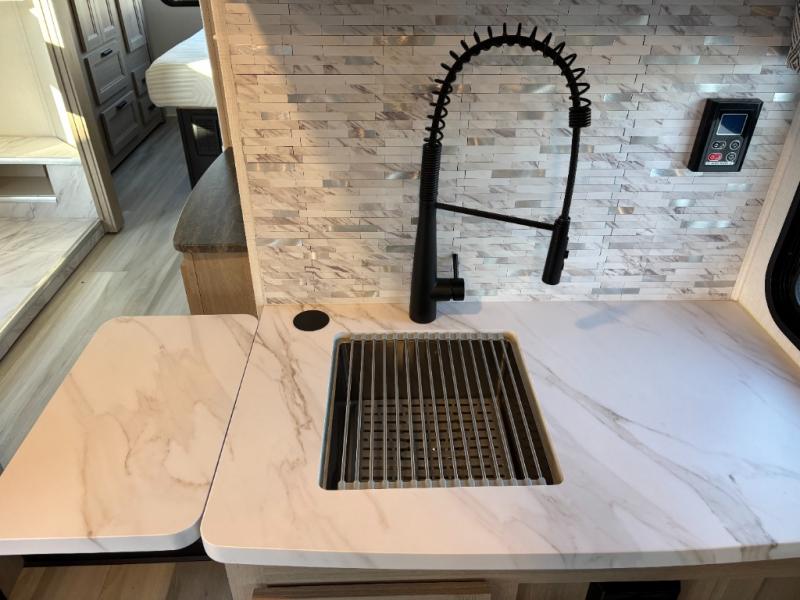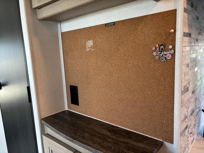 This family friendly coach allows the kids to have their own space either on the flip-down bunk above the kid's sofa sleeper that is across from the full bathroom or on the cab-over bunk. You will have the rear bedroom all to yourselves with a queen bed and a large wardrobe for your things. Everyone can visit while relaxing on the sofa and booth dinette while watching the LED TV or even while sitting under the 11' power awning outside when you add your camping chairs. The kitchen offers a corner area to make meals with a convection microwave and recessed three-burner range, plus a round sink and flip-up counter extension, and you can store cold items in the 10.7 cu. ft. 12V refrigerator near the entry, and the soft touch self-closing drawer guides and cordless 12V charging plate are features you will love.