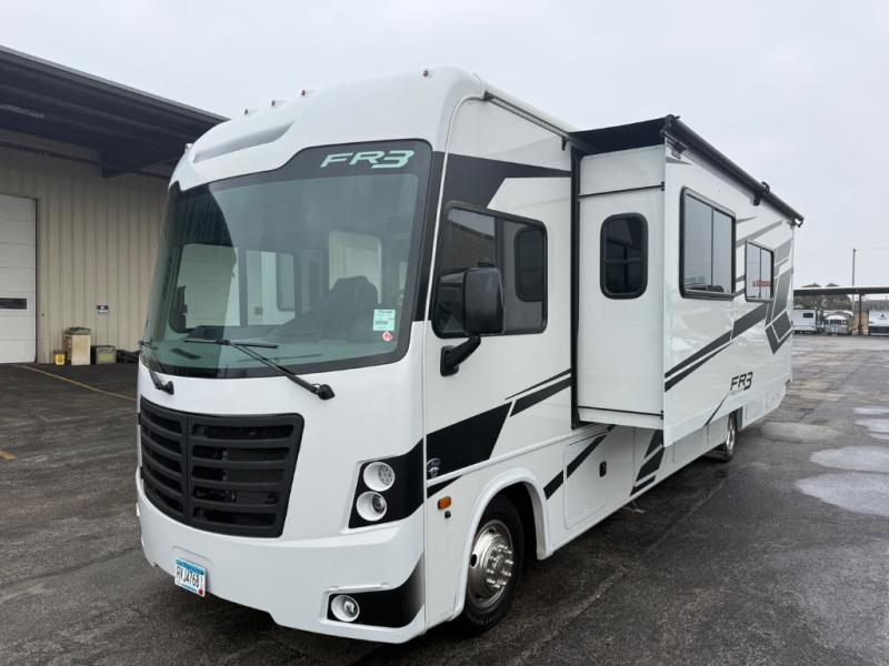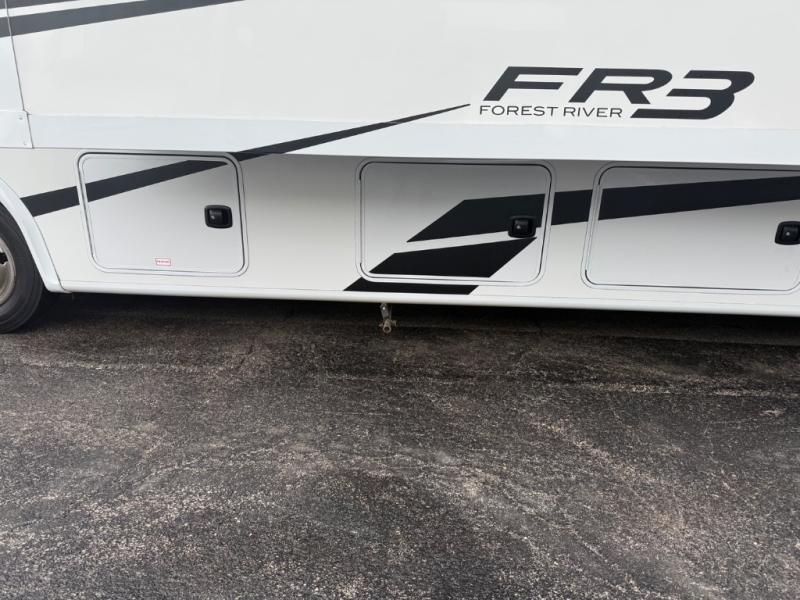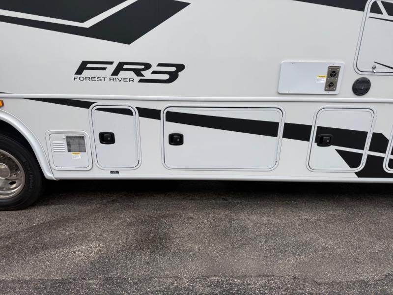 With each FR3 Class A gas motorhome by Forest River, you will find an easy-to-drive coach with a spacious interior allowing you to gather with friends and family with convenience and style found throughout! Each is built with vacuum-bonded construction, a one-piece fiberglass roof with extended rain spouts, a steel firewall and A-pillar extension, Bi-LED headlamps and lower LED fog lights, and grey Rotocast storage boxes with drains. Inside, you will enjoy black hardware, appliances, plumbing fixtures, and a glass shower door frame. You will also find a stainless steel kitchen sink with a bamboo cutting board and roll-up dryer, heavy-duty full-extension ball bearing drawer guides, dual-access dinette storage with doors, and nightstands with charging stations to keep your cellphones ready for whatever is next. Make your selection today!