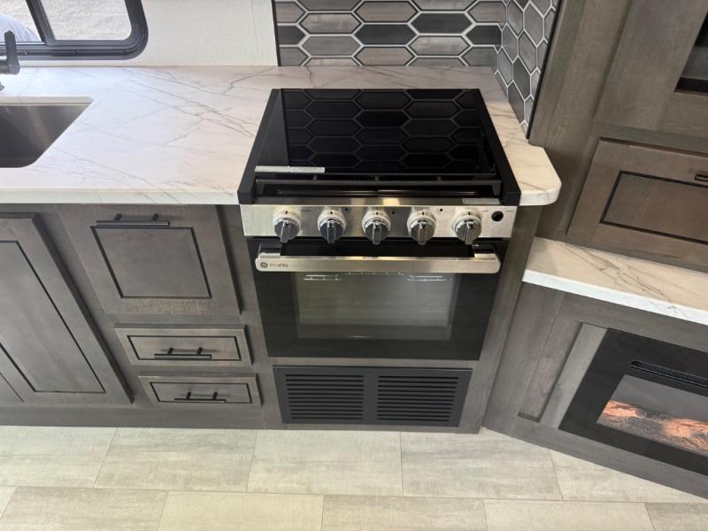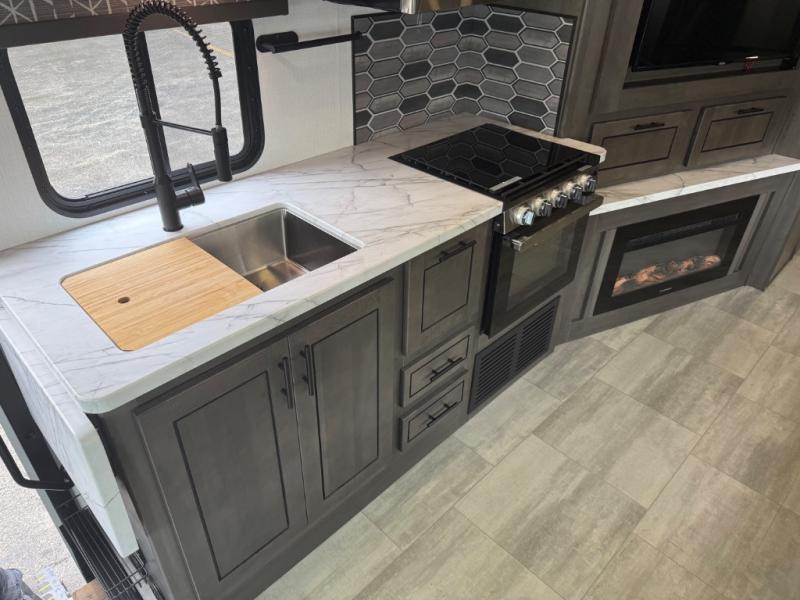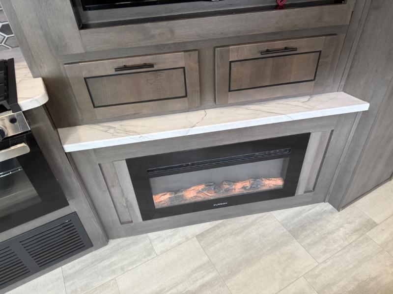Spacious and inviting for couples or families, this FR3 Class A gas motorhome offers convenience throughout including a half bath for the kids and guests and a full rear bathroom for the owners. This full bathroom is located within the rear master suite where you will also find a king-size bed for relaxing. Once at your destination, you can quickly set up the power awning to relax outside while watching the exterior TV and visiting with other RVers. You might have decided to add the washer and dryer option in the bedroom, so a load of laundry might even get done. Once you are ready to fill your tummy, the full kitchen offers everything you need plus a residential microwave. You might even decide to relax on one of the theater seats after dinner as you watch the big game on the 40" LED 12V TV with a fireplace below.