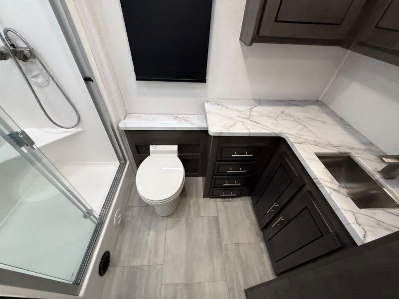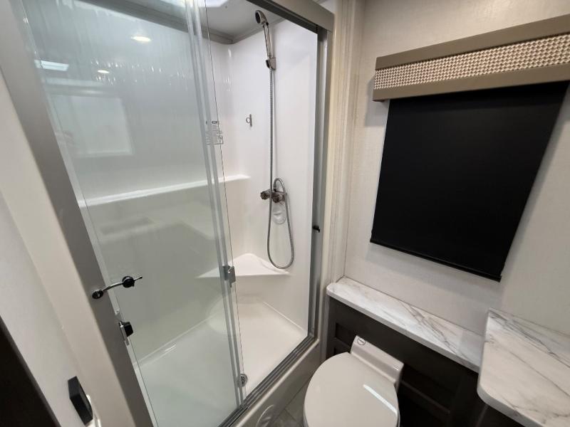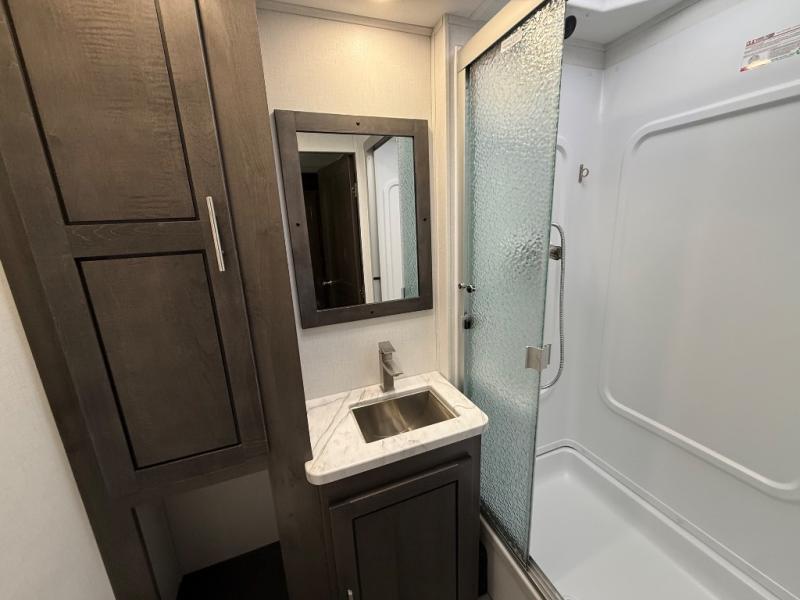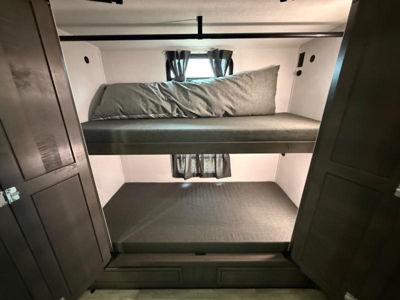 You won't have to search far for comfort in this spacious coach for seven to eight! The little ones will love having bunk beds to sleep on, plus there is a full bath right across the hall for convenience. The master bedroom with a king bed slide out will have you feeling right at home, and the second full bath includes ample counter space to set out your necessities. Everyone can meet in the main living area to relax on the hide-a-bed sofa, or you can choose the optional power theater seats if you don't need more sleeping space. You will surely never get bored with a 40" LED TV in the living room, 32" LED TV in the bedroom, plus a 40" LED TV outdoors with a radio and exterior speakers!