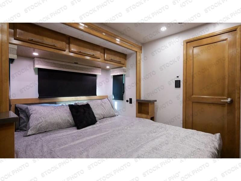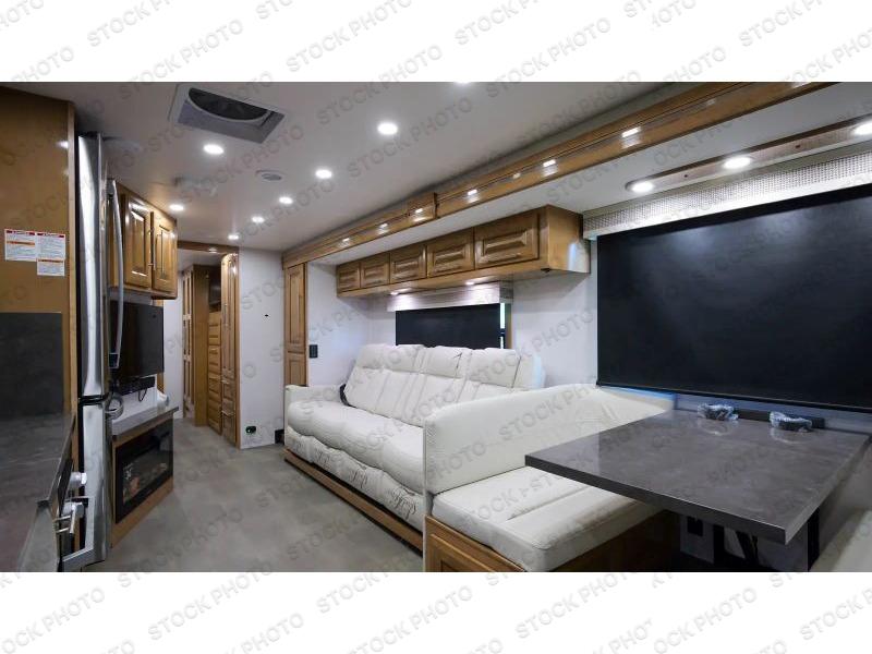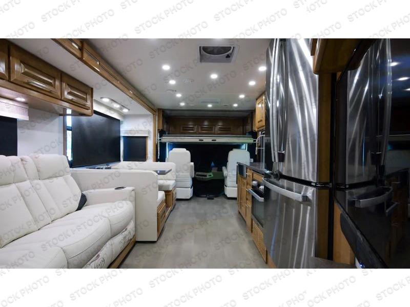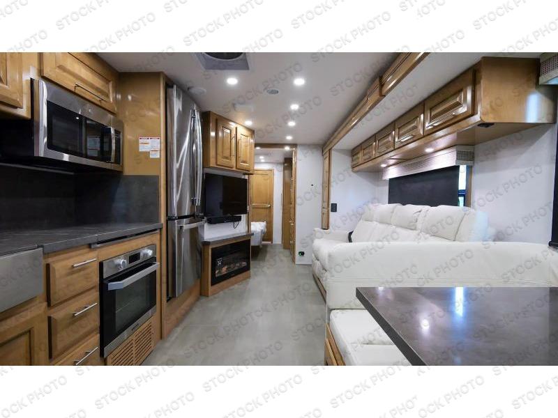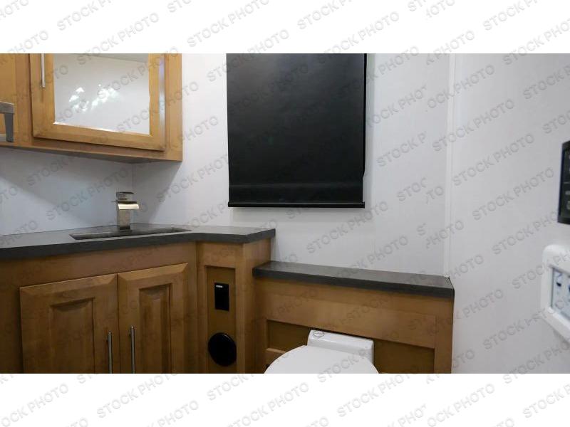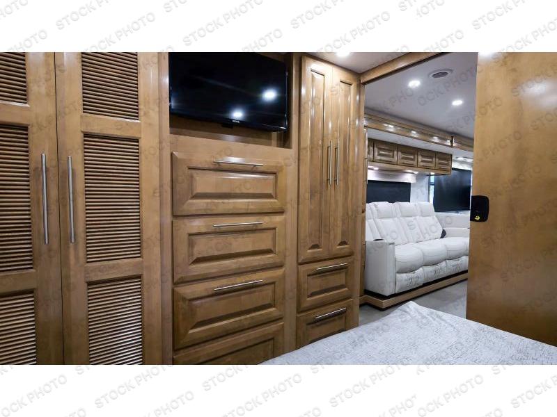 Comfort and convenience is found all throughout this motorhome! Starting with the full rear master bath that has a shower with a seat and a dual sink vanity, plus it leads into the private bedroom. Inside the bedroom is a 72" x 80" Power Tilt king bed slide with overhead cabinets across from a dresser with overhead cabinets and a 32" LED TV, a wardrobe, and another wardrobe that is prepped to add an optional stackable washer and dryer. The half bathroom is conveniently near the fully equipped kitchen so you can get back to creating your best home cooked meals fast. Relax in true comfort each night by either playing games at the booth dinette or on the theater seating that comes with power recline, heat, and massage!
