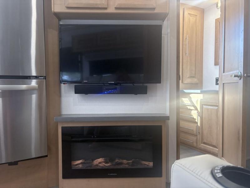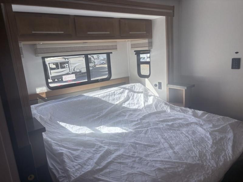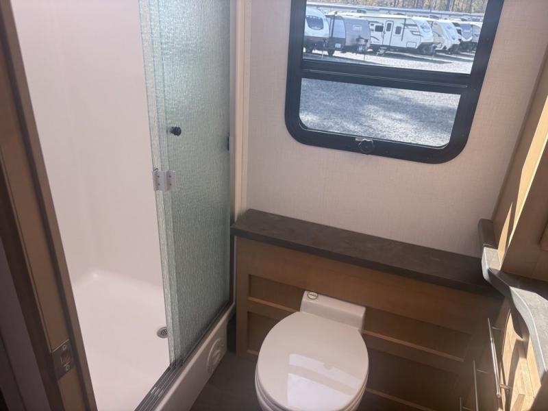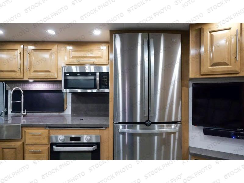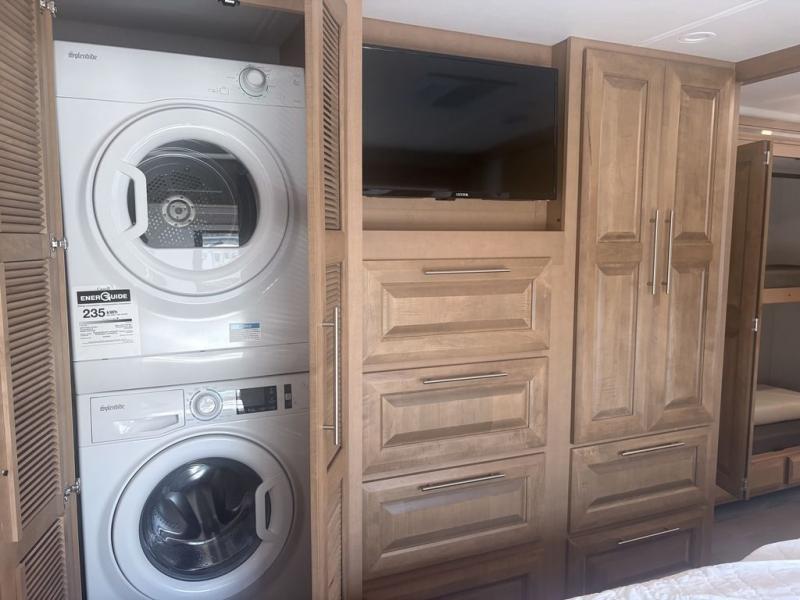 It's a clean decision to take this motorhome on all of your adventures with two full bathrooms! The full rear bathroom has a shower with a seat and creates a master suite with the bedroom which has a 72" x 80" Power Tilt king bed slide across from a dresser with a 32" LED TV and wardrobes on either side of it with one of them with washer and dryer prep. The set of bunk beds are conveniently across from the second full bathroom which will come in handy at night and keep things running smoothly in the mornings with a shower. Prepare your best home cooked meals with the three burner cooktop and enjoy them at the booth dinette then relax on the theater seating!